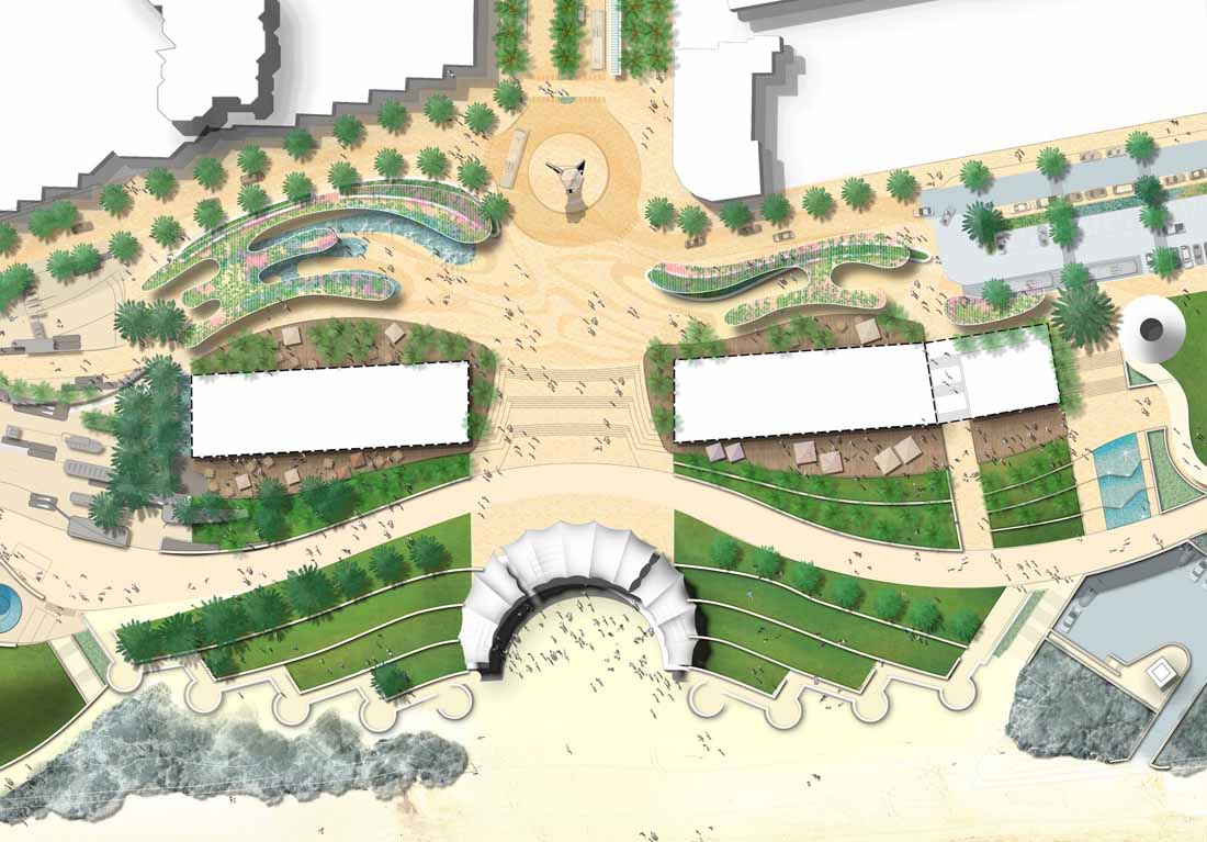 海滨前岸的设计引入了两个主要的步行长廊,完善了交通流线并为场地提供了新的便利设施和市民游乐点。离海岸较远的长廊连接零售餐饮店、市民广场和新开发区,而靠近海岸的长廊则可以开展慢跑、骑行等活动。