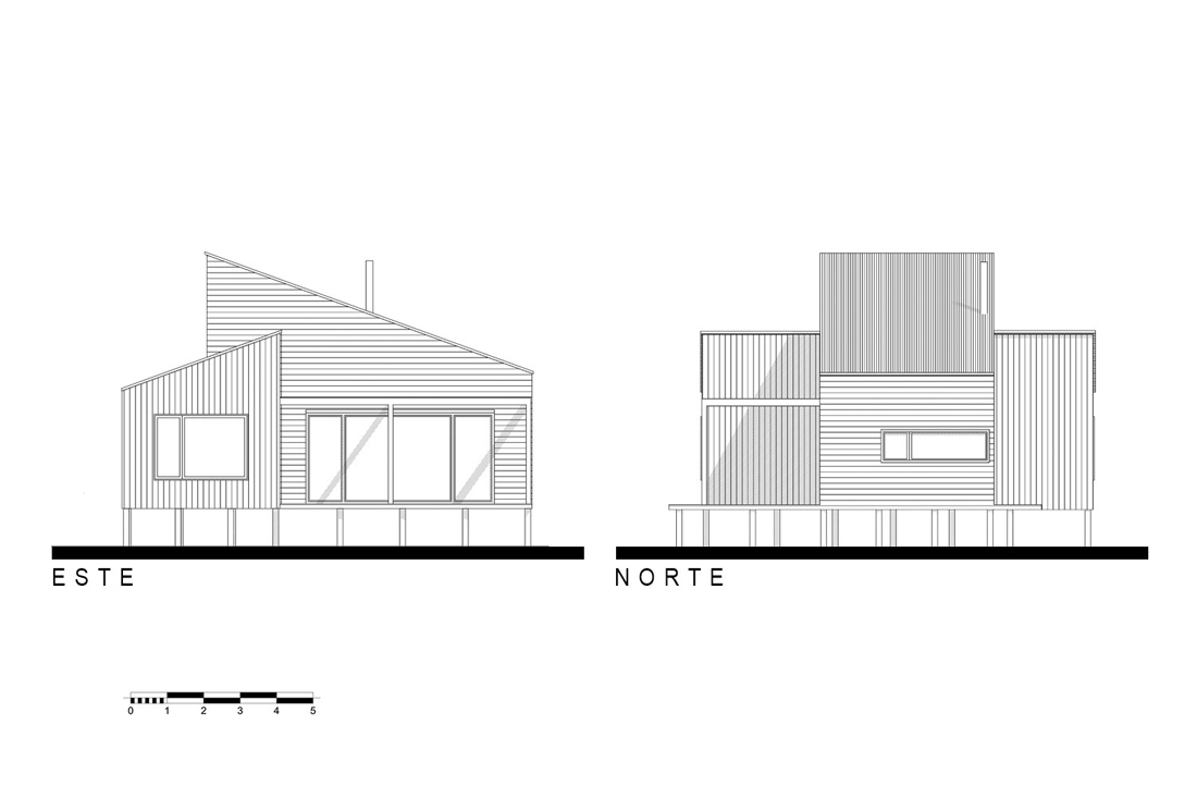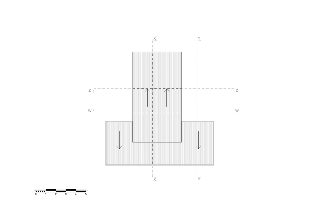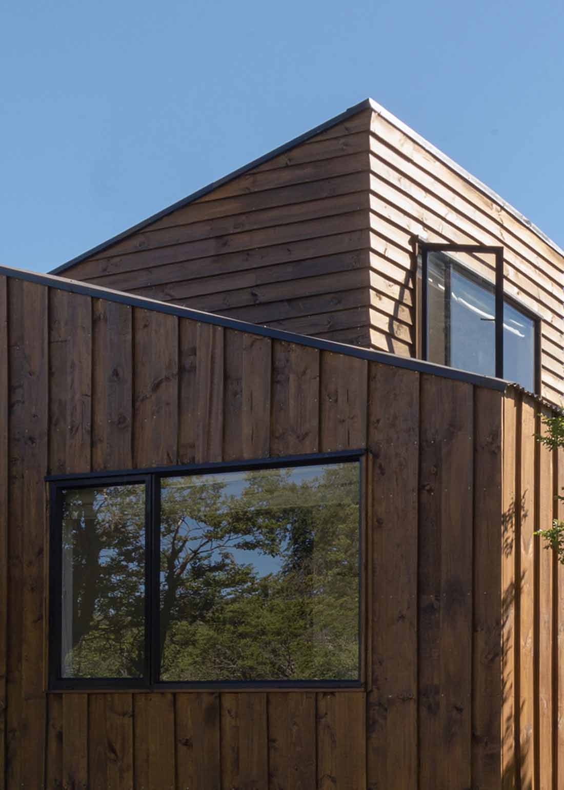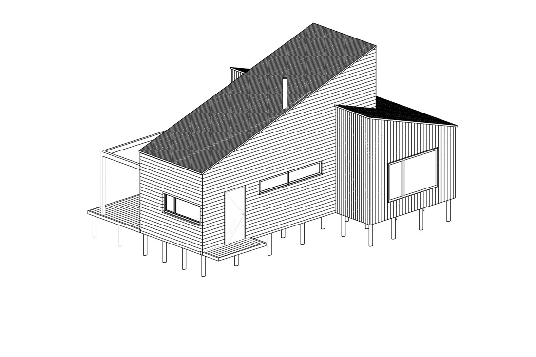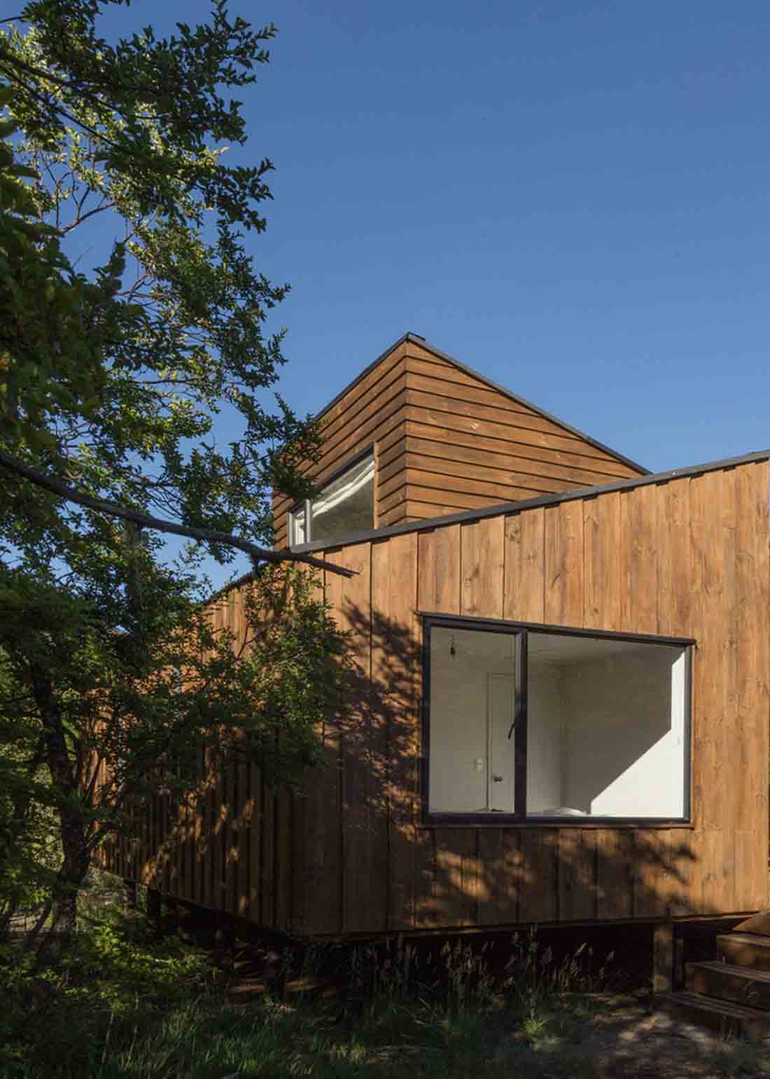 小屋位于一个蜿蜒的山脉森林中间,在模仿与矛盾之间发挥作用。天然材料紧挨着围绕它的同一根树干,尽管形状的高度和轮廓的交织重申了其明显的当代建筑风格;其中一个体积高于另一个体积,其主要和上部对角线延伸相交,两者之间水平和垂直晶格之间的细微差异,这是精心设计的顺序。
