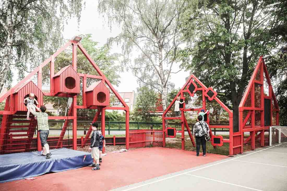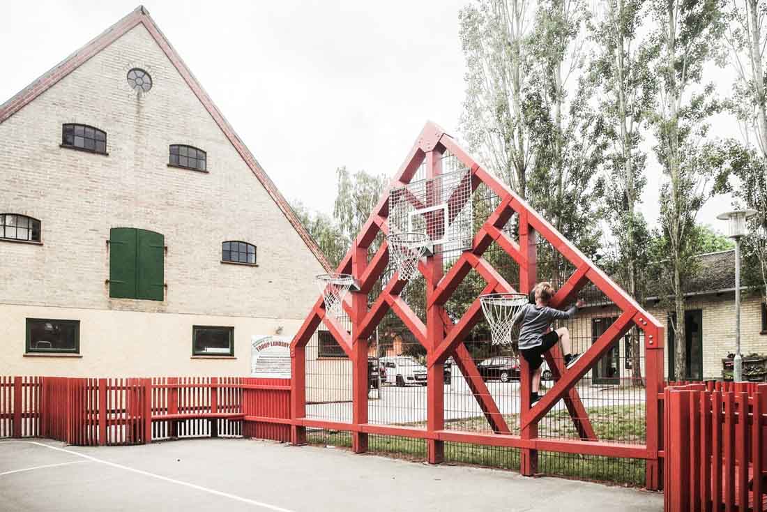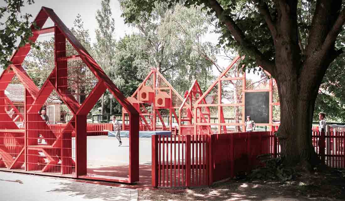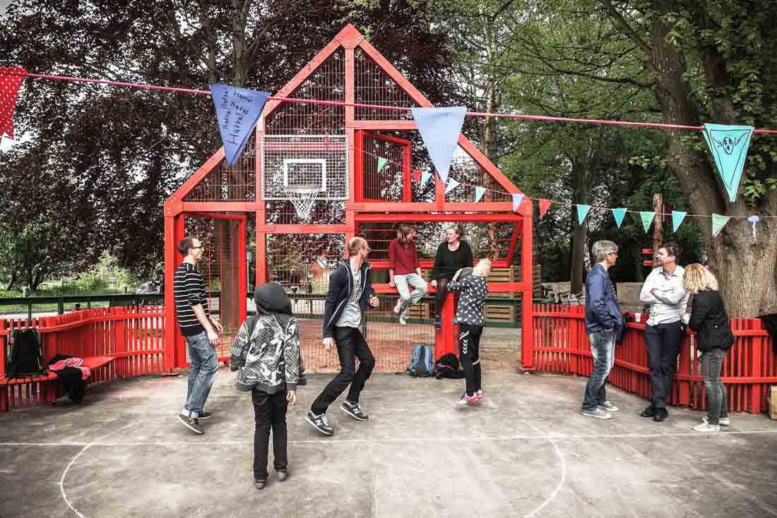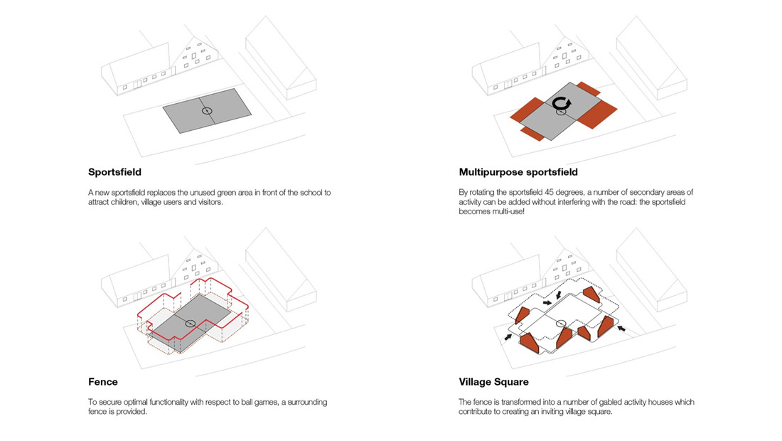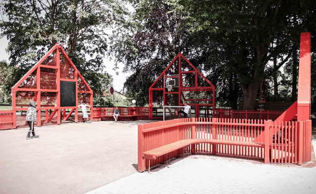 学校前面的停车场已经变成了一个公共空间,它由一个多功能的运动场所包围,活动设施的形状像极了令人乡村生活中充满家乡气息的山墙房子。 可以作为内外两边长凳的山墙房屋由一个连续的围栏连接起来,可挡住打出的球,并在校园内创建了一个村落。