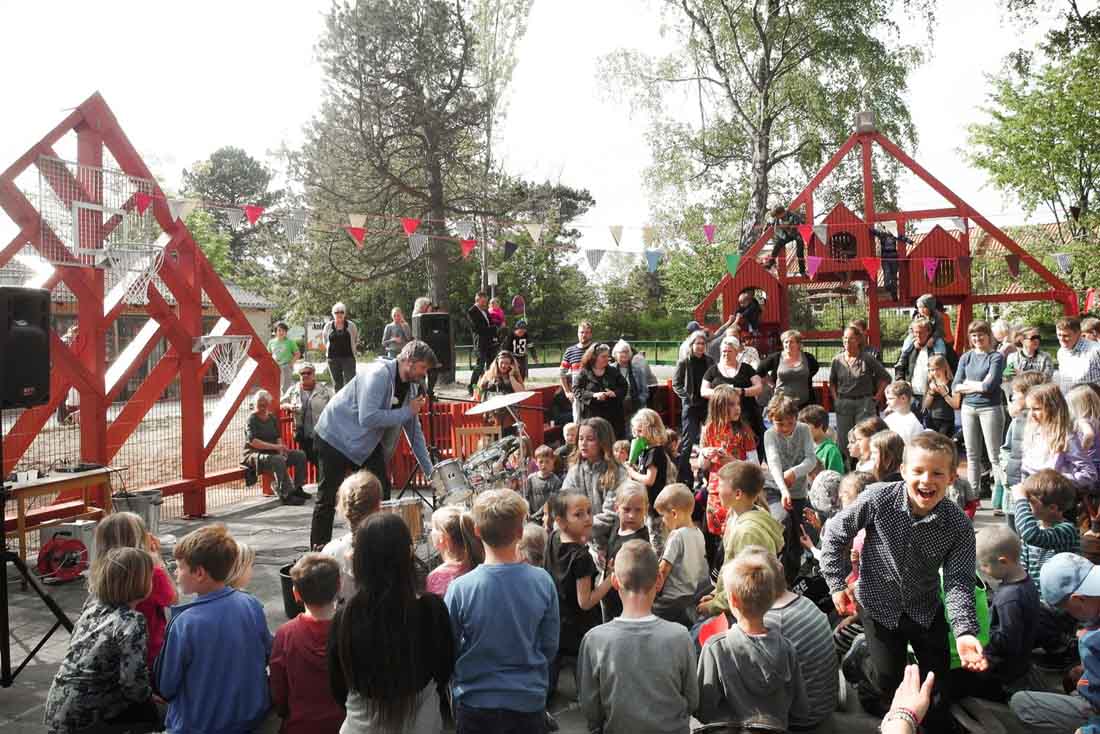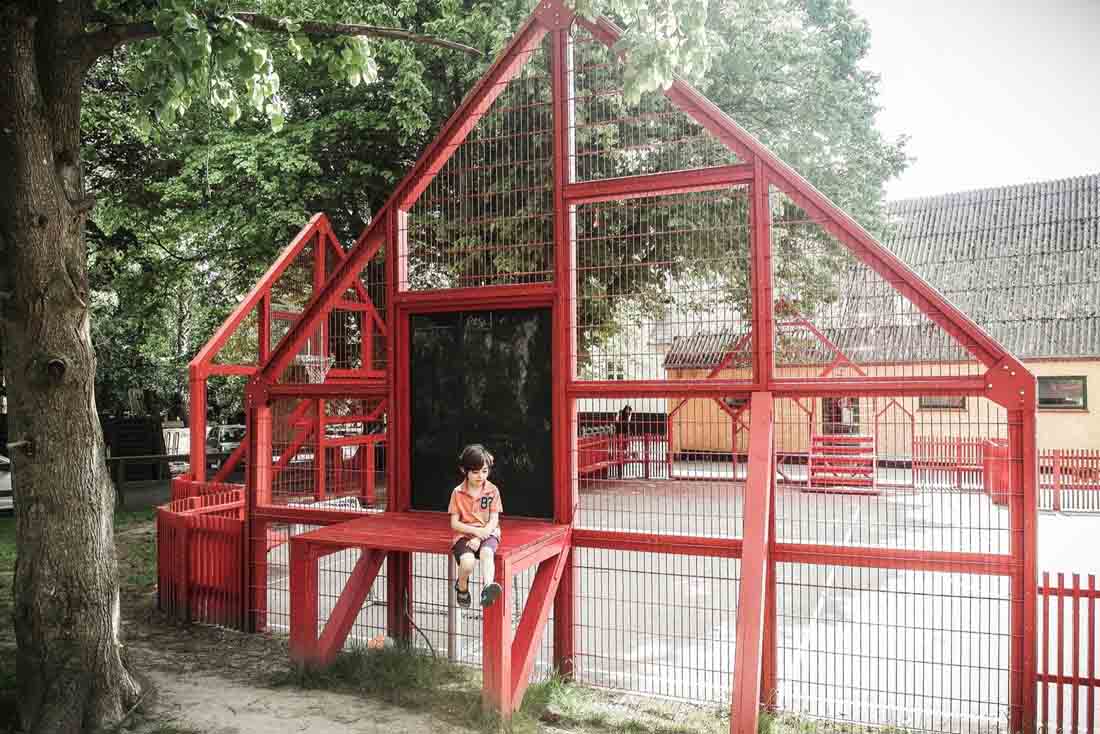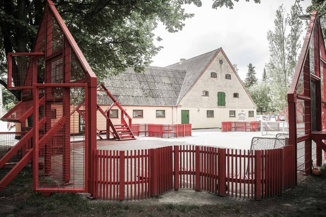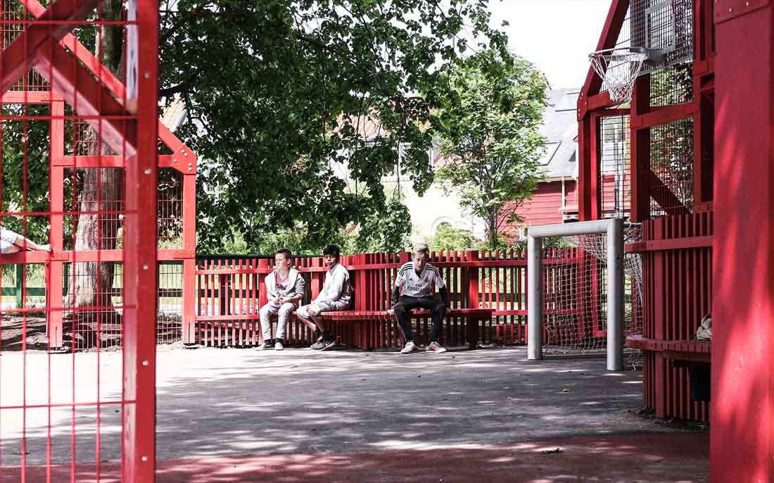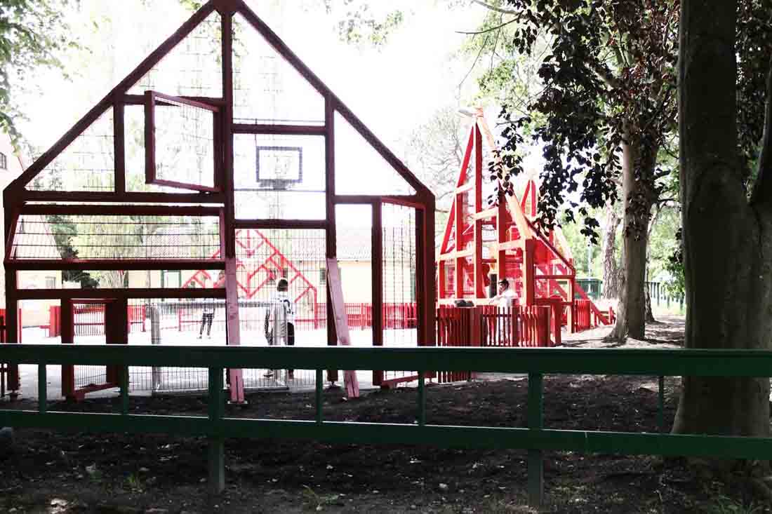 学校前面的停车场已经变成了一个公共空间,它由一个多功能的运动场所包围,活动设施的形状像极了令人乡村生活中充满家乡气息的山墙房子。 可以作为内外两边长凳的山墙房屋由一个连续的围栏连接起来,可挡住打出的球,并在校园内创建了一个村落。
