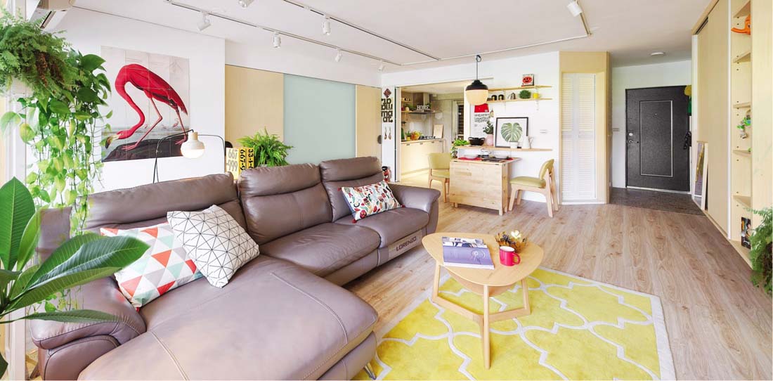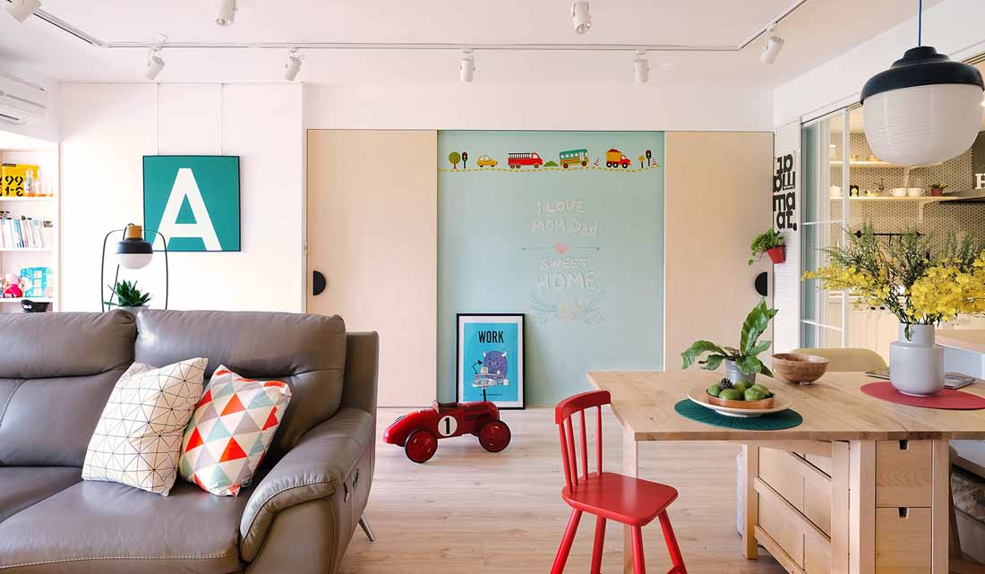 整体以温润浅木质色为主调,清新的薄荷绿黑板墙座落在客厅主墙中,让孩子可以在此肆意的挥洒创意。整个空间运用「大量的减法及少量的加法」,不做过多的固定装饰,以机能舒适为主要考量,透过活动家具的搭配,更能因应未来生活中的变动性。