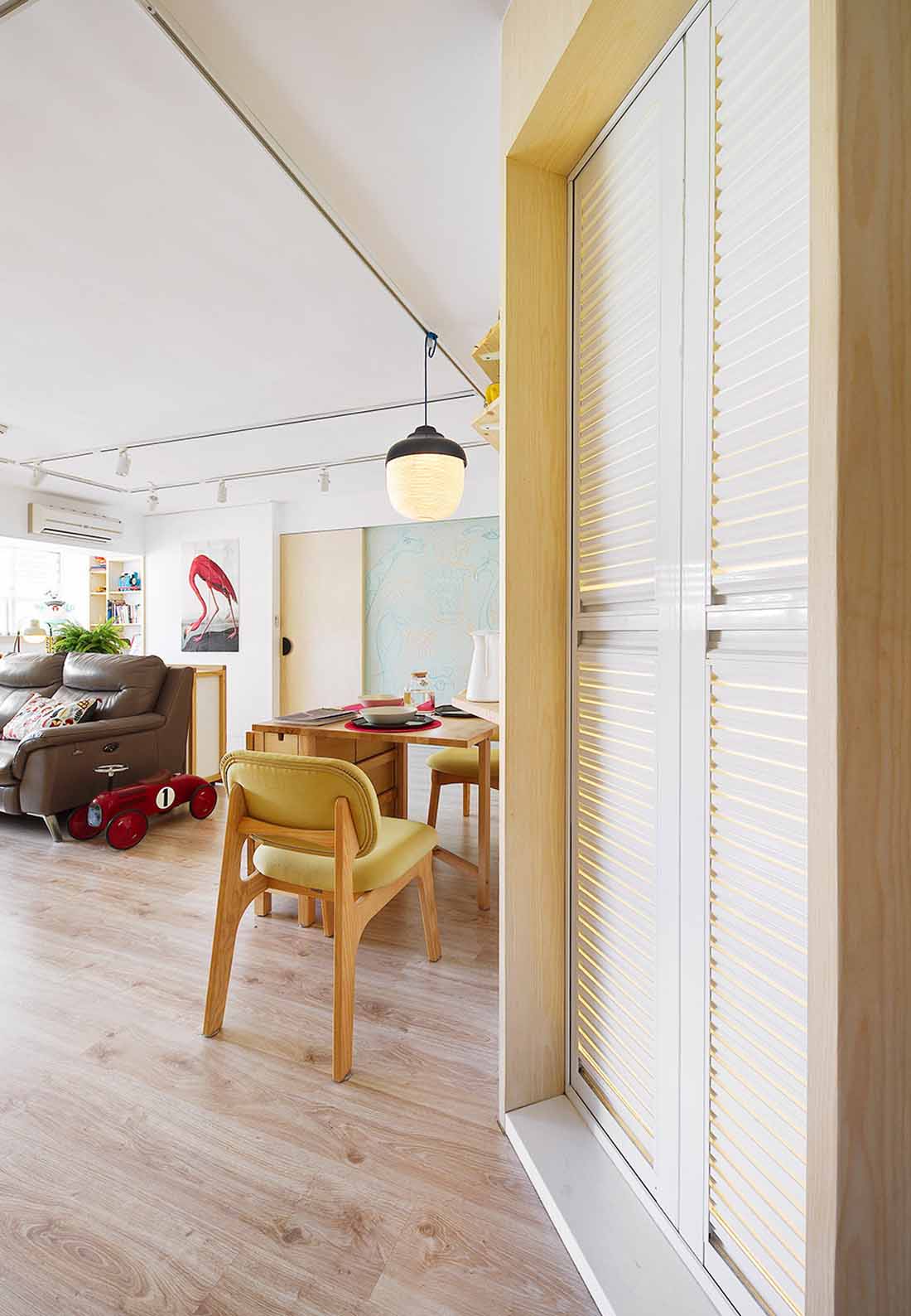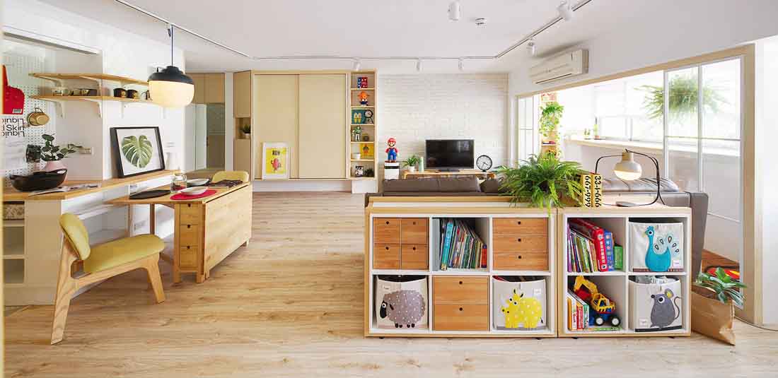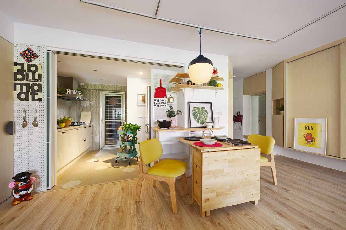 原先屋况的缺点—室内格局不佳、采光昏暗、炉灶外移在阳台造成晒衣油烟困扰、空间狭隘无法尽情舒展等等。设计师因此将书房开通,纳为公共区域之一,不仅扩大客餐厅的使用范围,创造双倍开阔的环境,连延的窗户不仅让视野明亮了,心情也跟着开阔了;妈妈平时最爱与孩子一同在这玩乐休憩,朋友来也夸赞像是到了咖啡厅一样地放松舒适。