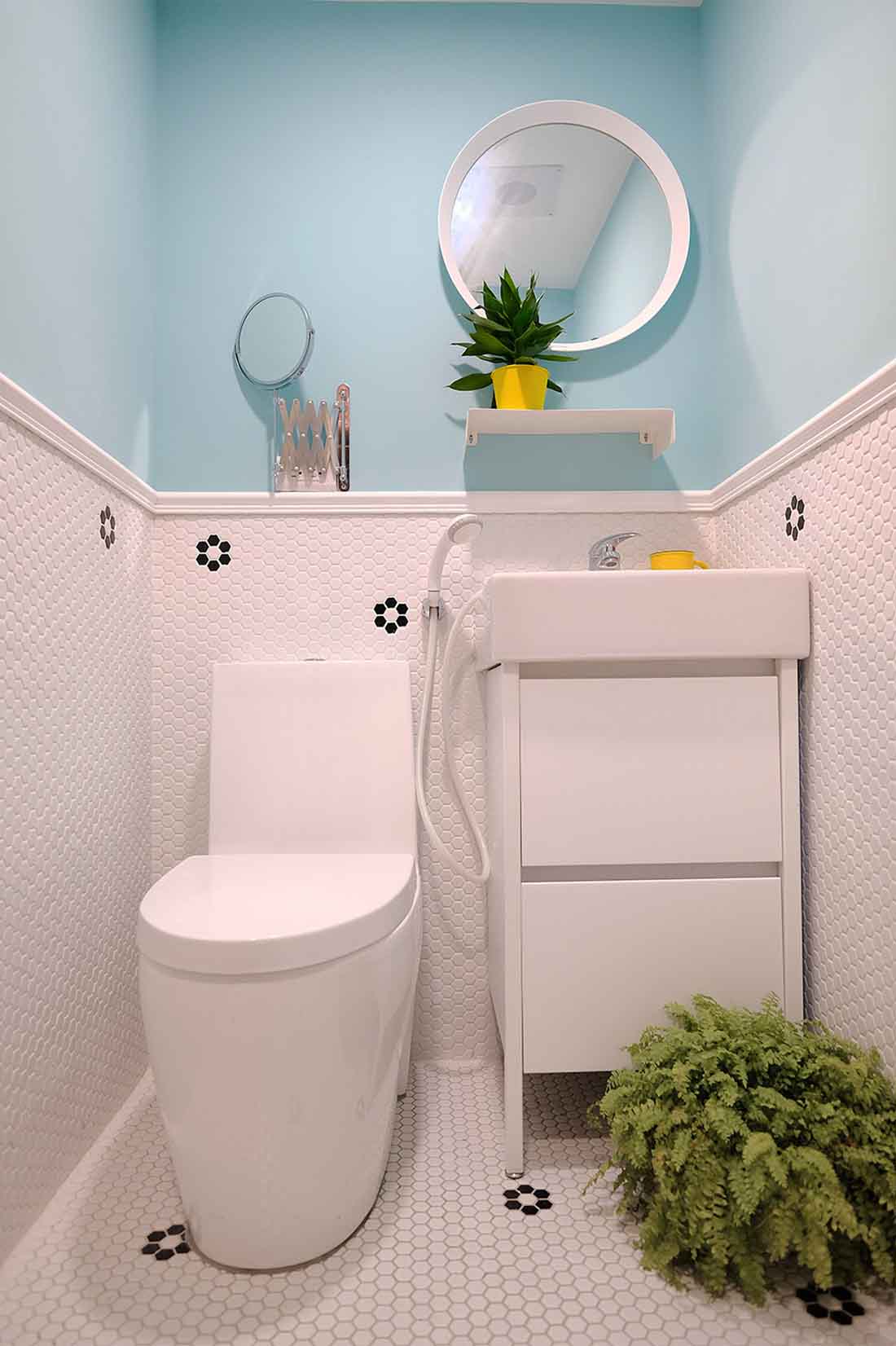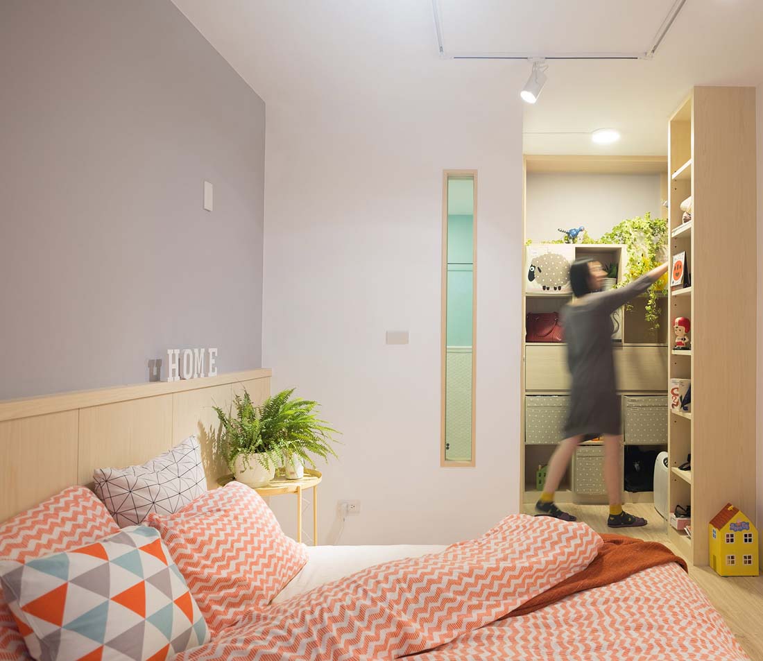 客浴巧妙地将开口改方位并以斜切角处理,一来让行走动线顺畅,二来也避开马桶正对厨房的问题,并以柠檬黄与马赛克小花砖搭配,让狭小卫浴显得明亮有朝气。主卧利用原本的柱体形成独立更衣区,主浴门也修正原先面对寝室的困扰;隔间墙往外推移60公分作为衣柜使用,也让睡眠空间更加宽阔舒适,不再是放进一张双人床就充满压迫感。