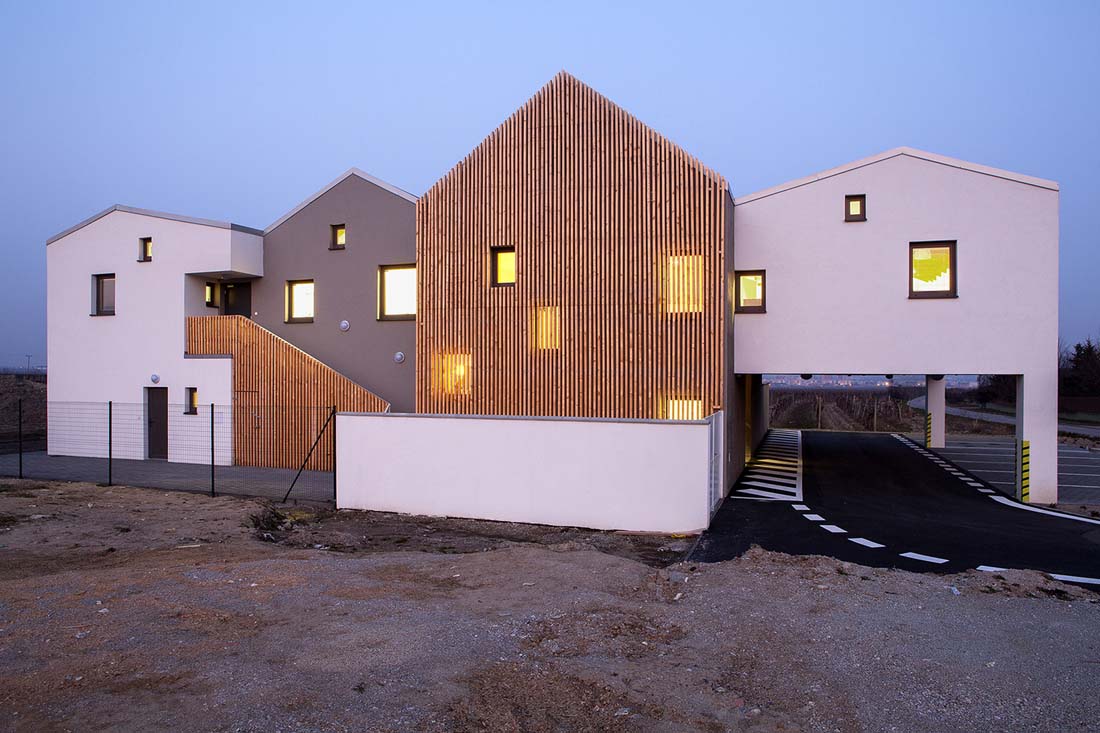 该项目位于斯洛伐克首都伯拉第斯拉瓦附近的一个葡萄庄园内,占地面积很小,这对设计师来说是一个极富挑战性的项目。在总共935㎡的用地范围内,建造满足40个小孩上课的教室、老师们的办公室和休息室、厨房、设备间、操场以及服务家长和员工的停车场。