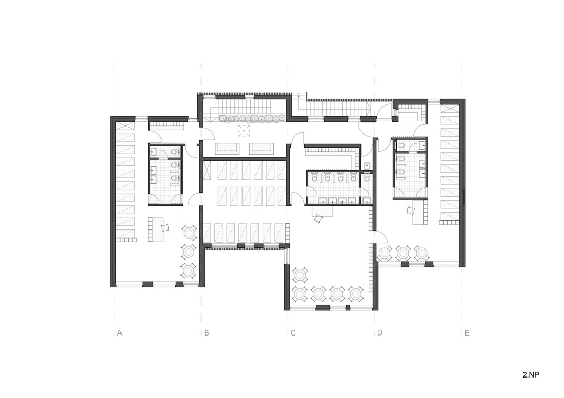 最终解决方案是把教室布置在二楼的末段。幼儿园分成三个部分,分别容纳10个3岁的小孩,20个4—5岁的孩子以及10个6岁的儿童。因为用地紧张,设计师把设备用房布置在楼梯上方的阁楼部分。