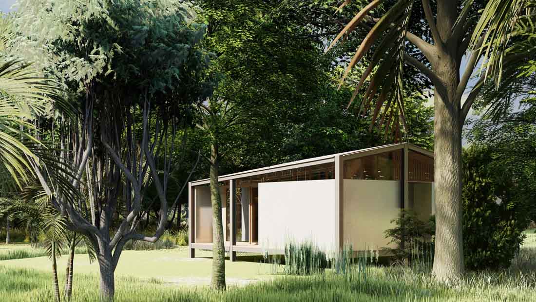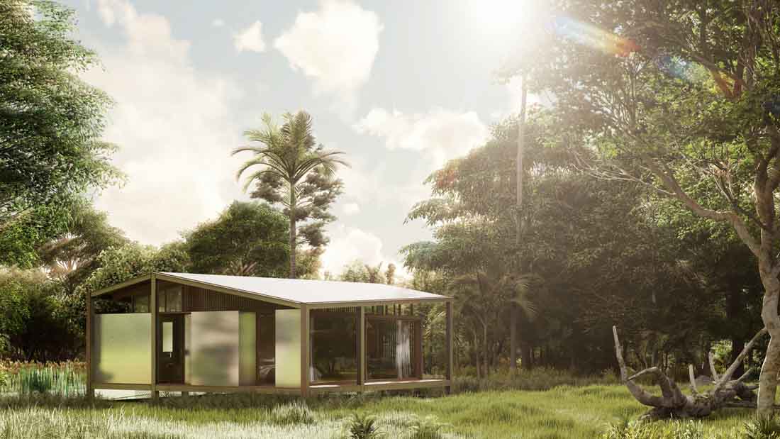 该设计包括一间卧室、套房浴室、开放式厨房和客厅,以及户外露台。为了减少出现的废料问题,利乐研发了由从包装纸盒中提取的25%塑料和铝制成的的聚乙烯屋面板。上面的铝层有助于确保100%防水材料。倾斜屋顶的设计可以将雨水通过设置的结构系统输送出去然后储存起来以便继续使用,包括浇灌周围的花园等。