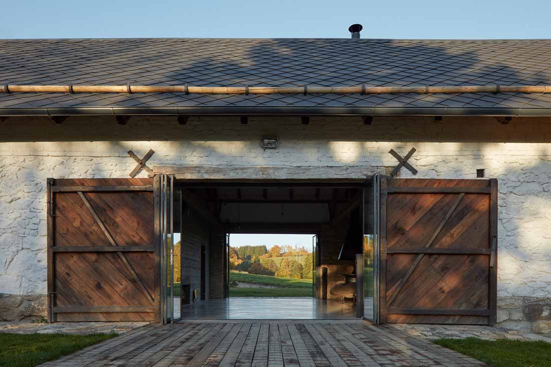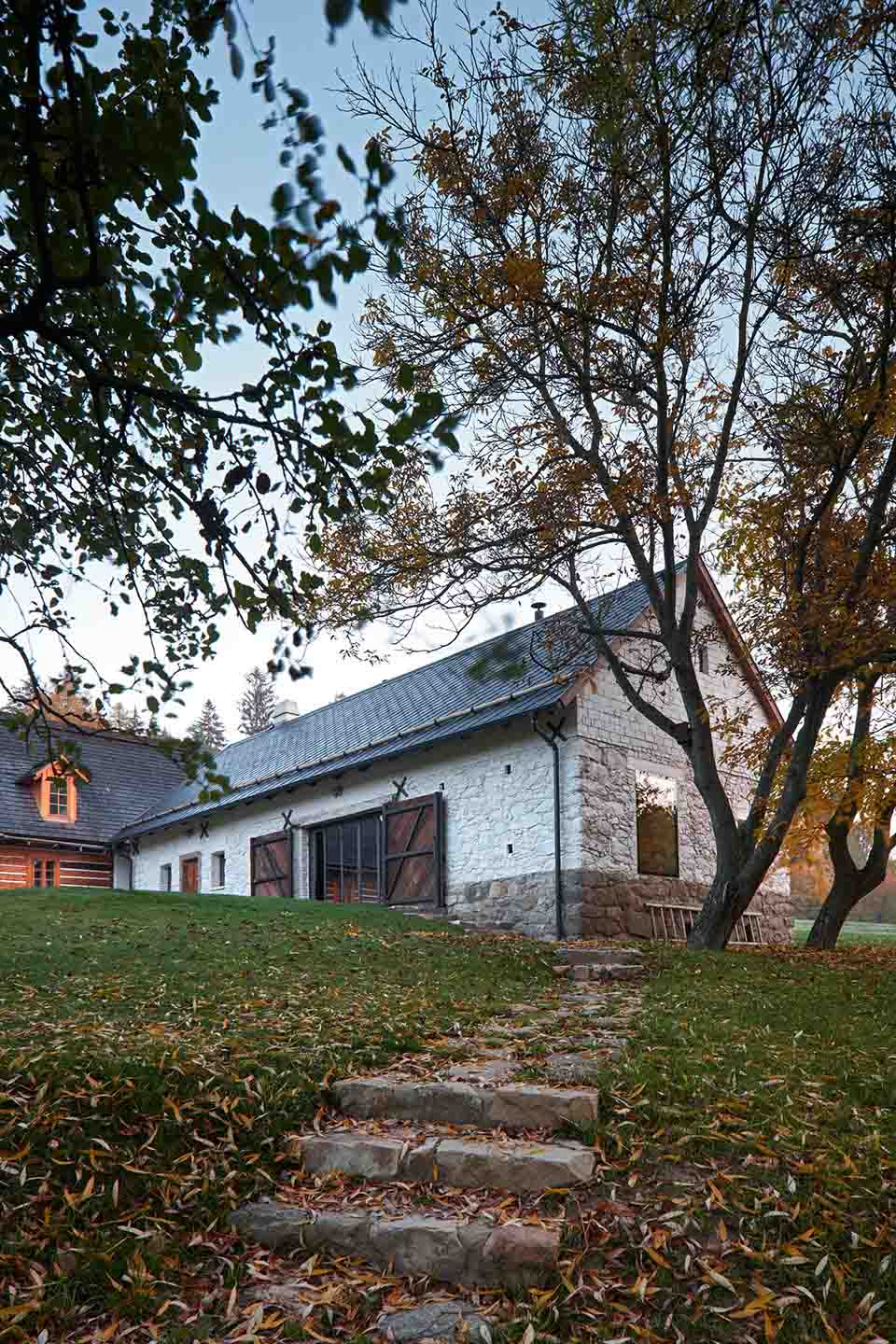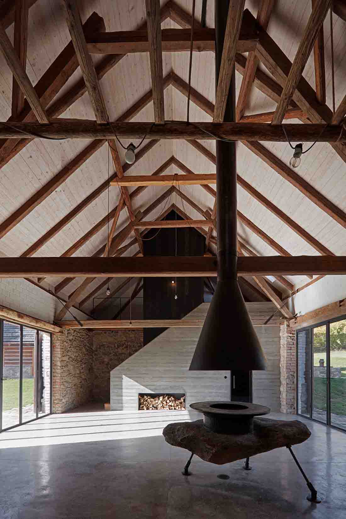 马厩为辅助用房,其中设有避暑客厅和客房,建筑师对其进行了较多介入,空间的整体氛围更为明亮开放。原本的石墙被混凝土墙面取代,其后藏有楼梯间和桑拿房。上方的室内墙面全部被涂成白色,以突显原本的木制屋架。主要的起居空间通过玻璃折叠门与室外露台相连,人们还可以通过一面巨大的固定窗欣赏草原上古老的树木。空间的核心是一个开放壁炉,由附近山中采到的巨大石块制成。
