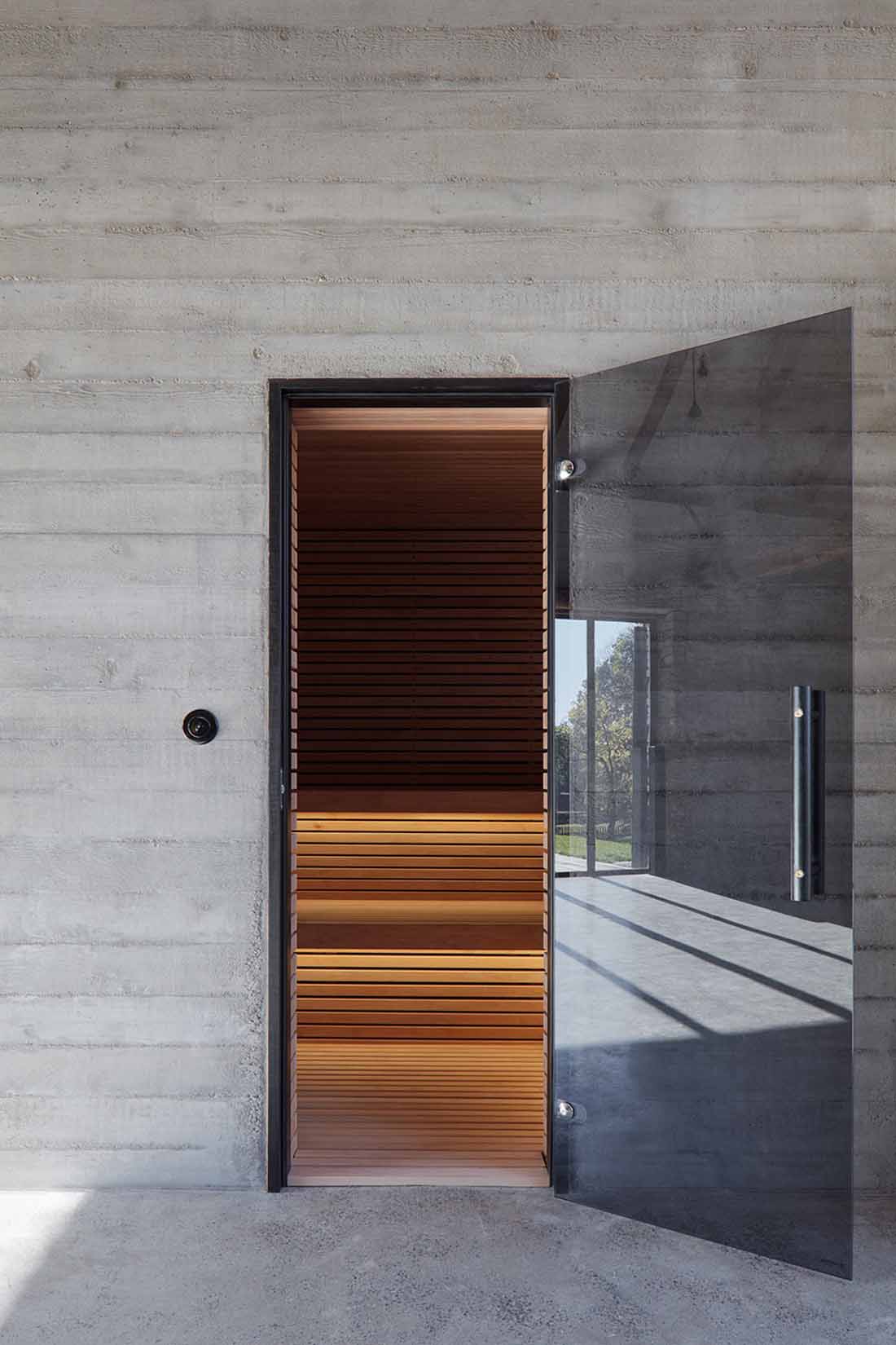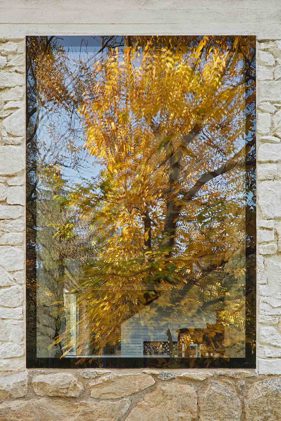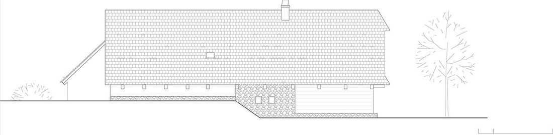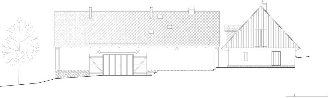 马厩为辅助用房,其中设有避暑客厅和客房,建筑师对其进行了较多介入,空间的整体氛围更为明亮开放。原本的石墙被混凝土墙面取代,其后藏有楼梯间和桑拿房。上方的室内墙面全部被涂成白色,以突显原本的木制屋架。主要的起居空间通过玻璃折叠门与室外露台相连,人们还可以通过一面巨大的固定窗欣赏草原上古老的树木。空间的核心是一个开放壁炉,由附近山中采到的巨大石块制成。