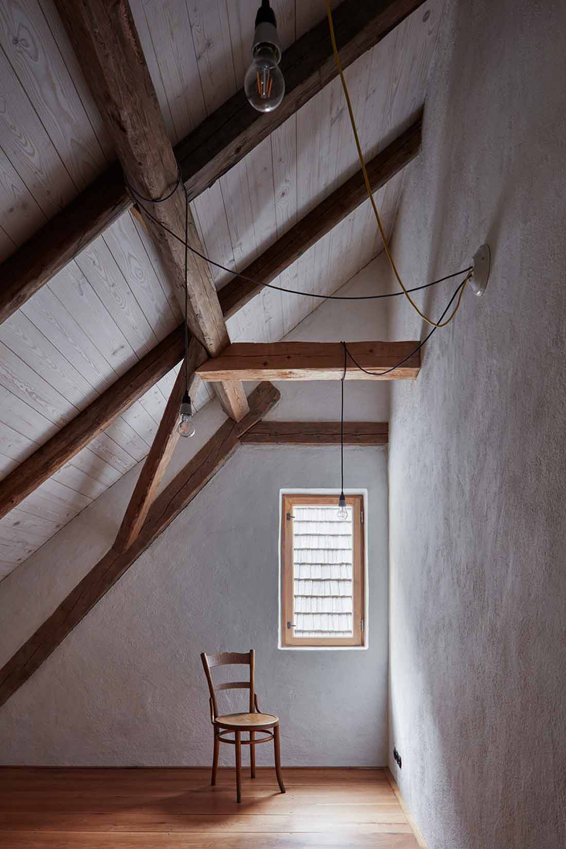 马厩和木屋有不同的特征和功能,建筑师在改造中充分体现了二者的差异性,这一思考贯穿了整个项目始终。业主的家庭居住在小木屋中,其内部更为传统。因为原本建筑条件太差,大部分空间都是重新建造的。粗糙的手工内饰使空间展现出了本地房屋昏暗、封闭而又亲密的特点。