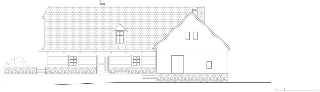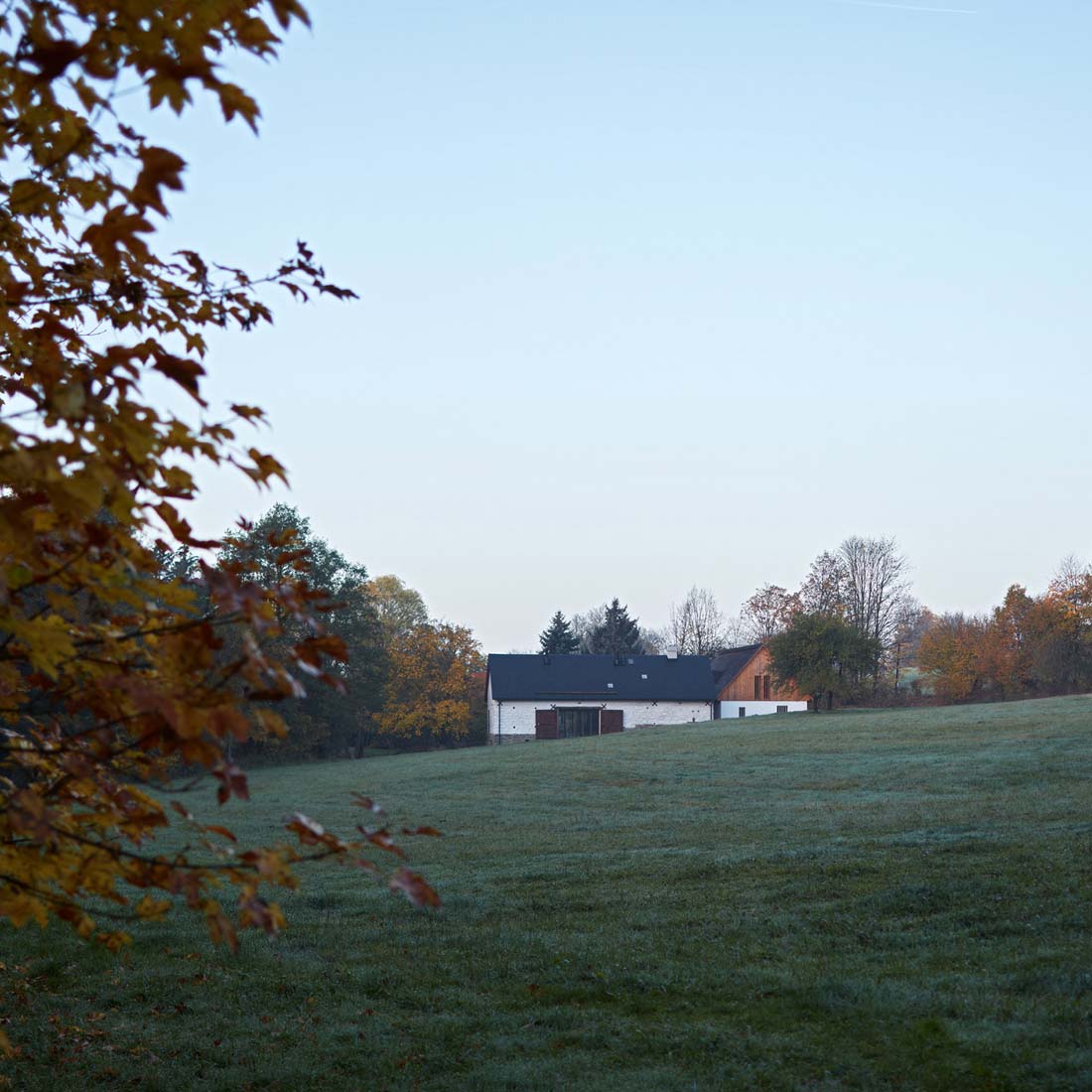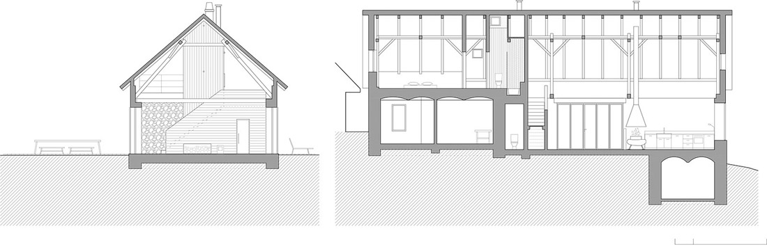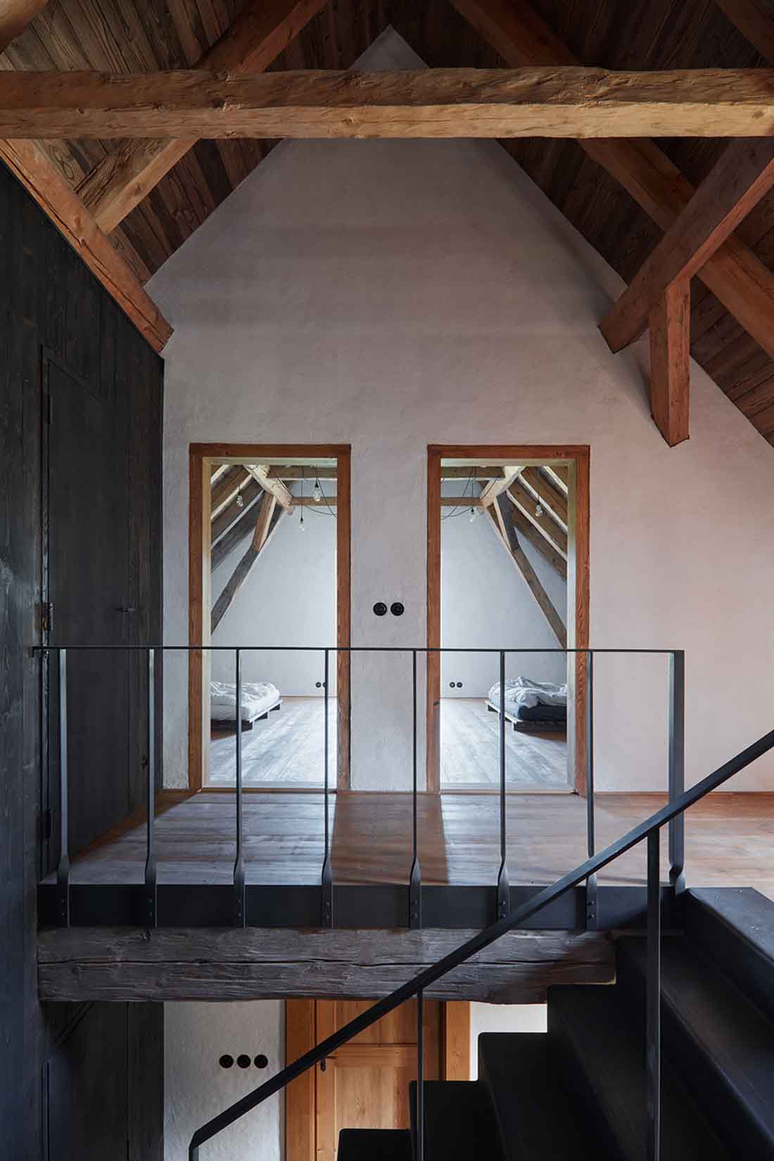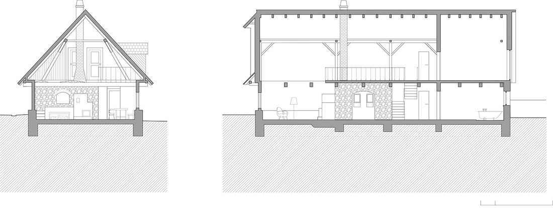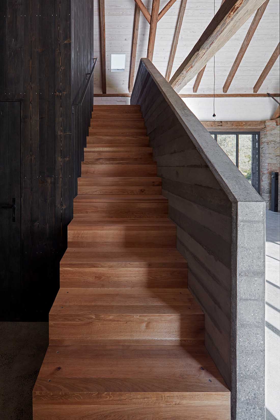 原本的宅地由一间小木屋和一个石头马厩组成,整体呈L形,自然舒展,与远方的牧场遥遥相望。为了保持这种平衡,建筑师决定尽量减少对建筑外观的改动,将改造主要集中在室内。每间房屋都设有一个直达屋顶的起居空间,可以突出展现二者的特点,如木屋中富有雕塑感的传统黑色厨房以及马厩门外优美的风景。此外,建筑师在两间房屋中分别增设了一个黑色“烟囱”,内设卫浴设施,其在马厩中占主导地位,而在木屋中则较为隐蔽。