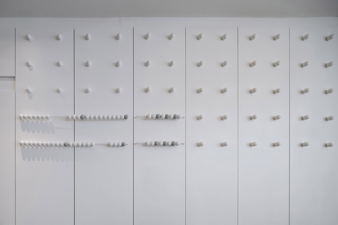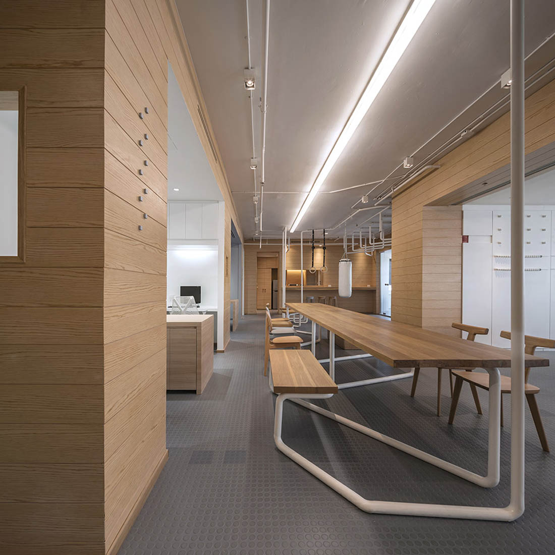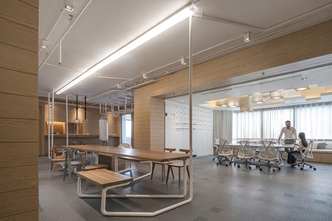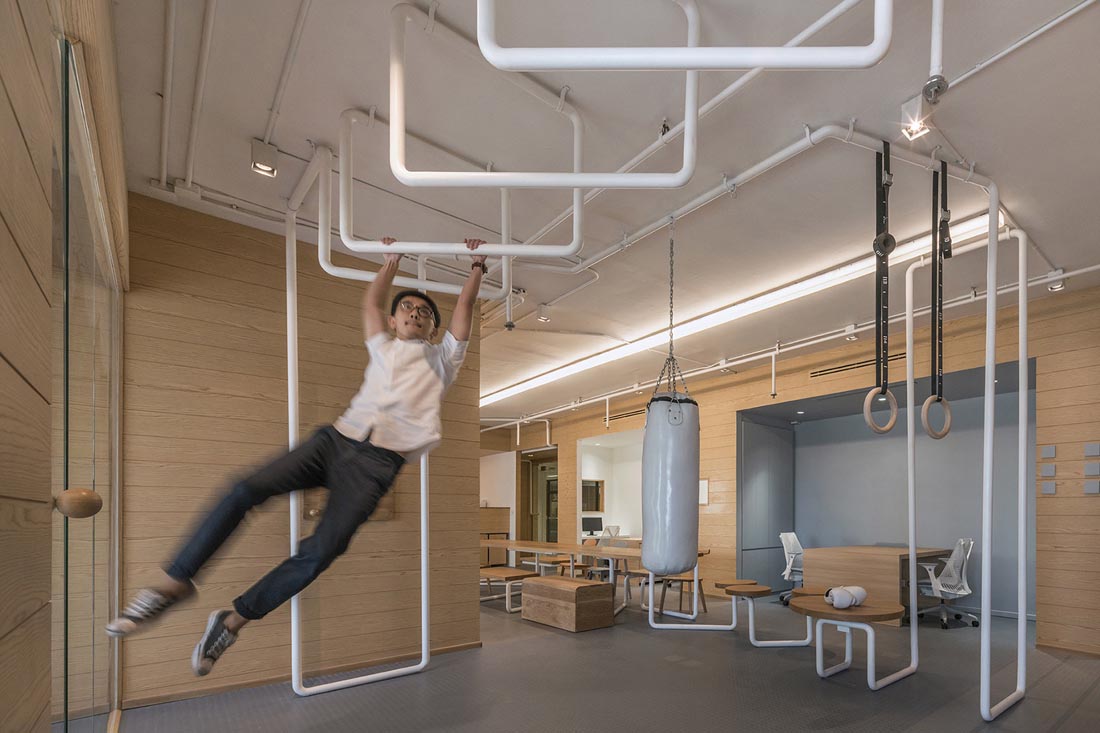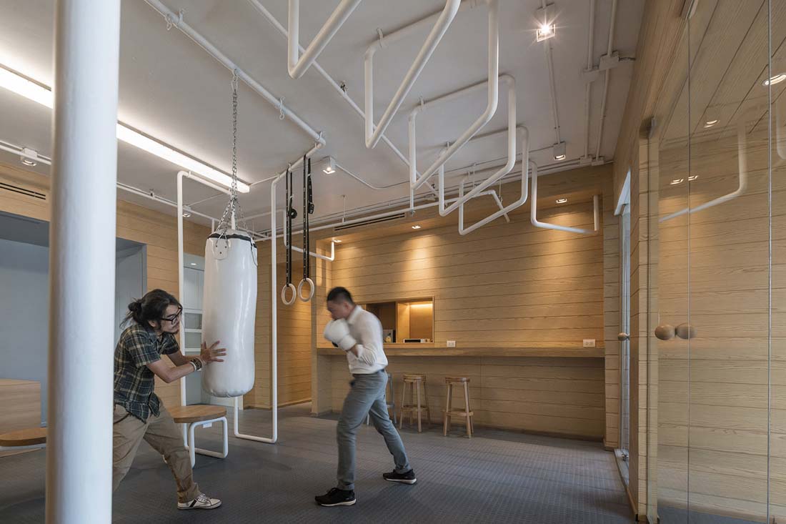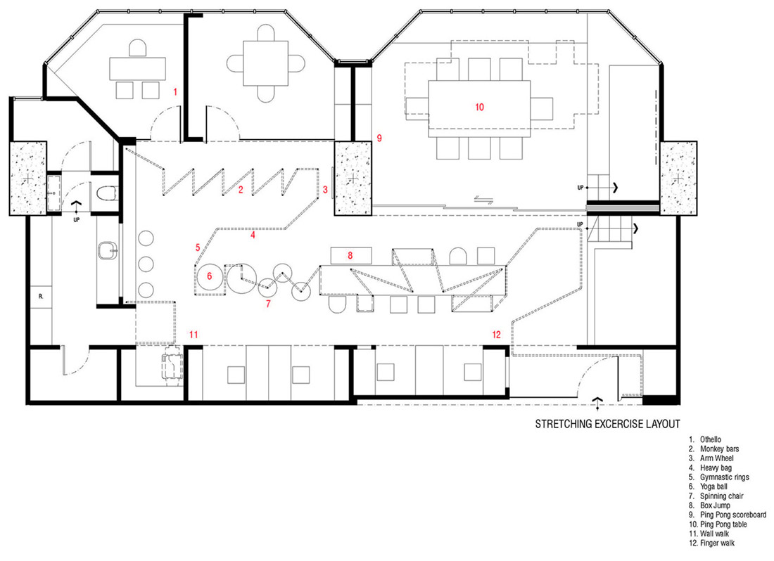 办公室的拉伸器械由Inteltion公司安排以从难到简的顺序排列,并分别被命名为“手指运动”,“手臂轮转”,“旋转椅”和最难的“单杠”运动。办公室空间的主要特征表现为一个连续的铁管。它以把手的形式出现在办公室入口,办公室中央的座椅和桌子结构,以及办公室后面的健身杆。设计师利用现存的水管和电管作为办公室天花板的的装饰,并将这些新旧不一的管道漆成白色。