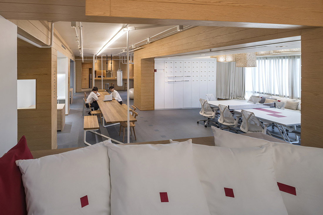 Inteltion办公室希望在办公室的任何地方,包括使用球形橱柜拉手来健身。这些把手被刻意设计在较高的地方以便促进员工的拉伸运动。会议桌可以随时转变成乒乓球台,而乒乓球就装饰在会议桌顶部的吊灯上。相邻墙壁的乒乓球装饰可以作为比赛的计分器。疲惫时,员工还可以在移动文件柜上的空间里小憩片刻,这个空间被装点成满是枕头的舒适氛围。