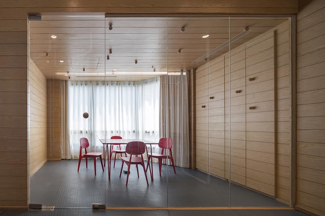 设计师需要考虑到办公室现存的种种问题。保持同一种姿态持续工作是非常不健康的,因此设计师建议将室内改造成有利于员工的环境。项目初始,设计师在曼谷观察了很多拉伸运动。对设计师来说,普通的拉伸运动比一些特制的运动器械更加受人青睐,而这些辅助的拉伸工具,需要尽可能简单并且有趣。