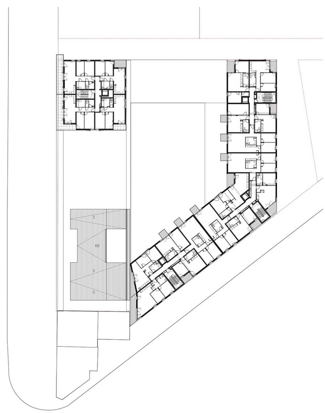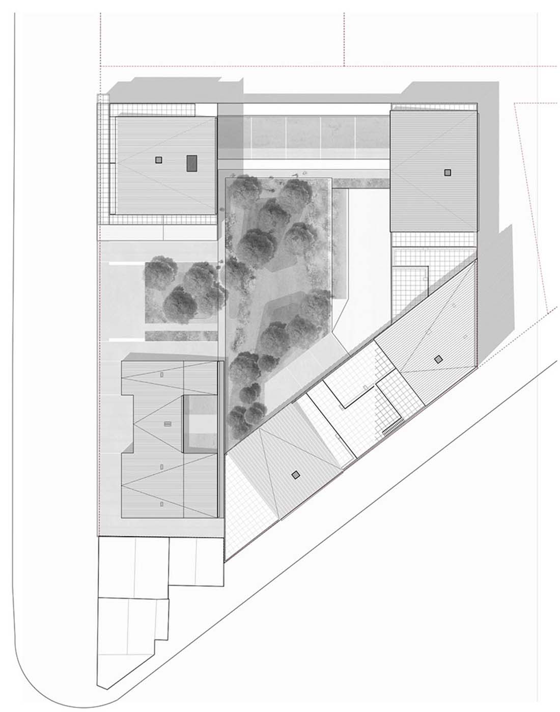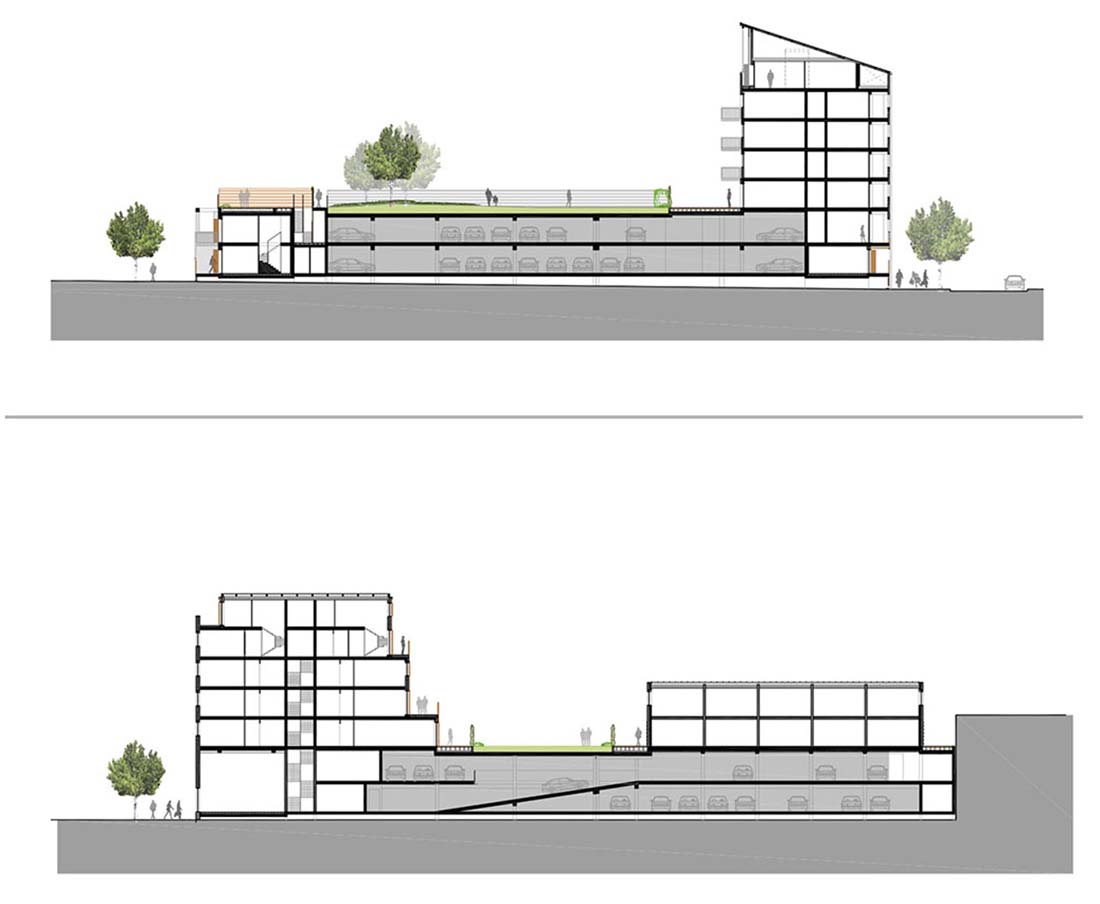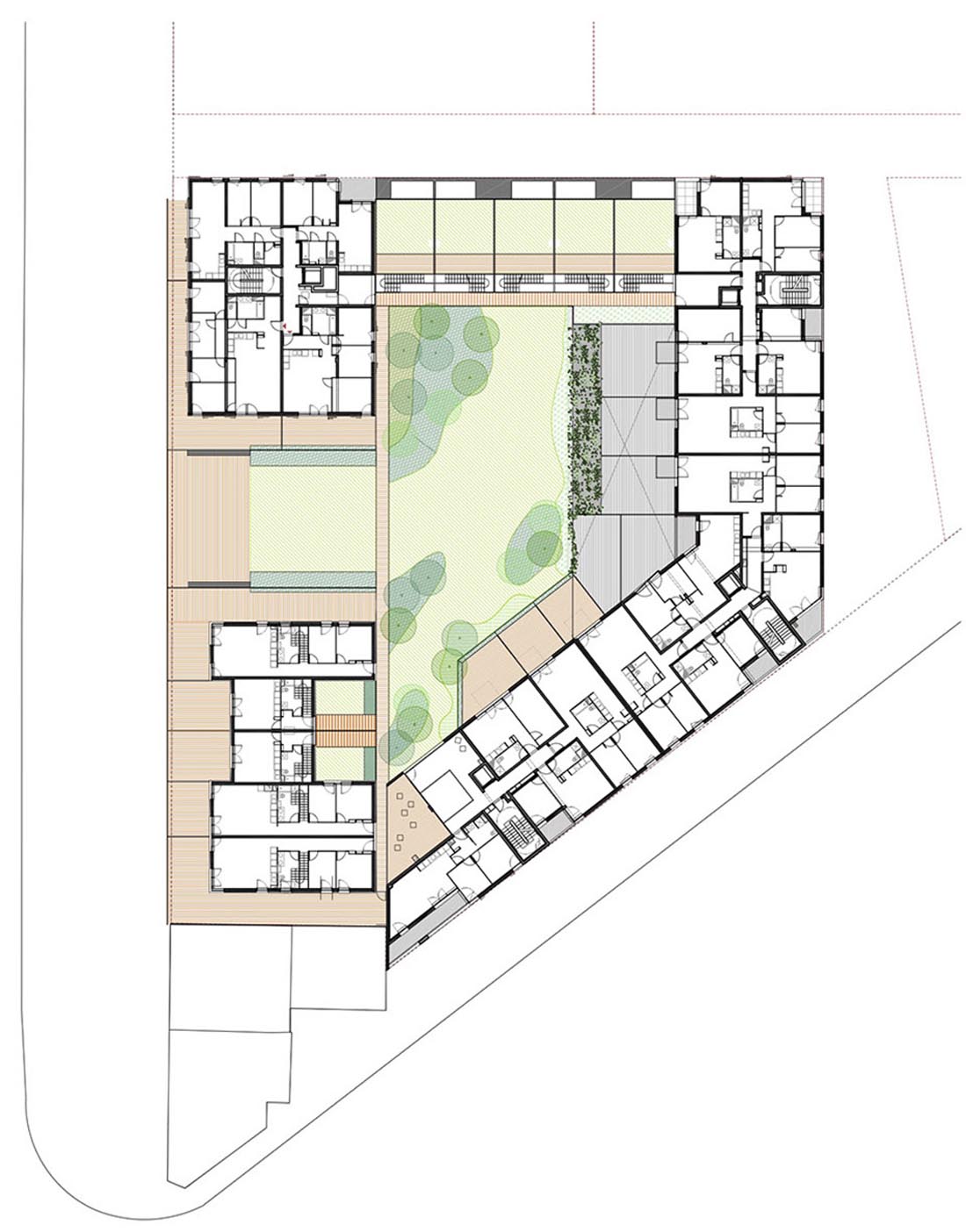 基于海平面高度的限制,设计师将地下停车场转移到地面中心区域,并将底部两层连通,二层设开放花园,三个公寓建筑体块环绕而设,正立面提供服务设施,空间与街道在视觉上产生对视。