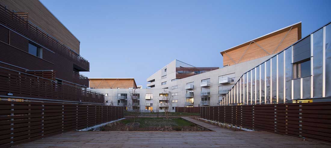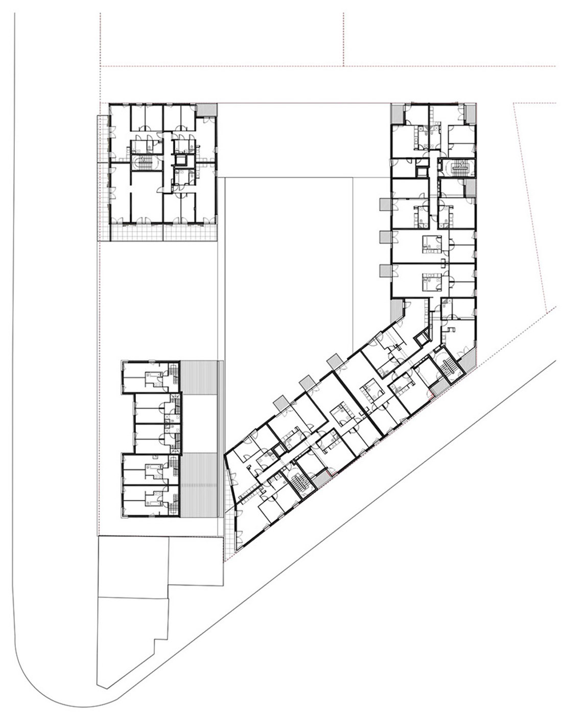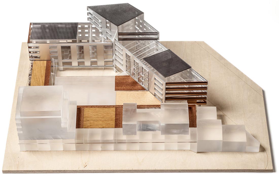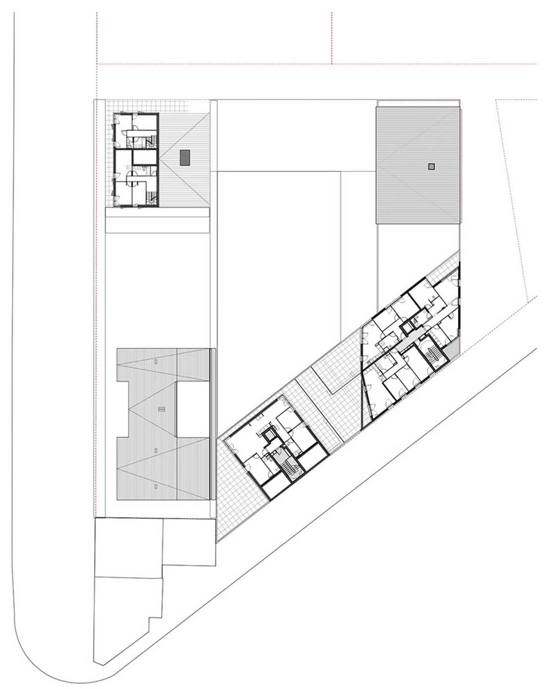 基于海平面高度的限制,设计师将地下停车场转移到地面中心区域,并将底部两层连通,二层设开放花园,三个公寓建筑体块环绕而设,正立面提供服务设施,空间与街道在视觉上产生对视。