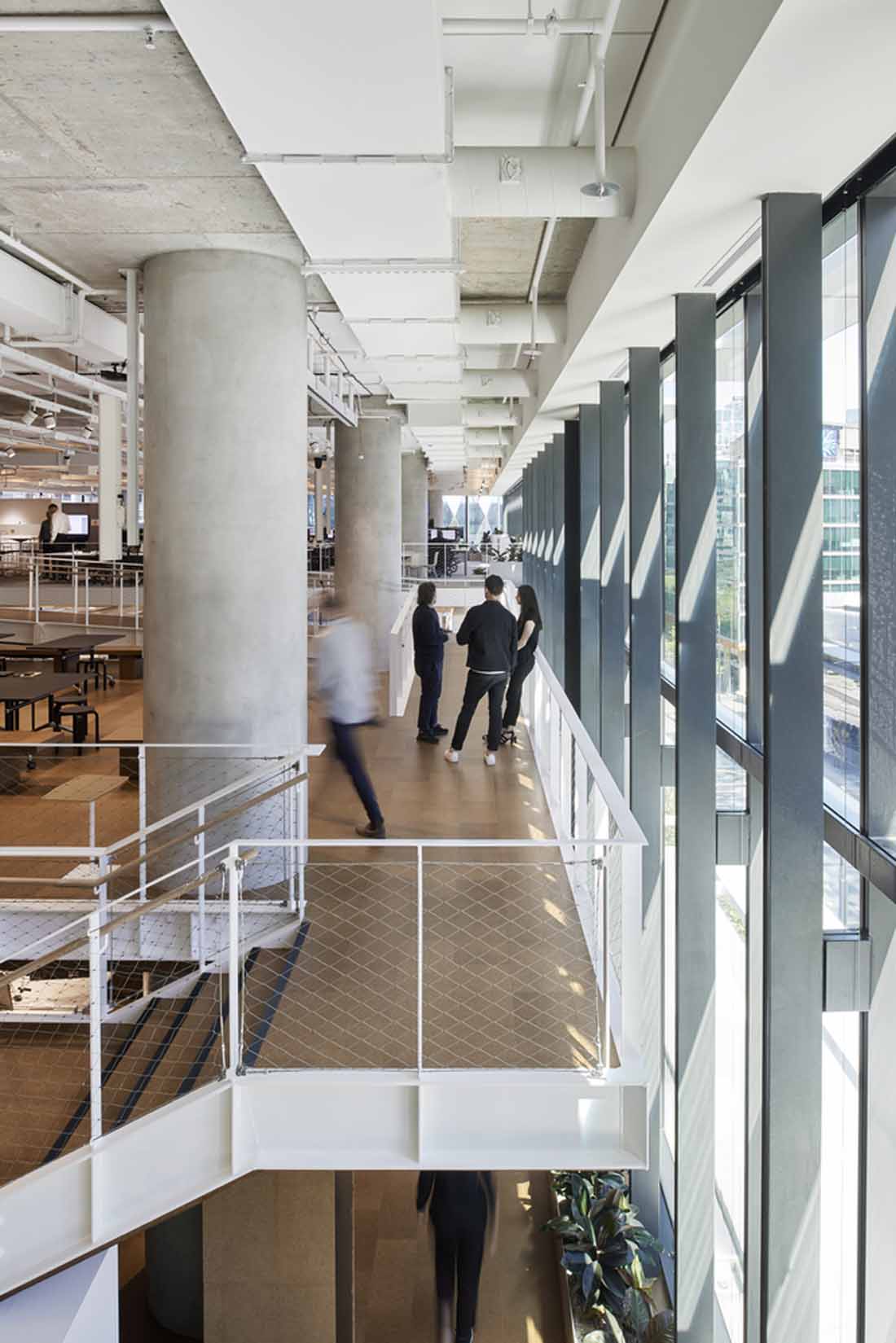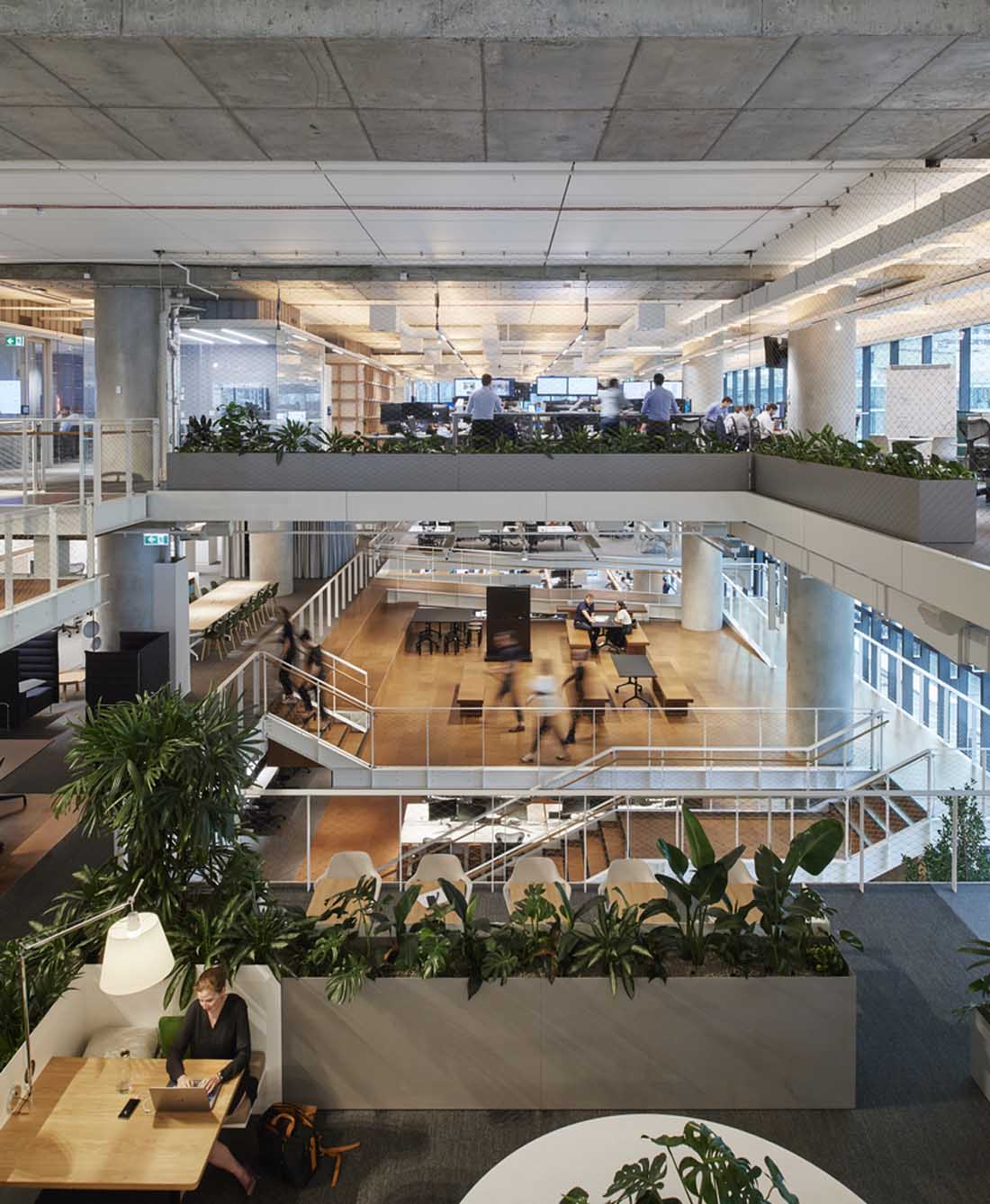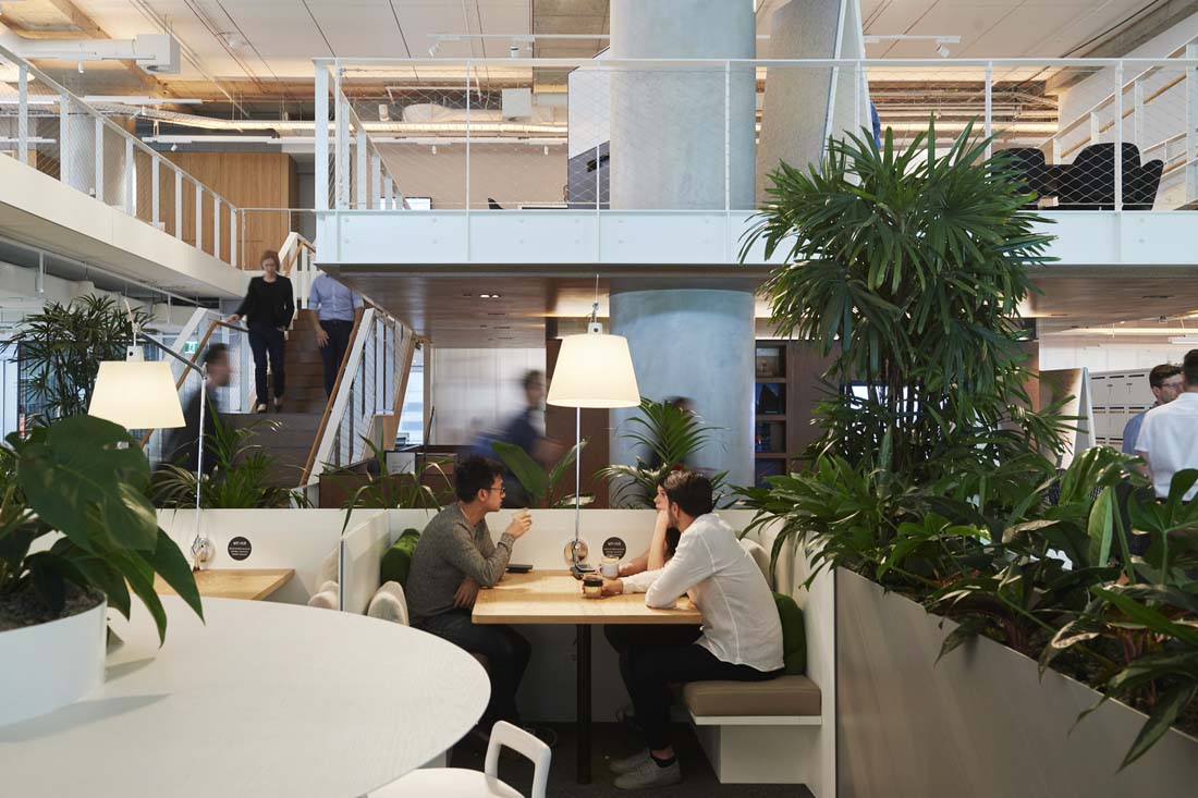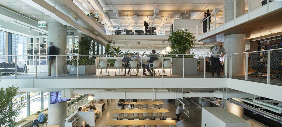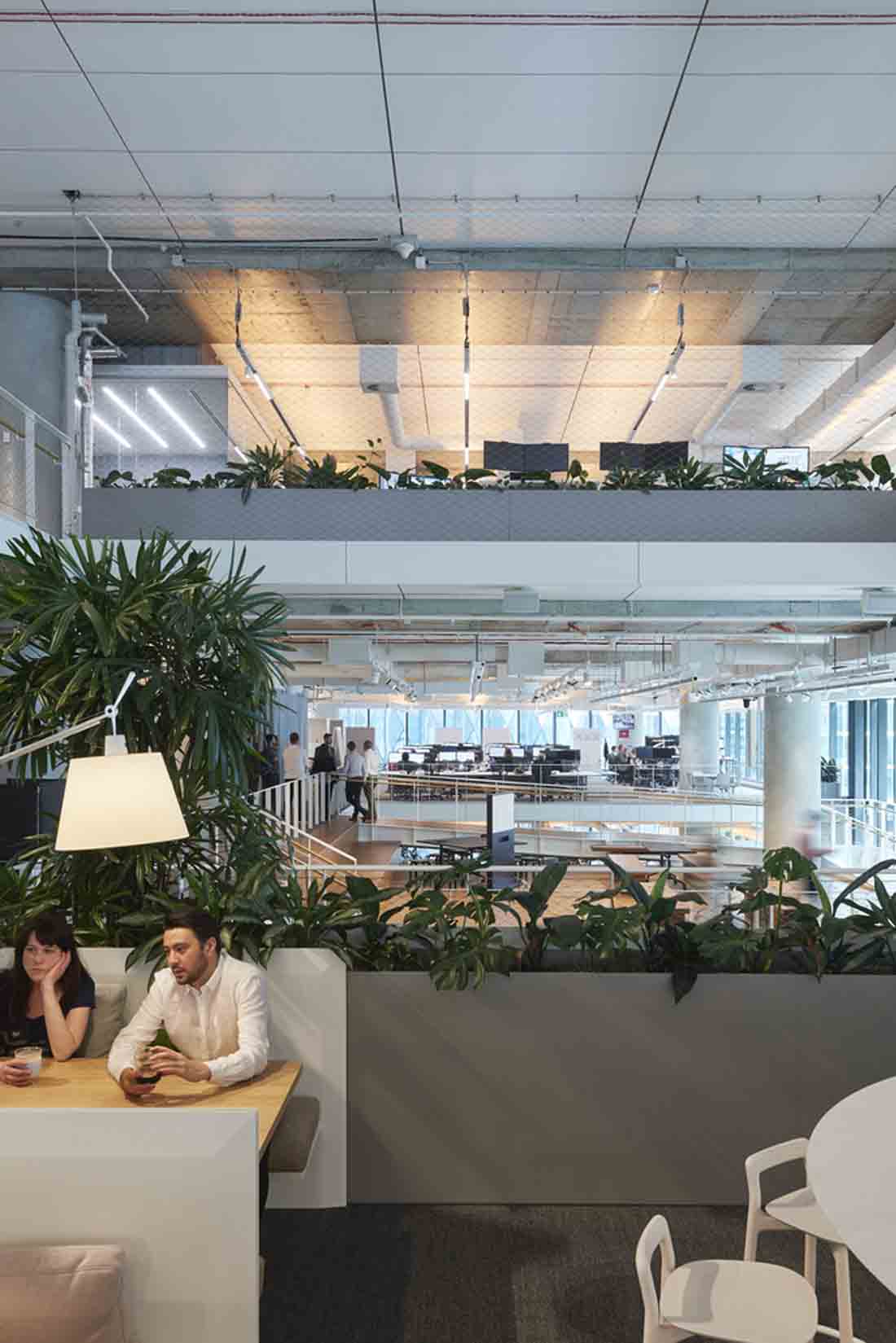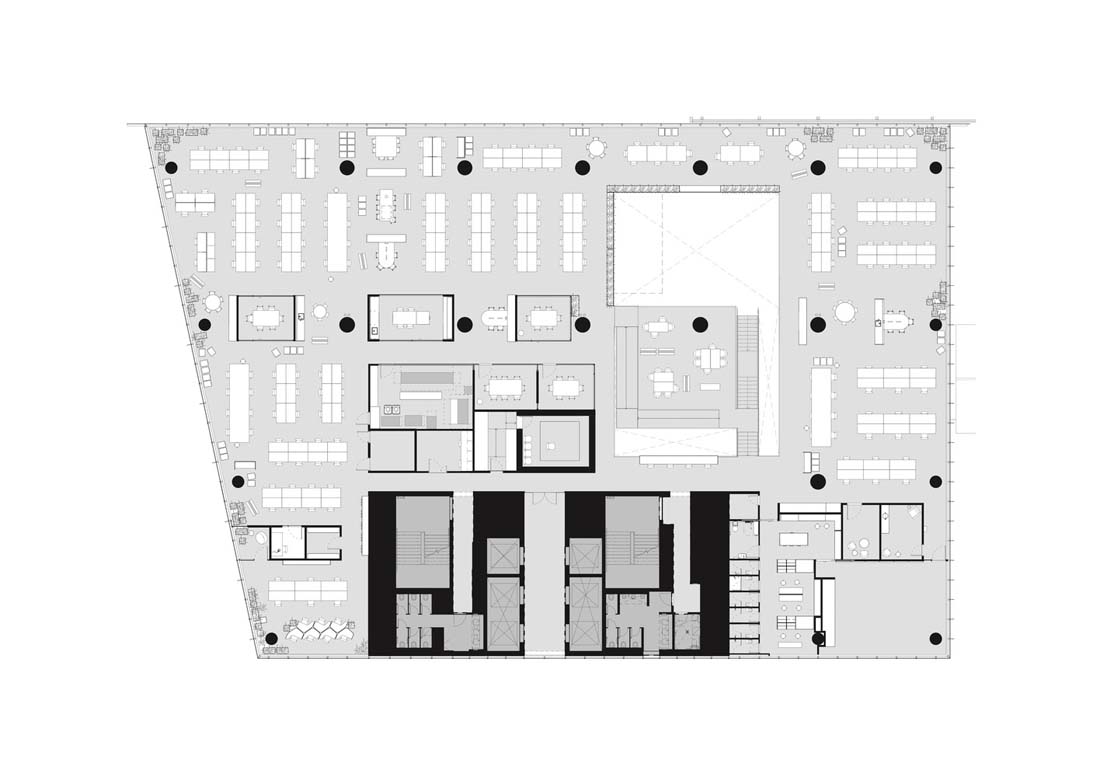 新的工作场所围绕两个重叠的空隙,从而形成一个单一的体积,而不是三个单独的层次。与将所有三个级别连接在一起相比,两个夹层有助于将卷扩展为级联协作。各种各样的工作类型包括正式和非正式的会议区域,设计工作室,实验室,工作厨房,培训室,私人项目室以及供客户和供应商使用的协同工作风格的咖啡馆,可实现思想和知识的不断共享。