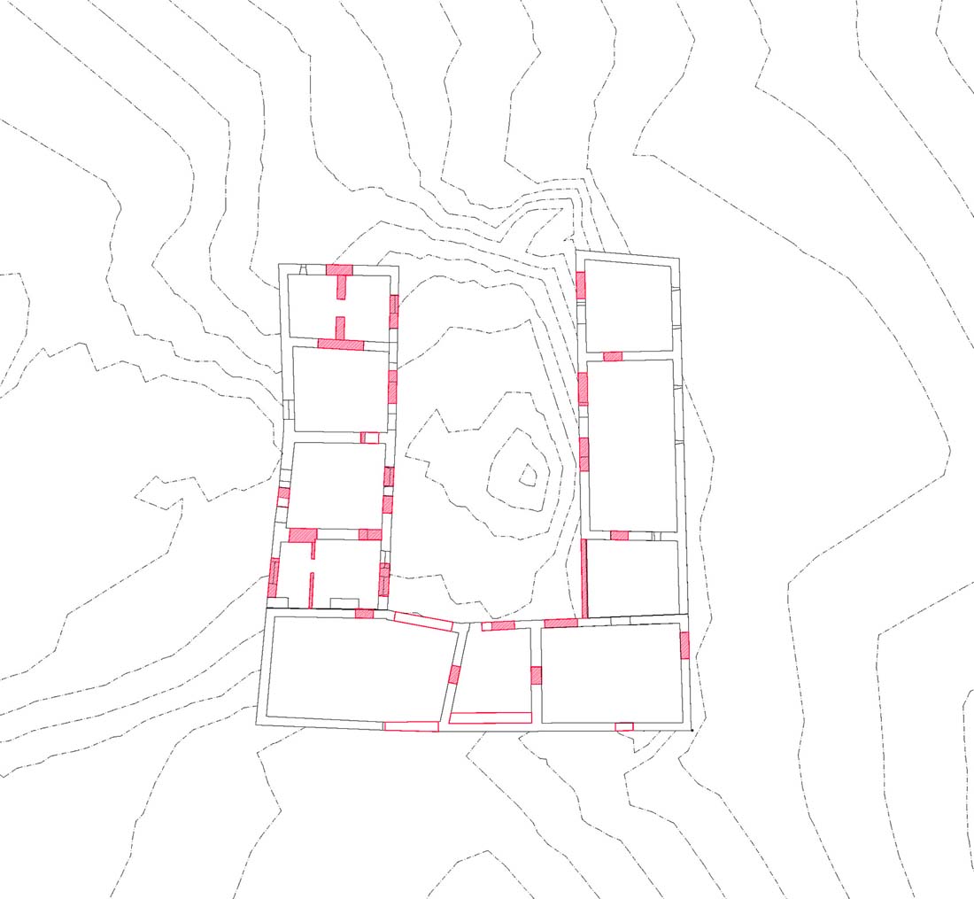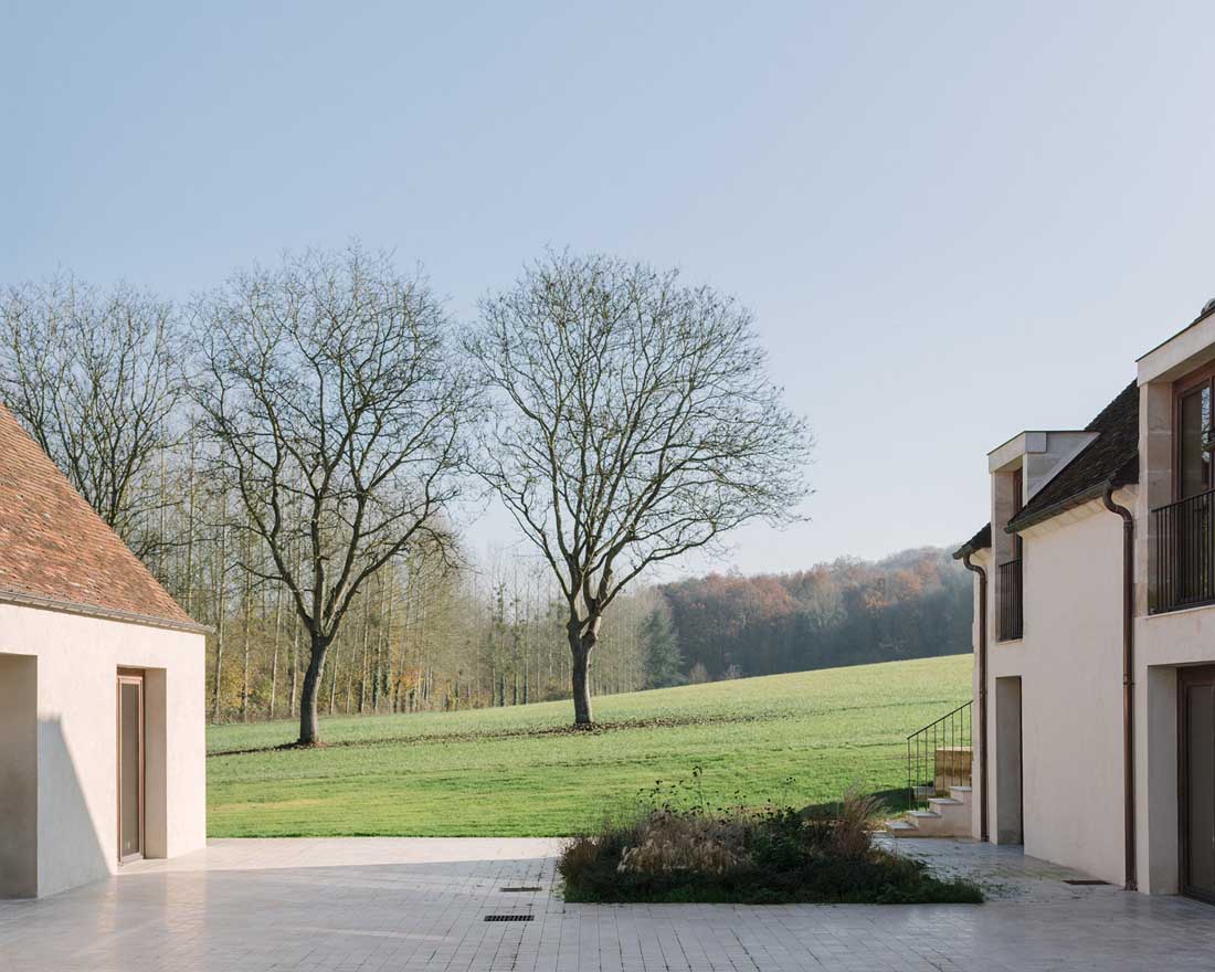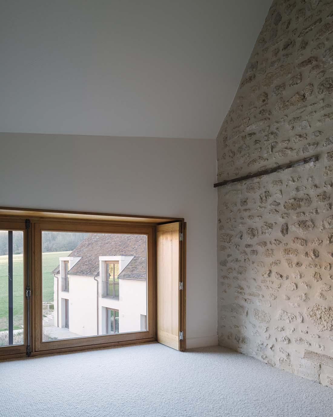首层空间被抬升至一个新的庭院之上,房间则围绕在庭院的周围。巨大的木制窗框将如画的风景引入每个房间。设计师选择性地保留了建筑中既有的结构,使其成为新起居空间的一部分。原本陈旧的农舍自此以全新的姿态融入到当地的景观之中。