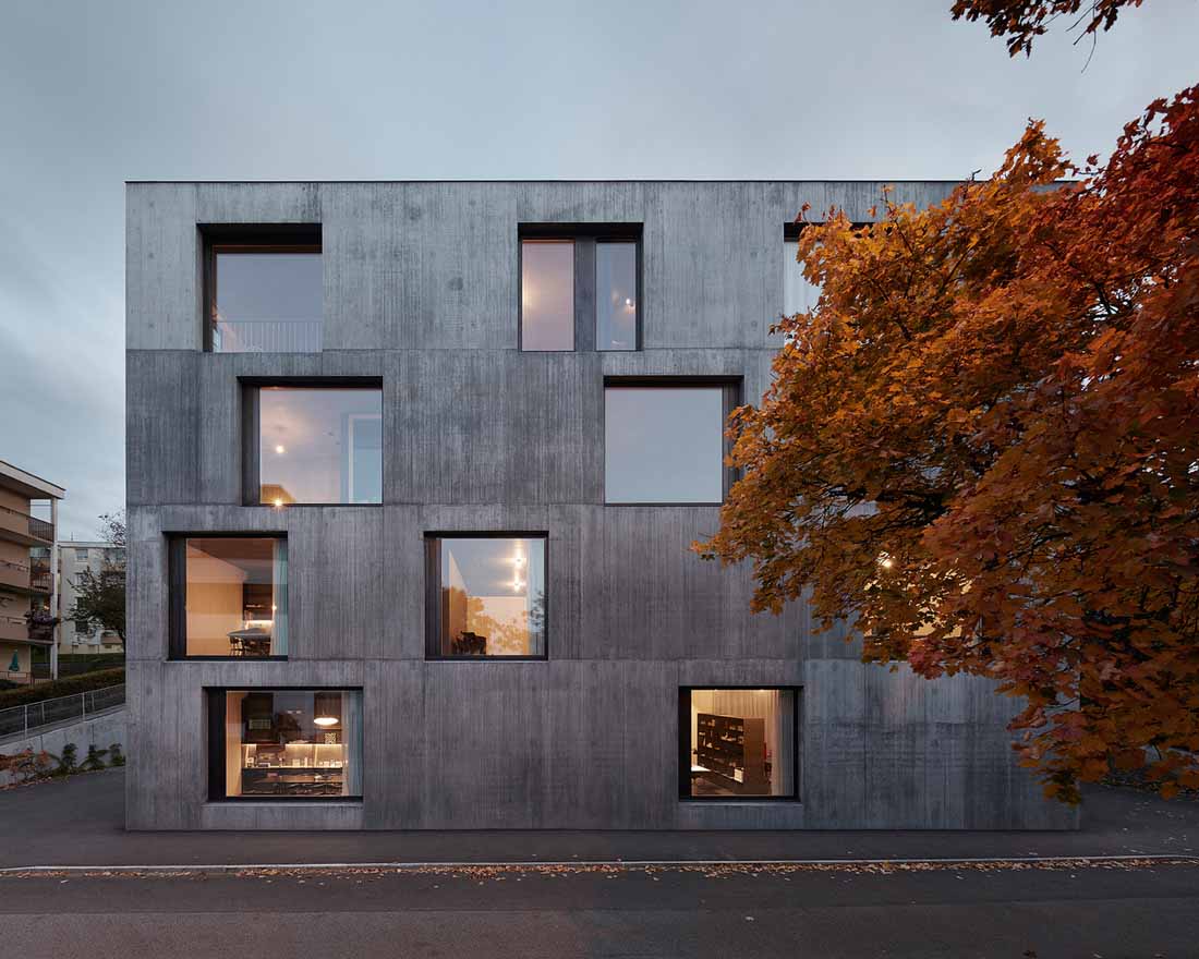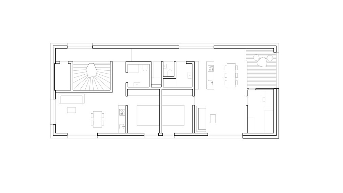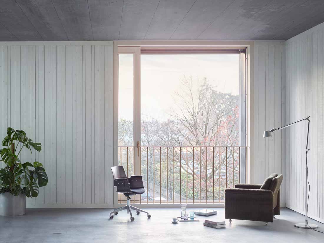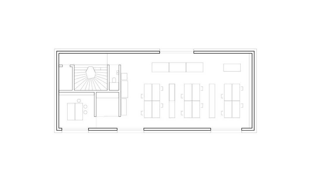 这个细长的建筑体有四层,一层叠着一层。所有楼层里的空间均以精确相等的比例组织起来,而不同的大窗户开口能看到不同的视野风景和不同时间位置的太阳。每个单元都设计成了可以工作和居住的空间。使用的灵活性将赋予这个建筑物以长期价值。