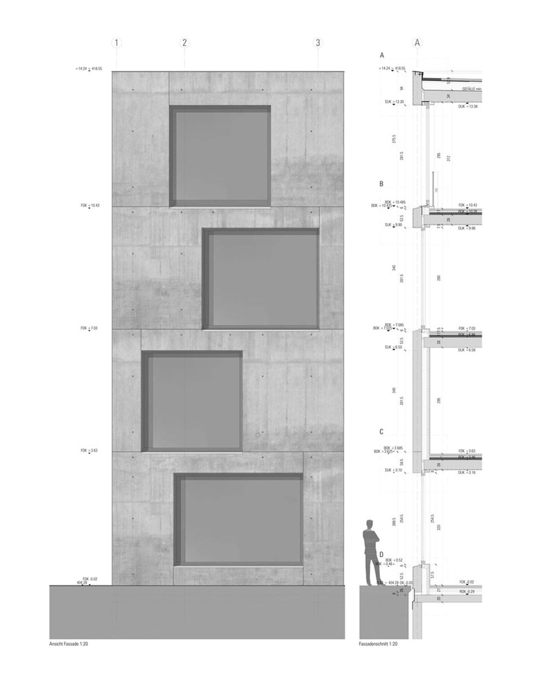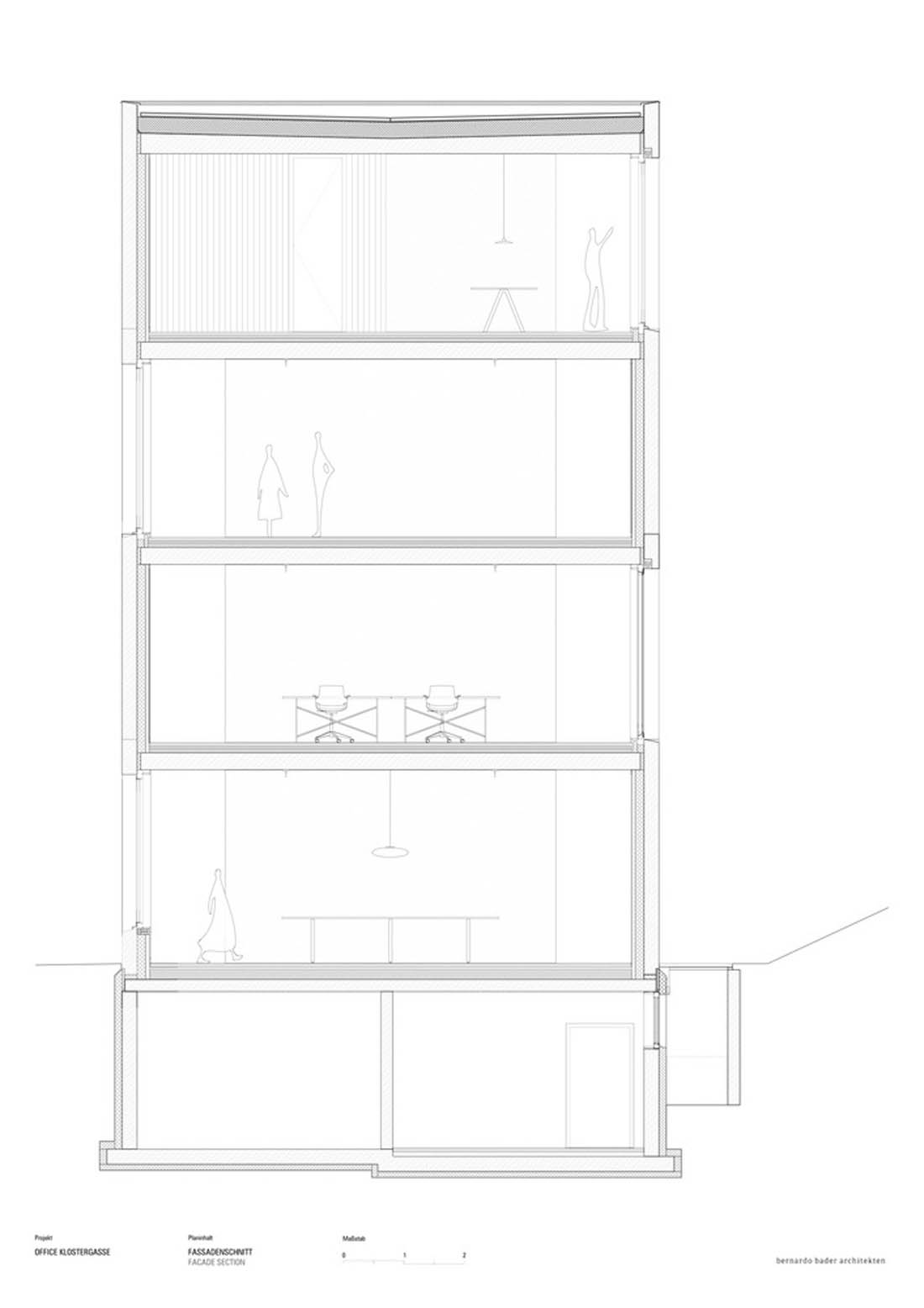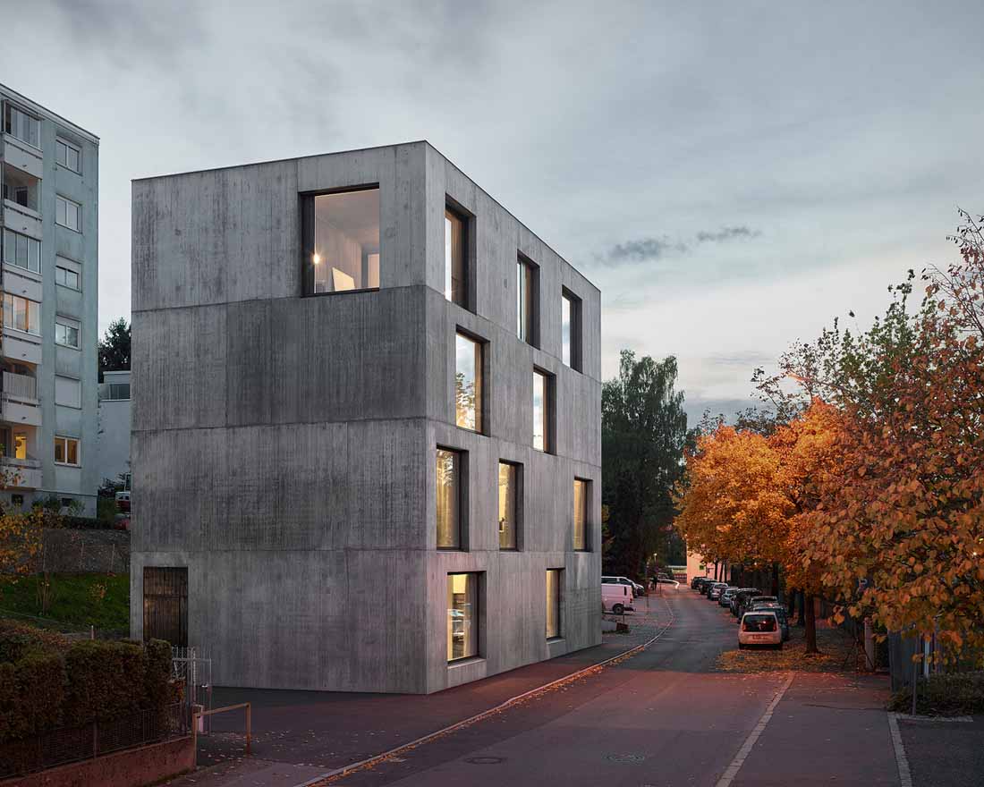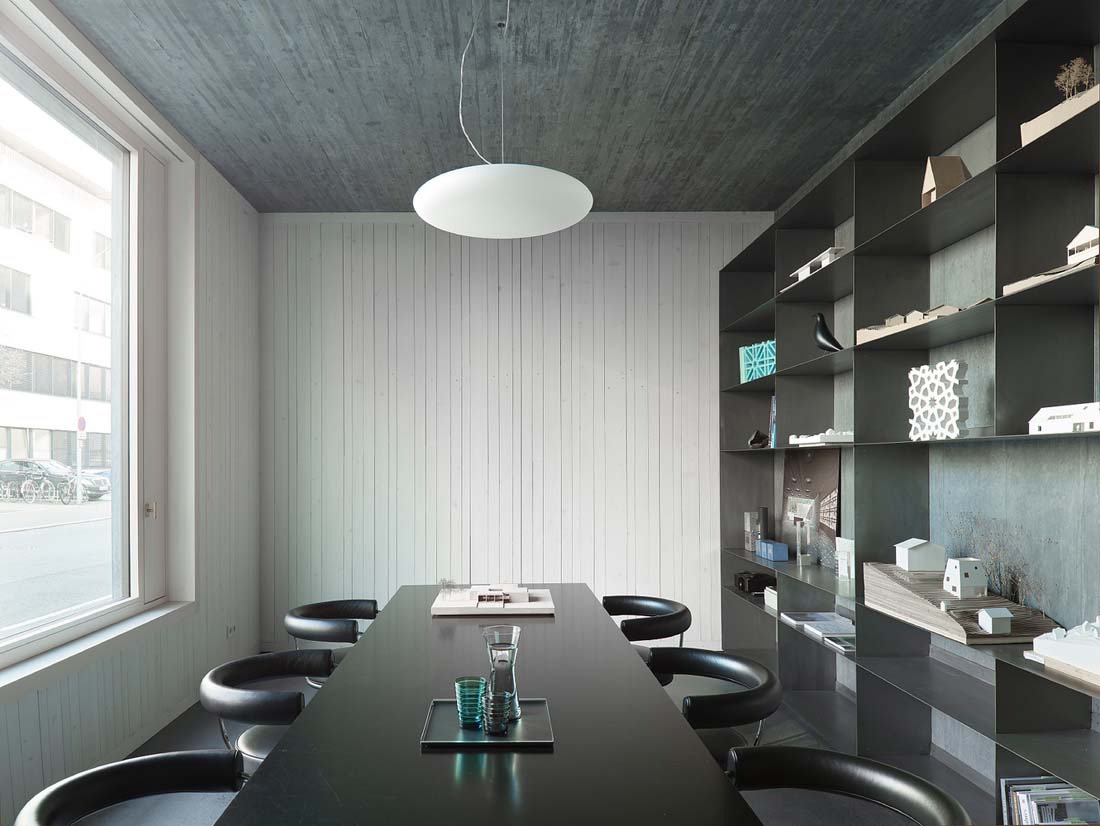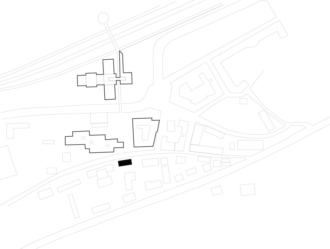 以一种几乎超现实的方式,显眼而细长的深色建筑体正坐落在 Klostergasse 上,就好像它意外地从纯几何学领域突然出现在一个未完成的世界。大尺度的地区行政办公室和省警察总部在其前景中,以及周围的1960年代和1970年代建造的居民楼,更加凸显了这种对比。