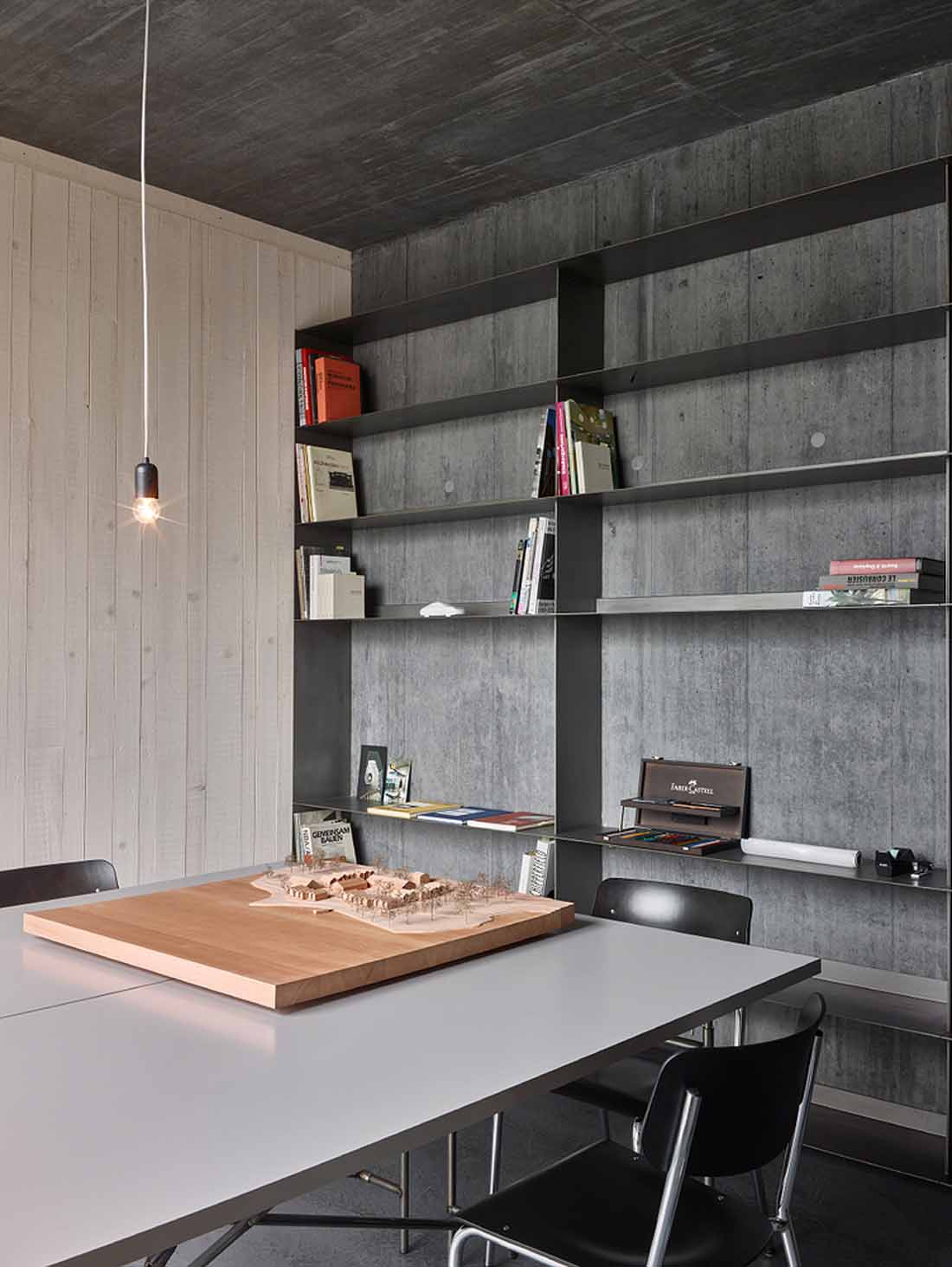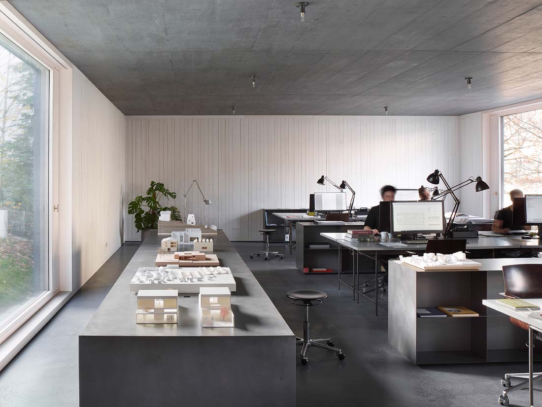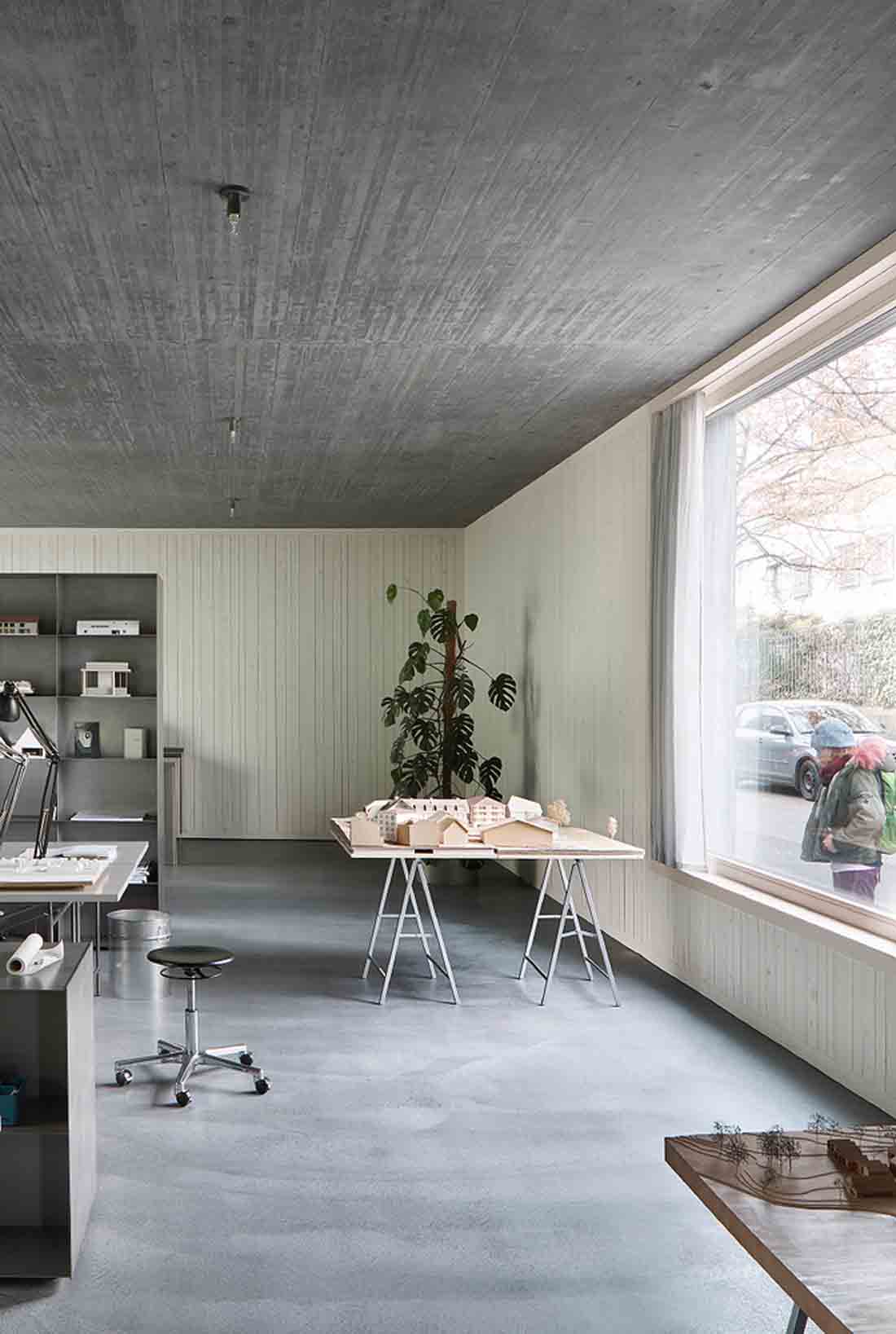 混凝土的空间辅以自然色调的云杉木和未经处理的钢材制作而成的家具。表面结构物及其触感性为个人工作室和生活空间注入他们的独特氛围。这个建筑物每个细节上的氛围感和刺激性,激发出持久的吸引力。