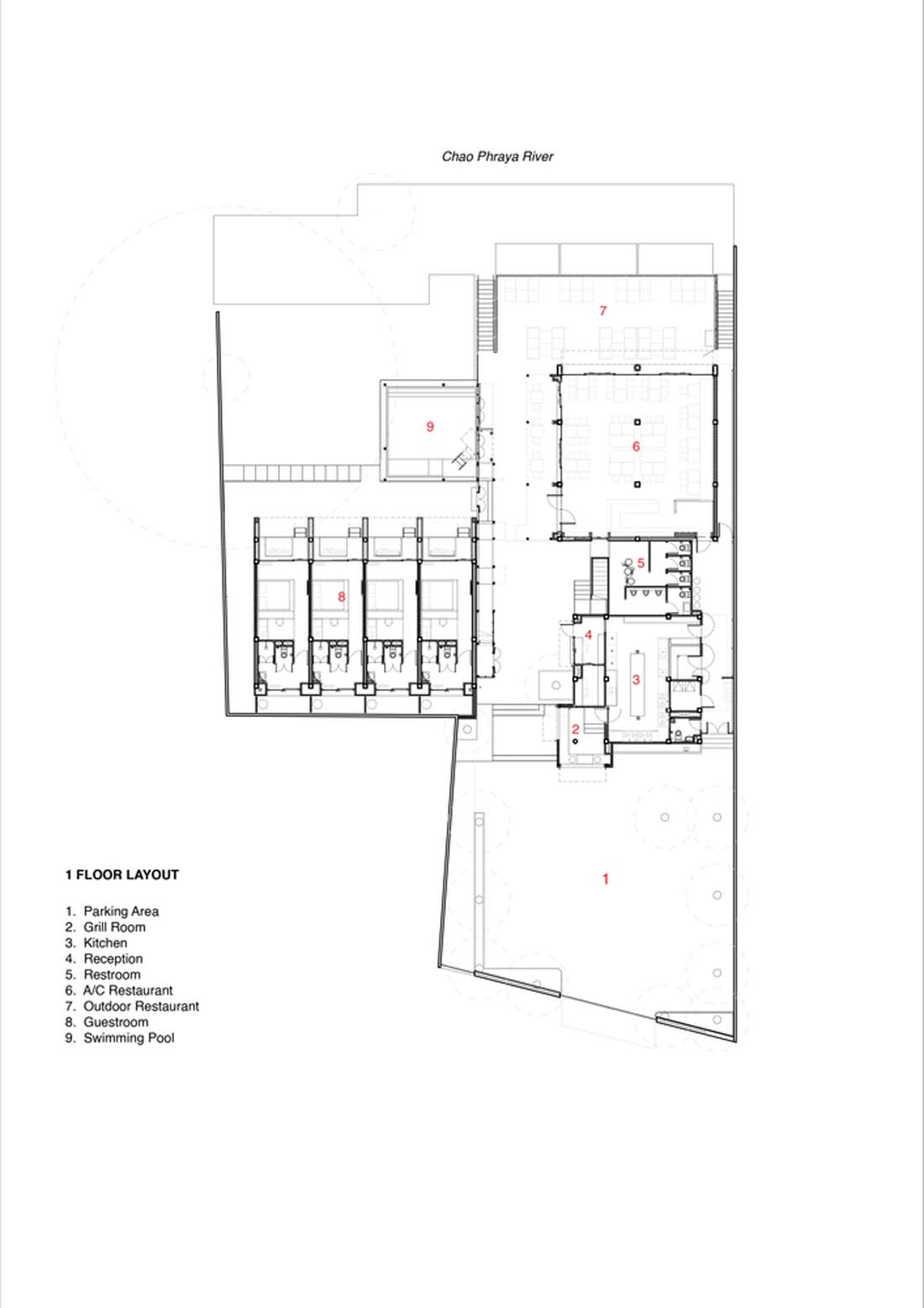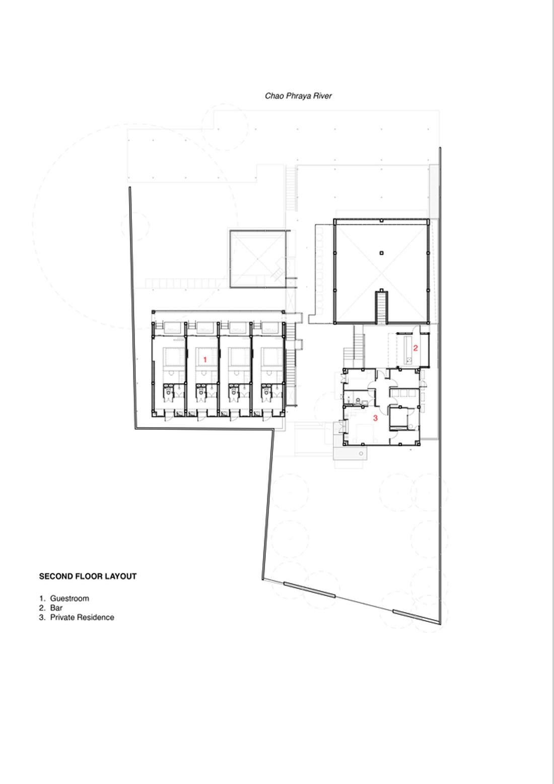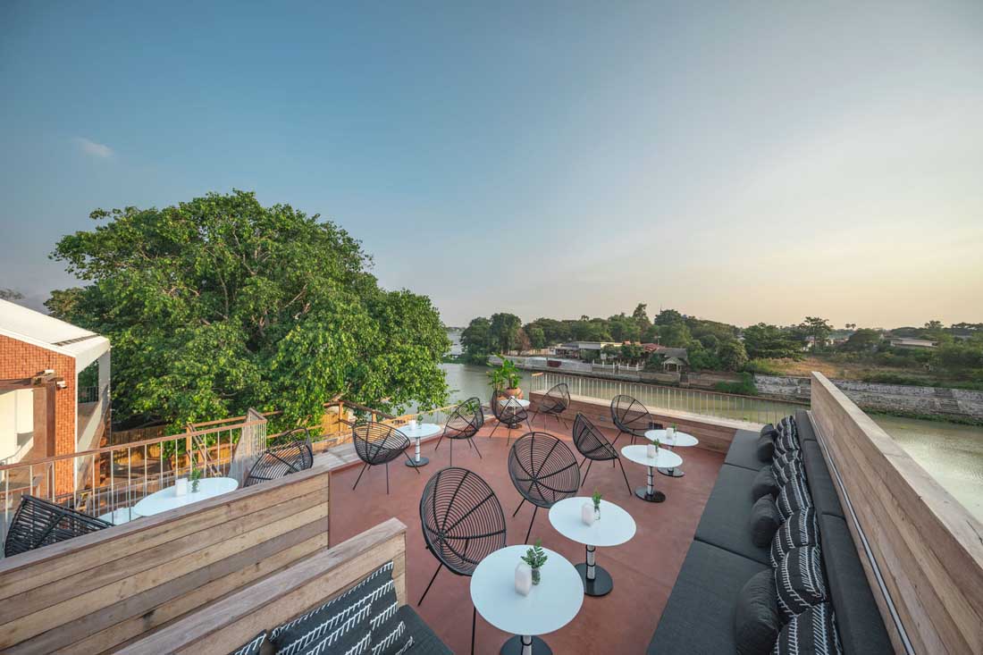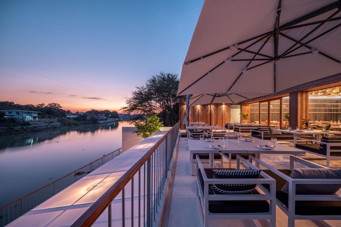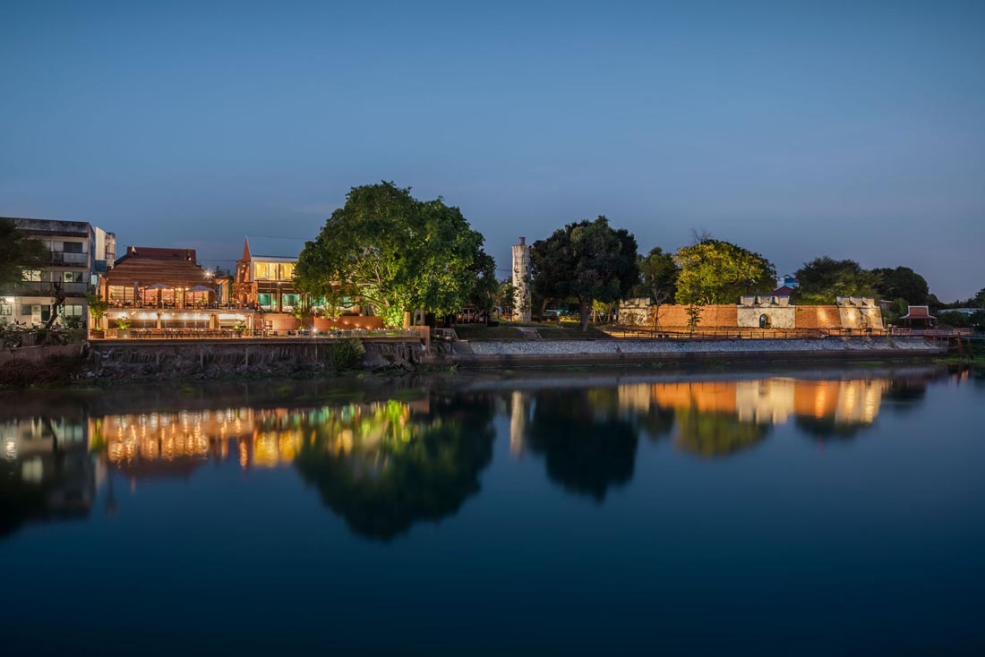 在总体规划中,设计师将餐厅和酒店这两个建筑分隔开,并让主要的流通通道让每个人进入现场后立即看到河流。随着人们探索每个空间,河中还有更多令人惊讶的元素,例如河边砖砌的堡垒要塞,游泳池旁的一棵巨大菩提树的景象等,还有游泳池和主要水流之间建一堵木墙,作为酒店主要木制楼梯的延伸。