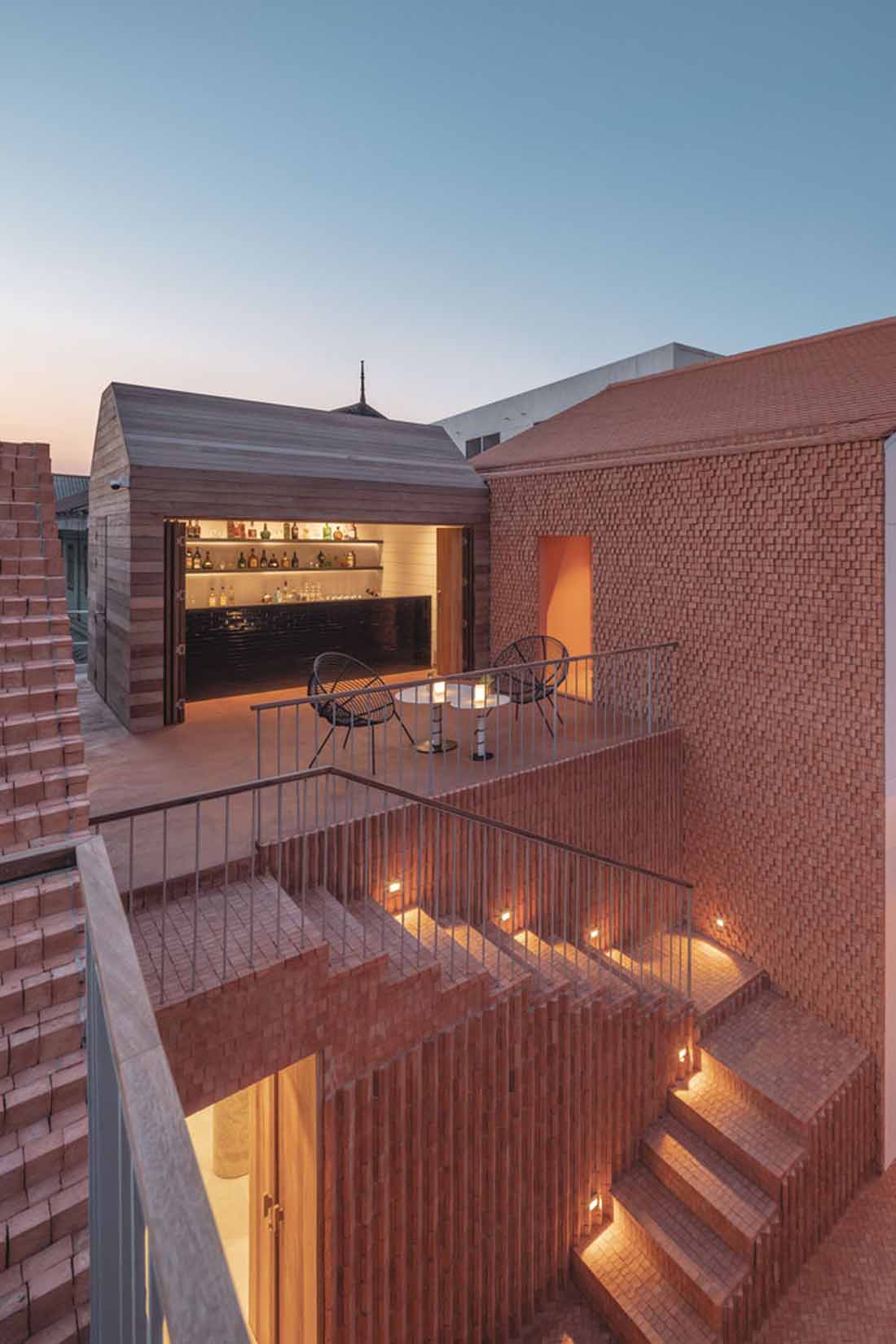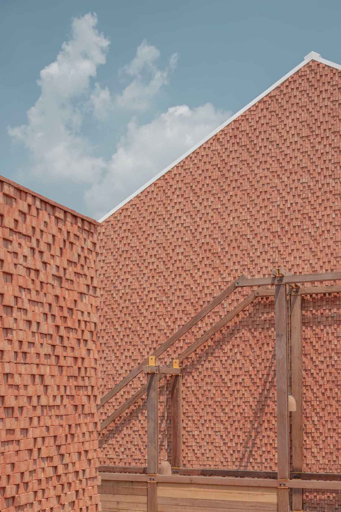 酒店的外观是砖结构,水泥漆成白色。墙壁的不同纹理似乎捕获光线和阴影的方式有所不同。砖块特别小,以6种不同的墙壁和地板图案排列,其颜色为特殊的橙色。