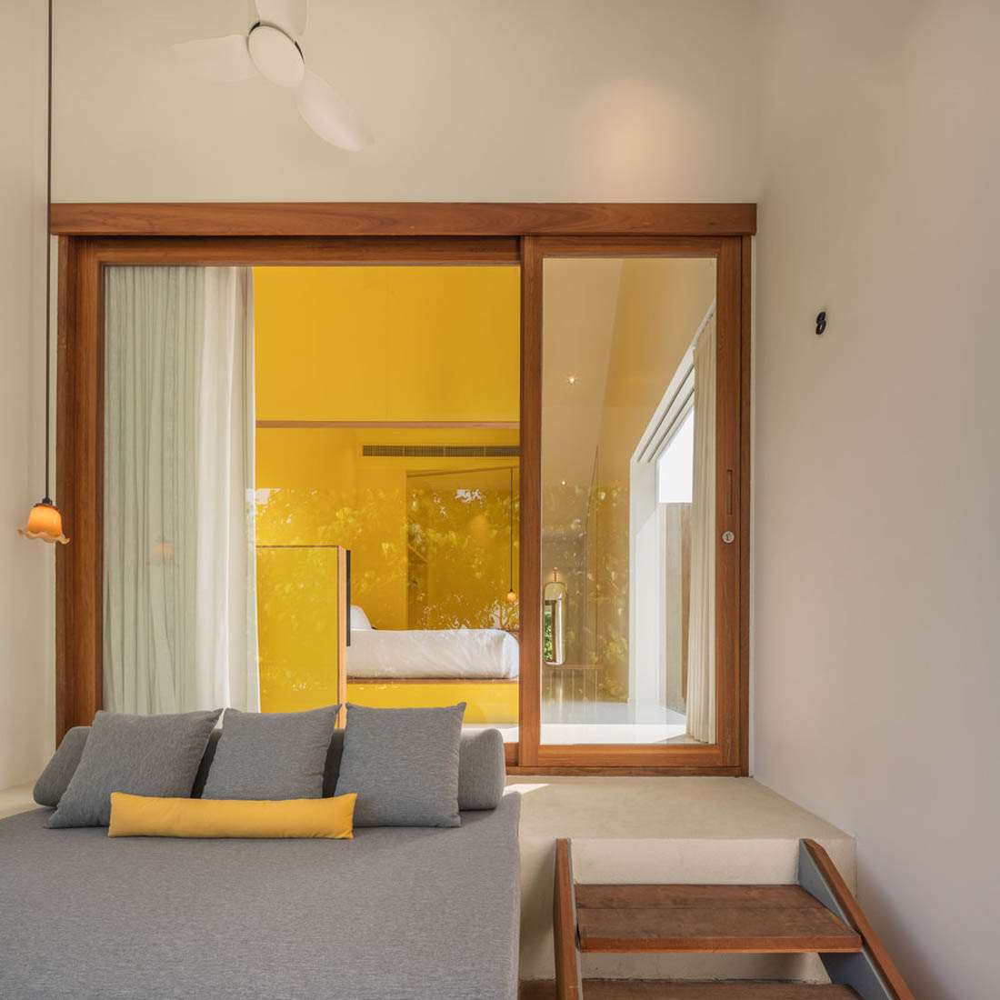 其次,酒店有一棵菩提树,设计师通过尽可能远离其根基的建筑地基加以保护。菩提树是三维空间构成方面的灵感。设置了游泳池的高度和主要循环通道,供客人欣赏菩提树的海拔。