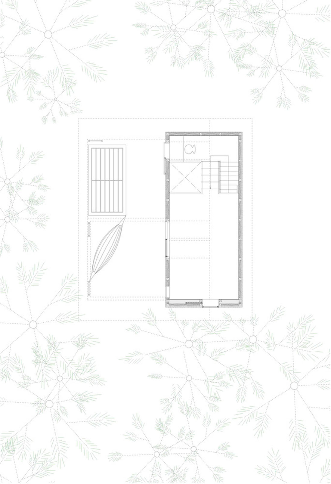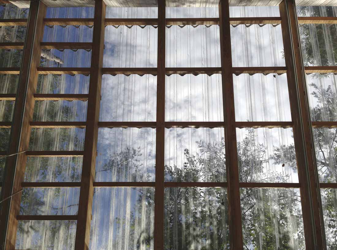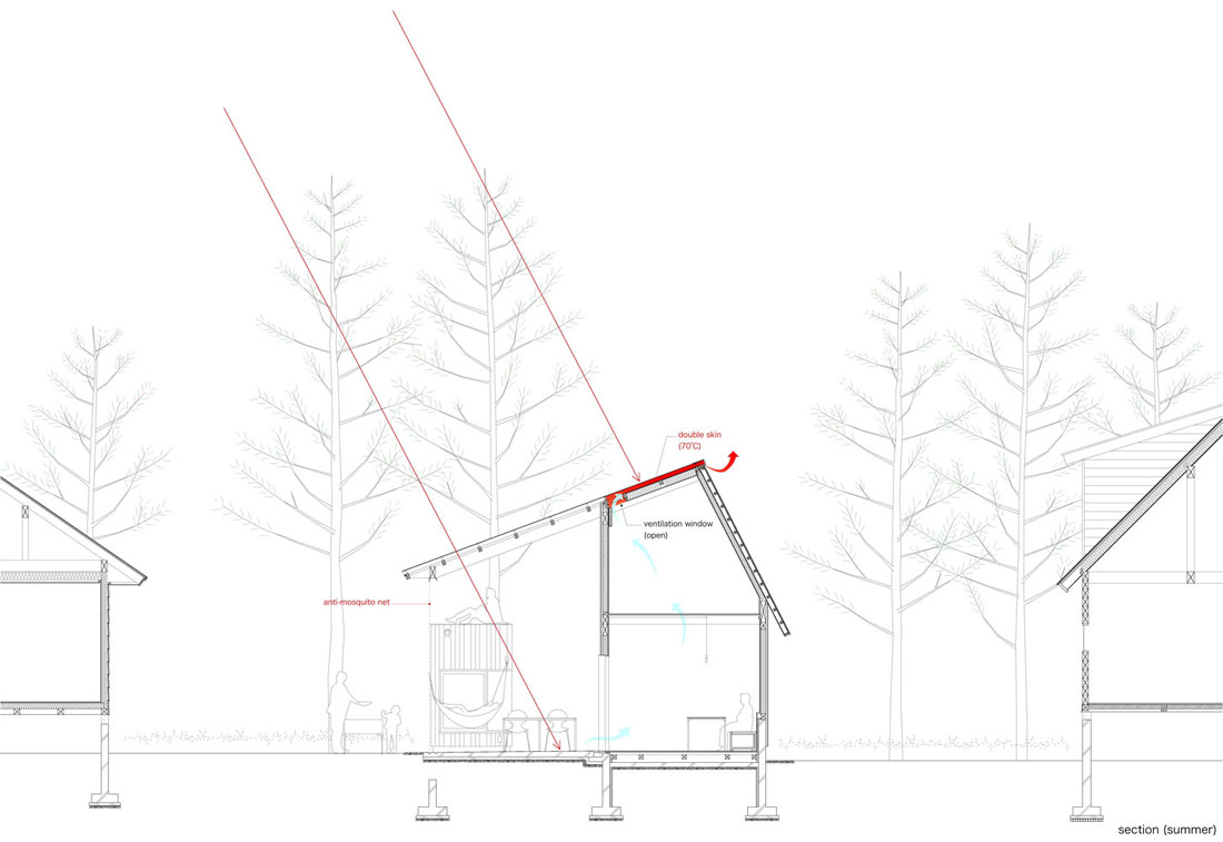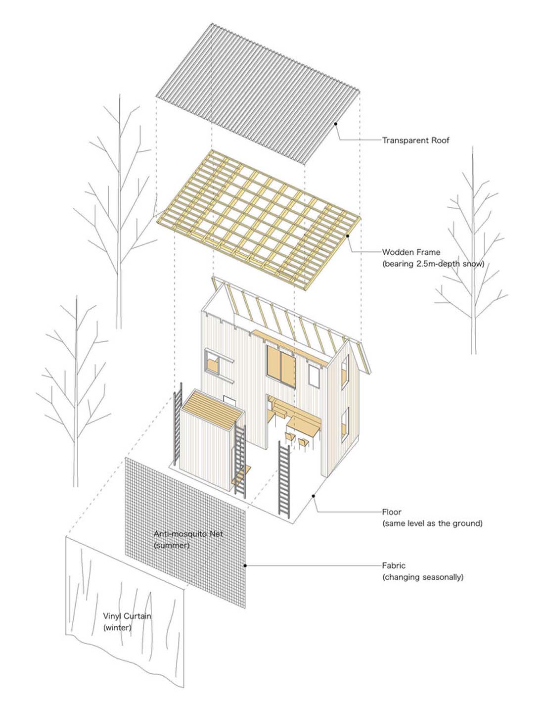 这些建筑组件同时也可以作为被动工作系统运行。连续到地面的楼板,可以获取地热能并将其存储在地板下的厚板中。周边的积雪在冰点以下的环境中可以作为保温隔热设施。透明的屋顶有双层表皮,夏季有助于光照驱动的自然通风,冬季可以避免冰坝问题。
