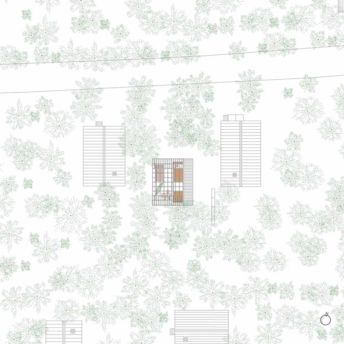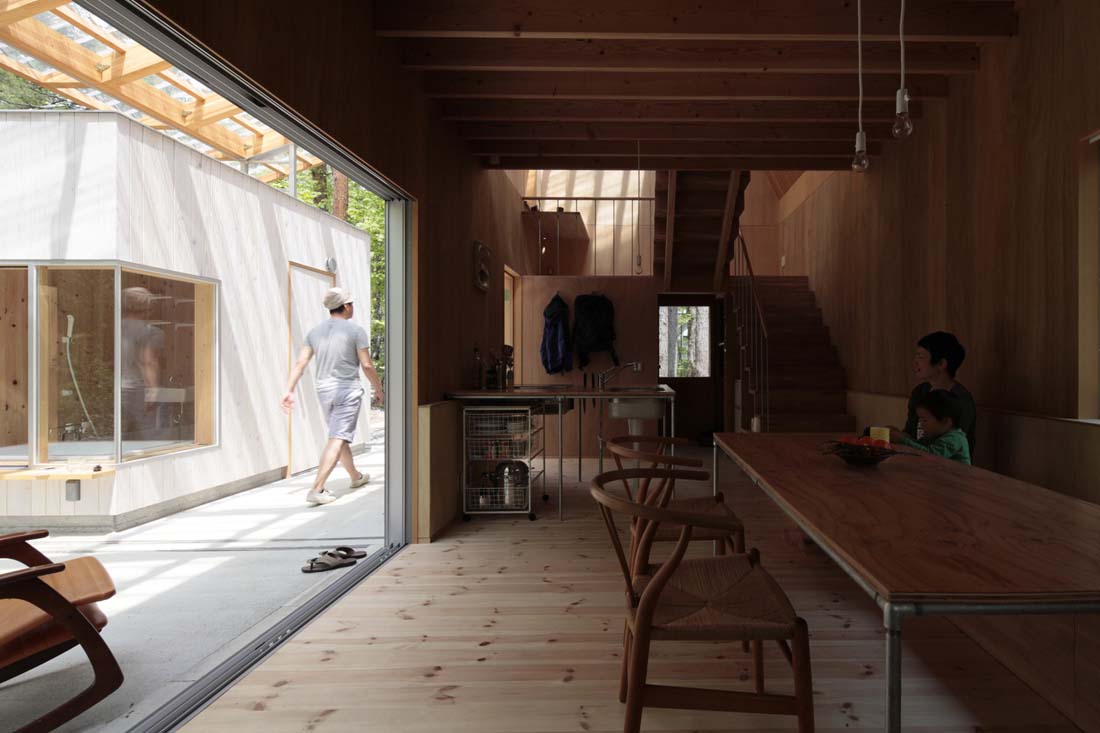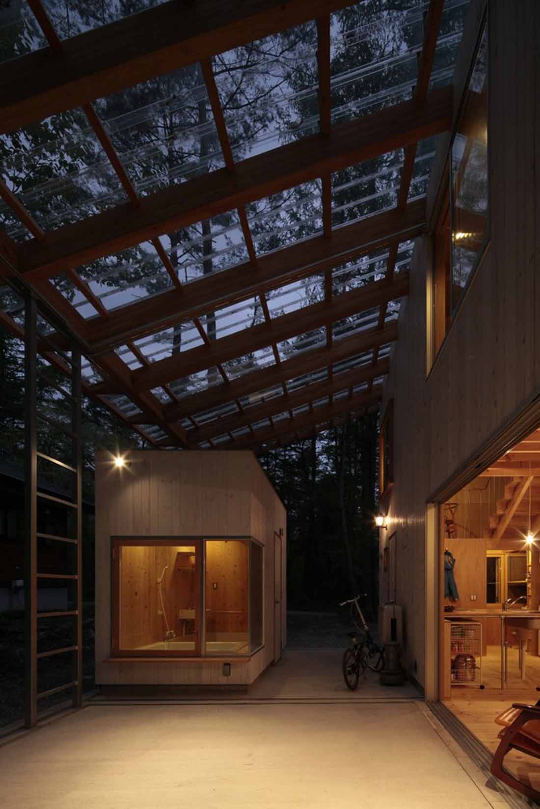 所以,设计师先在场地上设置了巨大的屋顶,使得楼层与场地平面产生连续性。大屋顶采用聚碳酸酯平板来承受积雪的重量,其是透明的,因此大量自然光得以从屋顶平台进入室内。因此住户得以享受森林中的时间与光影。