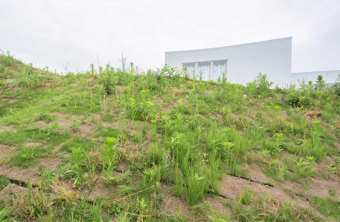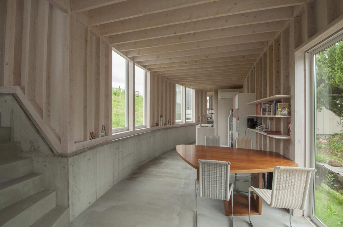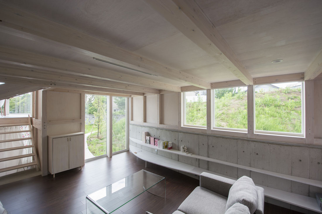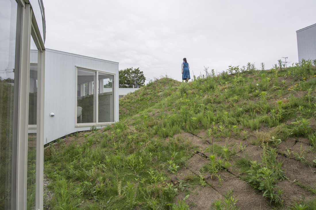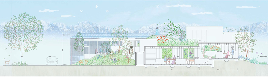 起居和办公空间服务于办公室员工,不确定的有多人聚集的沙龙与其建在同一平面上,使人们可以在水平向移动,而无需沿着山脉的轮廓线爬高。“山”不仅将一个场地分为三部分,而且还成为俯瞰立山山脉的观景台,自身也成为当地的景观。建筑稍稍弯曲,使其山的排布能看起来不像是人为的。