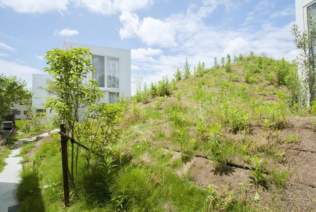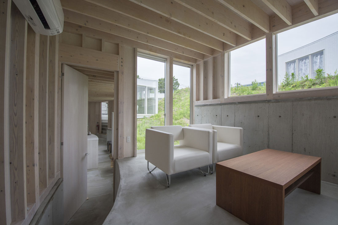 从面向远山的窗户,你可以看到从周围环境中自然生长出来的花朵和生物。三座建筑中,每座都有一间沙龙、两间住宅和三间办公室。每组六个建筑体量,建在三个不同标高的平面上。