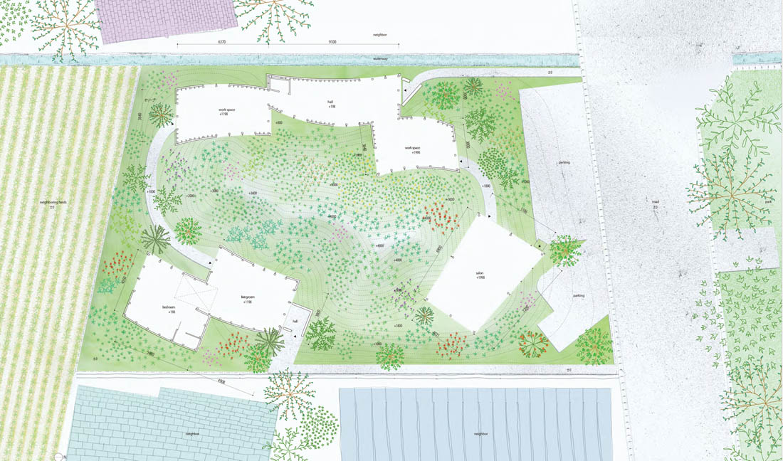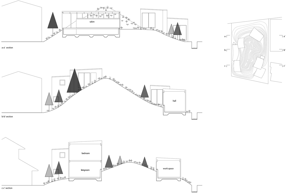 在道路的另一侧,即场地北侧,有一个公园,园内长着一棵树,曾是孩童们的游乐场。当一片场地在东西南北每一面所应对的环境都不同的时候,“山”的概念就被提出来了,且这个建筑的“山”将通过路堤而不是篱笆围合出来。场地被“山”分成三个部分,山脊线规划出了三种不同的环境。