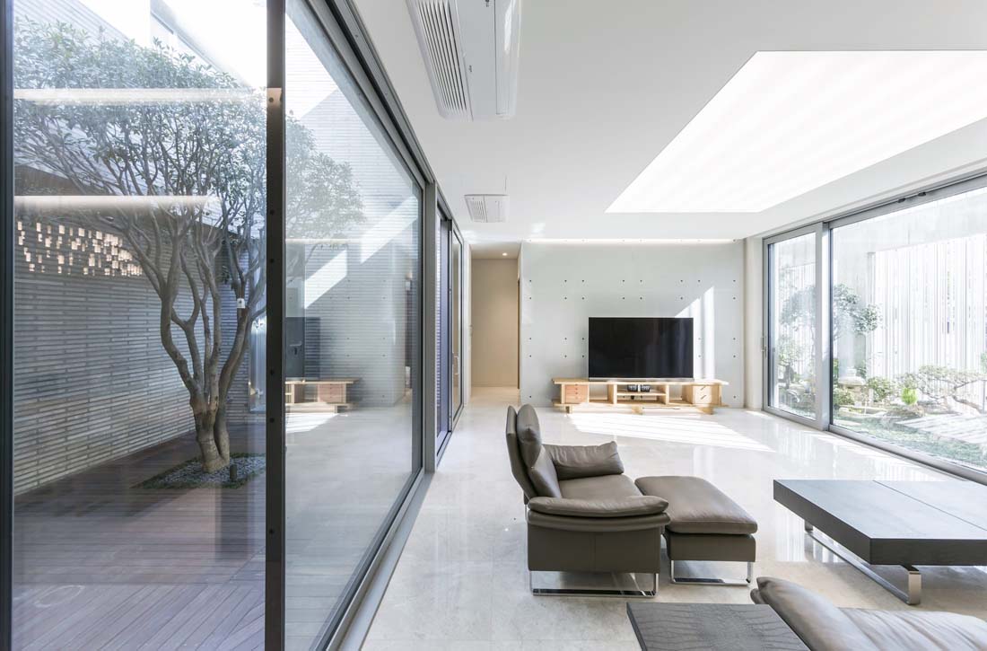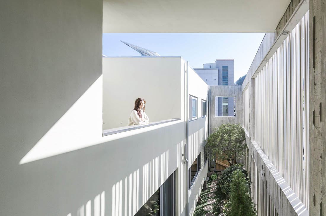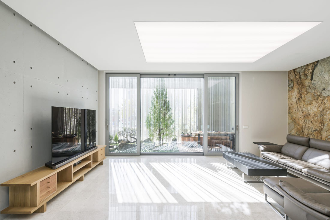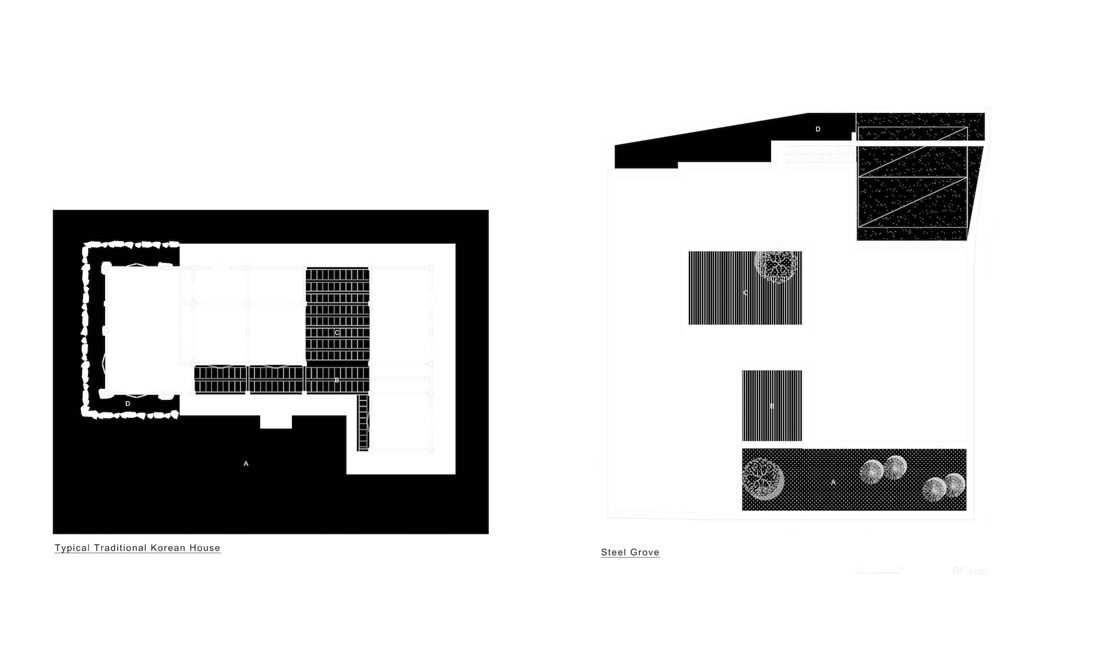 Steel Grove项目场地位于城镇住宅区,住宅相互环绕。从外部空间的构成来看,Steel Grove是对韩国传统住宅的现代诠释。韩国人的主流住房是“公寓”,超过90%的韩国人住在公寓或类似公寓的房子里,这些功能性的生活区域通常没有外部空间,而传统的韩国房屋包含各种各样的外部空间:前院、后院、taenmaru(沿房间延伸的狭窄木廊)和daecheongmaru(主廊)。每个外部空间对不同的房间有不同的功能,其中某些外部空间甚至与栅栏外的街道有联系。