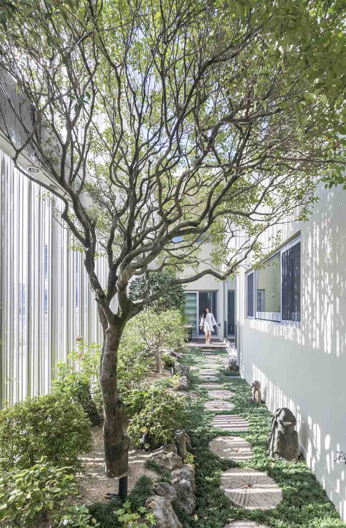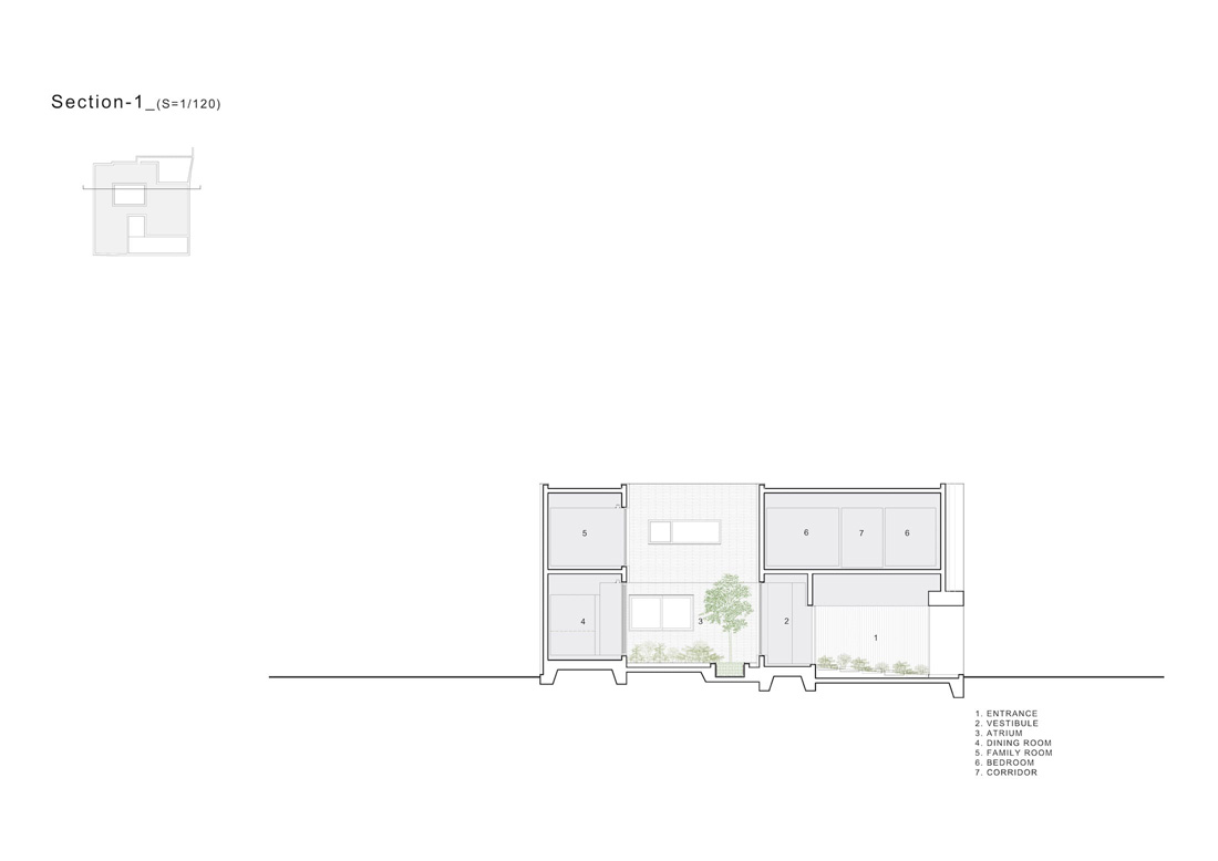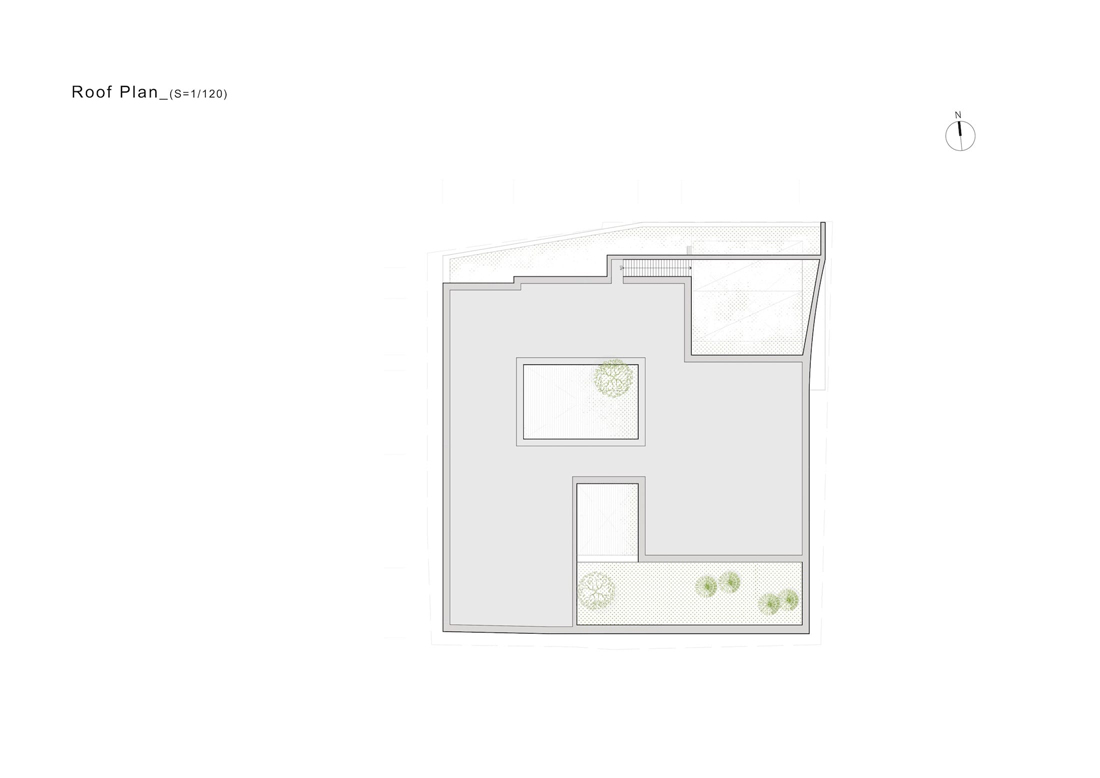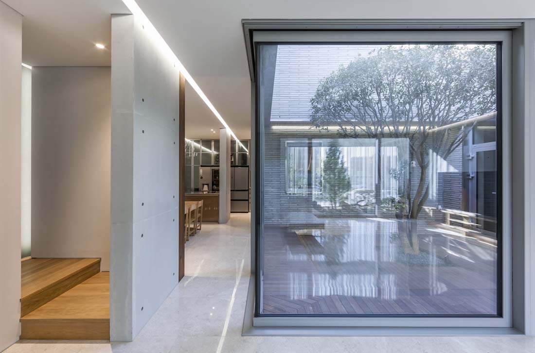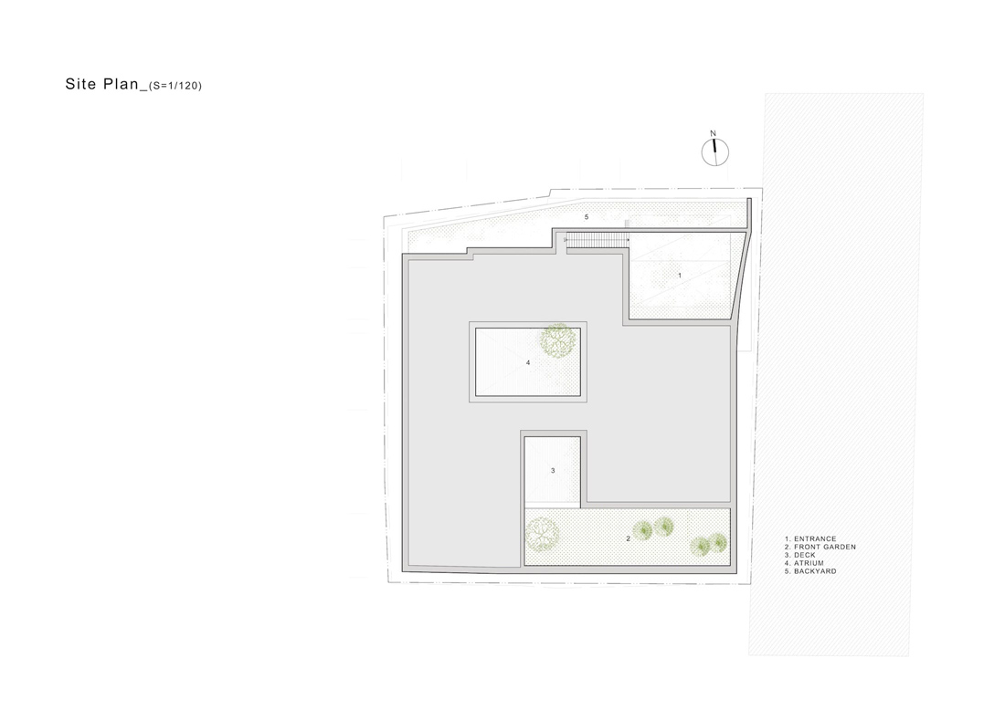 Steel Grove有各种各样的外部空间,与传统韩国住宅的特征类似,每一个外部空间都相互关联,对每个房间都有不同的功能作用。当你打开主门,进入一个开放的屋顶空间,这个空间通过中庭连接餐厅,中庭又与跟客厅相连的前花园相连。前花园也与二楼的平台相连。虽然的大部分外部空间位于房子的一侧,并与房子内部一起发挥作用,但是南立面和南花园试图与周围的街道创建沟通与联系。