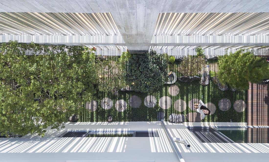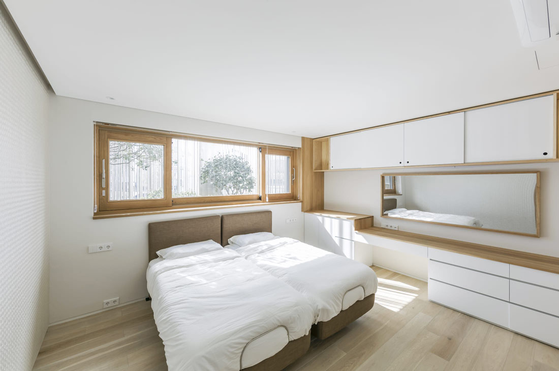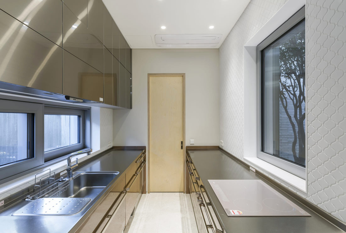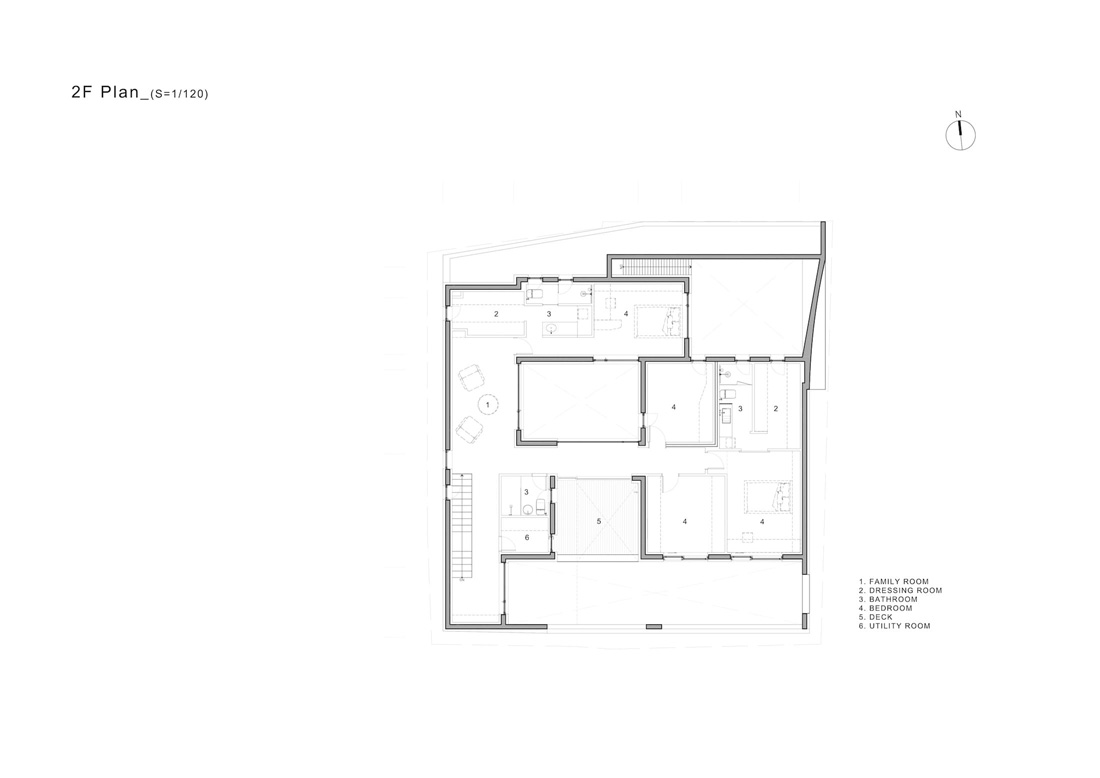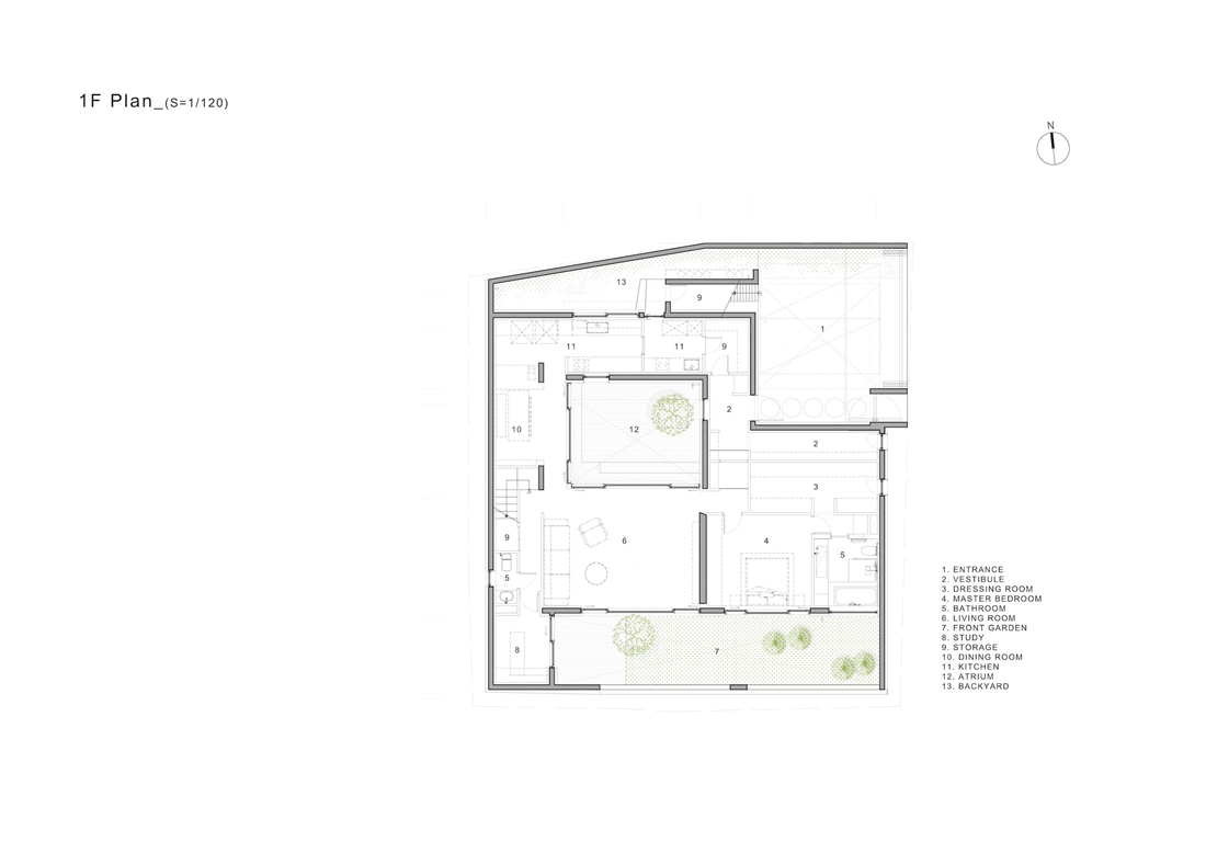 Steel Grove有各种各样的外部空间,与传统韩国住宅的特征类似,每一个外部空间都相互关联,对每个房间都有不同的功能作用。当你打开主门,进入一个开放的屋顶空间,这个空间通过中庭连接餐厅,中庭又与跟客厅相连的前花园相连。前花园也与二楼的平台相连。虽然的大部分外部空间位于房子的一侧,并与房子内部一起发挥作用,但是南立面和南花园试图与周围的街道创建沟通与联系。