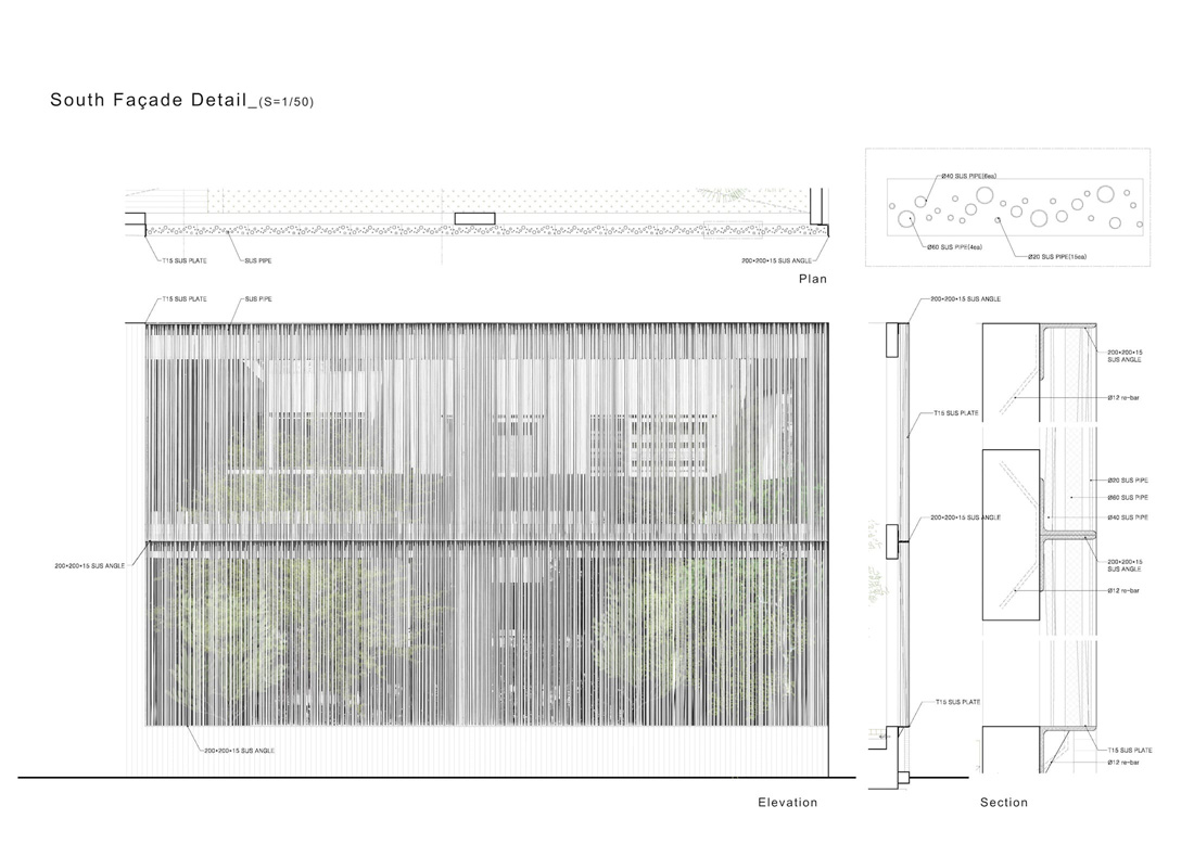 在设计面向四车道道路的南立面时,设计师试图在建立邻里联系的同时,给人营造一种隐私感。经过多次研究,“Steel Grove”以不锈钢管道的形式设计,这既营造了一种私密性,又与自然和周边环境相联系。“Steel Grove”由4种不同类型的不锈钢管组成,为了找到最稳定的平衡,它们都是经过了多次样品制作后才生产出来的。