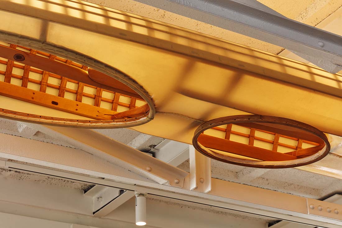 厨房中岛前,设置了一张巨大的橡木餐桌与一系列老式座椅。餐桌上方,一艘倒挂的皮划艇被屋主改造成灯具,散发出温暖的灯光照亮整个用餐空间。