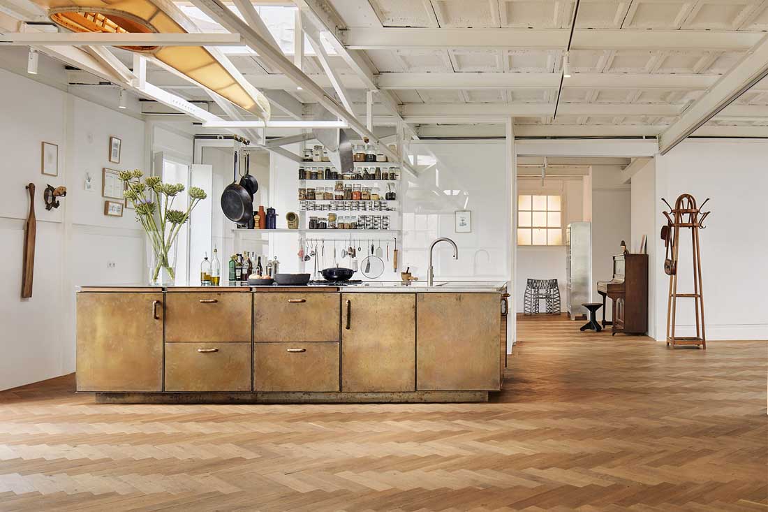 位于二层的画廊对外开放,画廊旁边,设有一个特别定制的开放式厨房。这个厨房,除了作为日常生活空间外,在展览与活动期间,还可以为画廊服务。厨房中岛经过精心的设计,完全由黄铜制作,四个侧面都设有橱柜。厨房的台面则是由不锈钢材料制成。定制的青铜把手和可拉出的木制橱柜,与厨房优雅的整体设计相得益彰。设计师利用主入口楼梯间的玻璃隔墙,辅以白色的金属框架,为厨房后部增添了充足的储物空间。