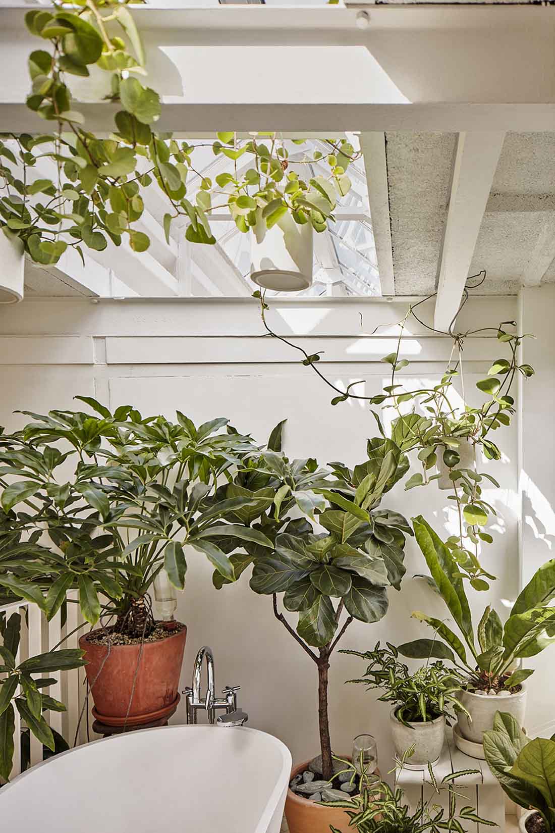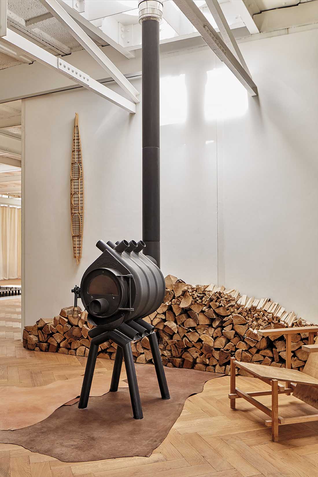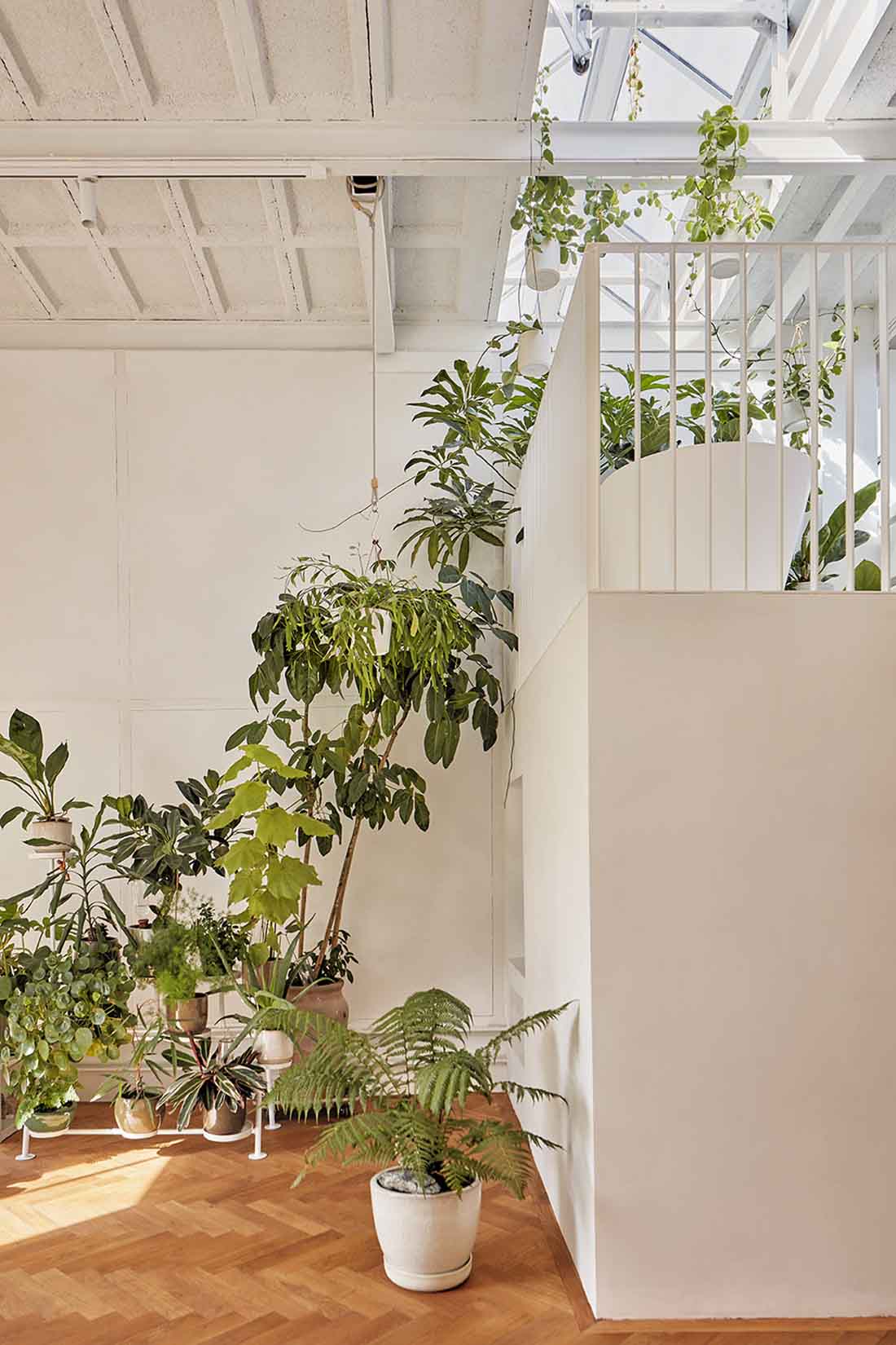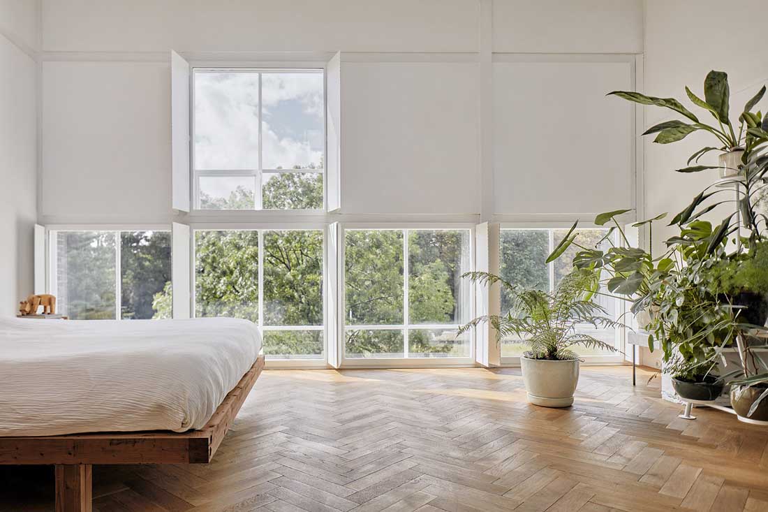 白色的工业横梁对应了质朴的人字拼花木地板,两种简单的元素相互平衡,组成和谐的景象。天花板上留有三处开口,这些开口原是为容纳工厂烟囱设置的,现在则被玻璃舷窗所取代,形成天窗。简约的白色百叶窗系统使原本的工业建筑变得更为开放宜居。屋主可以根据需要自行调节,使室内的不同区域拥有全天候的良好采光。白色墙面上的网格结构暴露出来,形成浮雕效果。通过这种设置,设计师巧妙地保留了建筑原有的工业质感,呼应了建筑的历史。