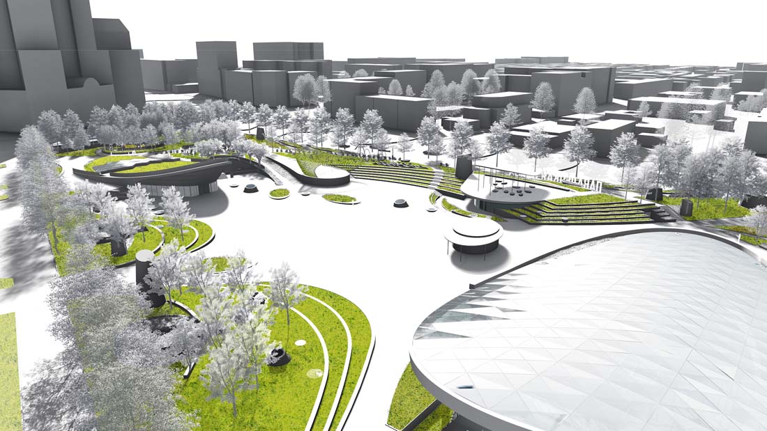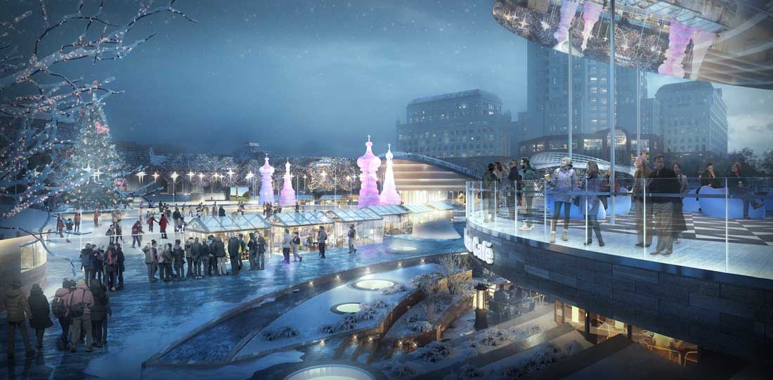 一个公园的成功离不开强劲的公共地铁和交通活动,以及精心规划和设计的公园场馆,该项目中设计的场馆自然也可以用于举办各种类型和规模的活动。多功能、灵活的中央广场上设计了表演喷泉、舞台和溜冰场,与一系列的空间和元素结合在一起,营造出全年全天候都充满活力的城市生活节奏。