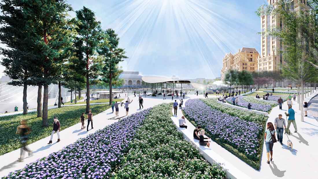 俄罗斯建筑师Alexander Krasovsky于1900年建造的具有历史意义的帕夫列茨基火车站(Paveletsky railway station),实现了将Paveletsky及周边郊区与莫斯科连接起来的宏伟愿景。其内部华丽的空间和大厅,正对着车站前方的花园广场。岁月境迁,现在的新规划道路将公园一分为二,也将标志性的车站与周围的环境分隔开来。因此,该设计旨在重建这个历史悠久的车站和环路之间失去的联系。在严格的高度限制和观景走廊规定下,精心雕琢的公园高差确保了车站和标志性零售入口之间的视觉平衡。而且,西北道路上的车辆通道也将受到限制,从而重新利用车站和广场之间的行人通道。