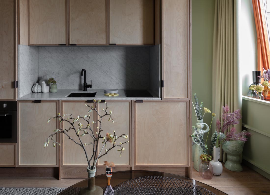 刻花的壁板细节部署在多面外墙上,封闭了建筑服务,同时突出了建筑的特色形式。房间的色调也从外部得知。苍白的鼠尾草与褪色的橙色桔梗和外墙的砖砌相辅相成,而朱红色的窗框和窗台将立面折叠到房间中。厨房也一样,展示大理石和桦木层的细节,配以铜拉手,烟熏玻璃和钢制器具。