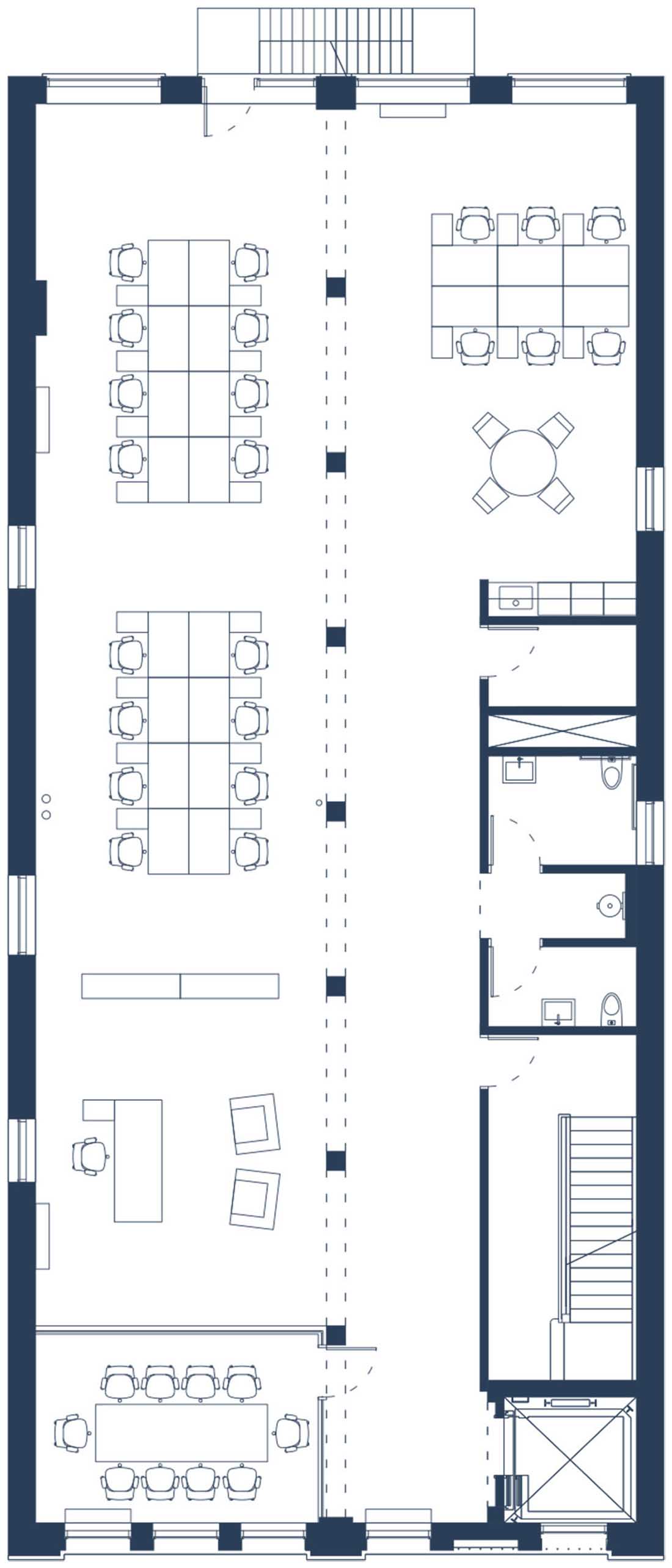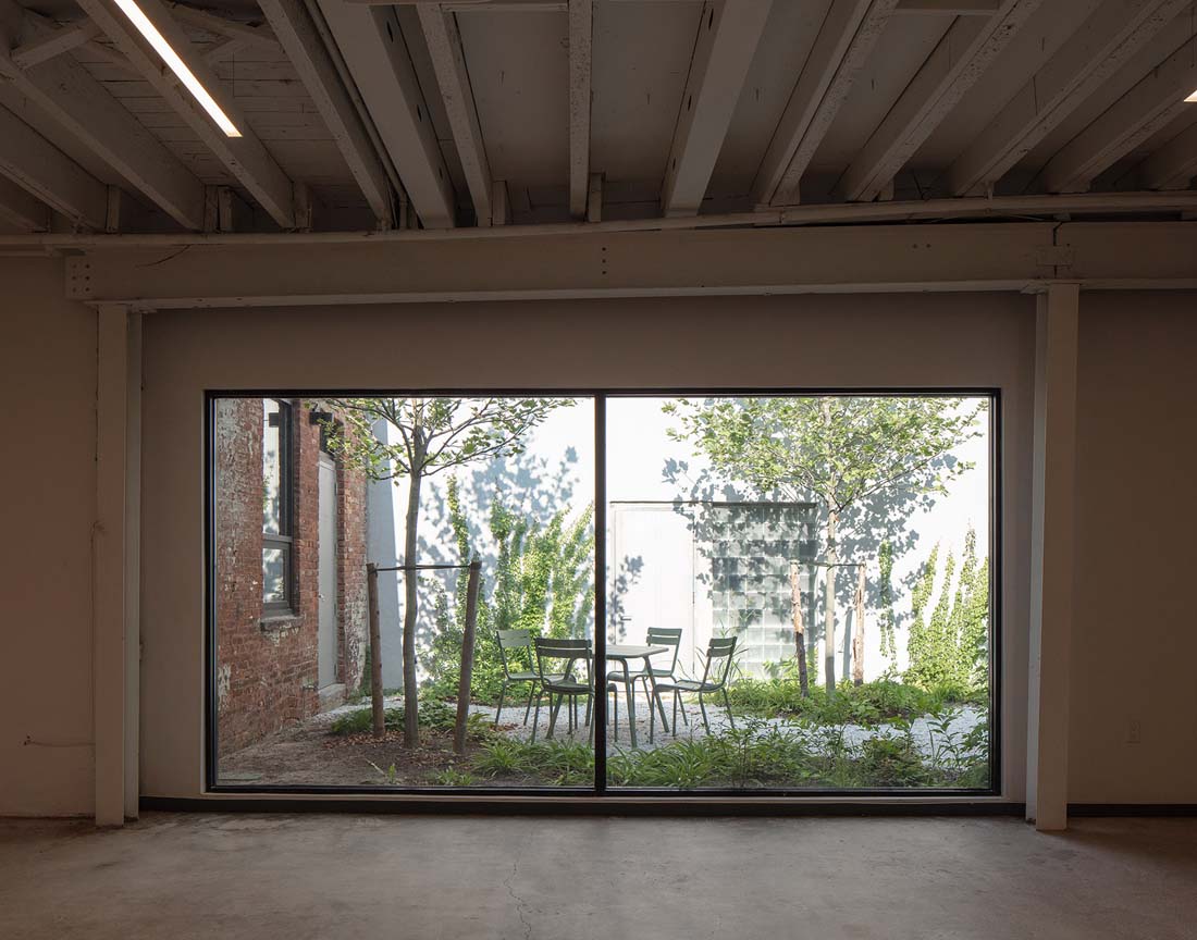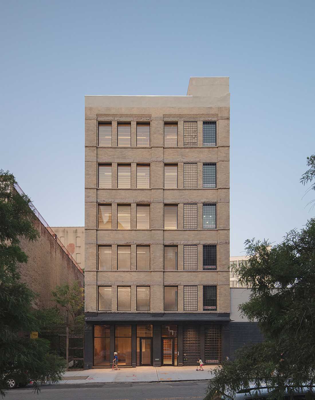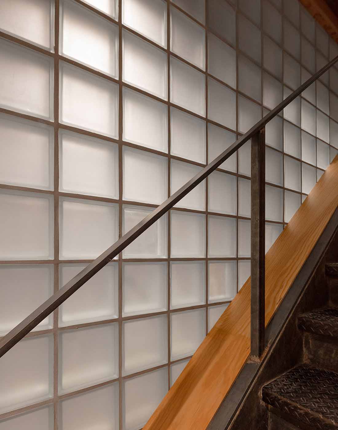 项目的首层由大型艺术家工作室与摄影棚组成。通过拆除砌筑墙体,设计师还原了三个单层建筑立面的店面式门头,这不仅为其在公园大道一侧渲染出强烈的视觉效果,同时将大量自然光线引入内部的艺术家与摄影师工作室中。位于转角的工作室,则是通过一扇大型玻璃砖组成的高窗进行采光。白天,阳光透过玻璃砖在室内形成自然的漫反射。夜晚,室内的光线透出来,宛如一盏灯笼,激活了整个转角空间。