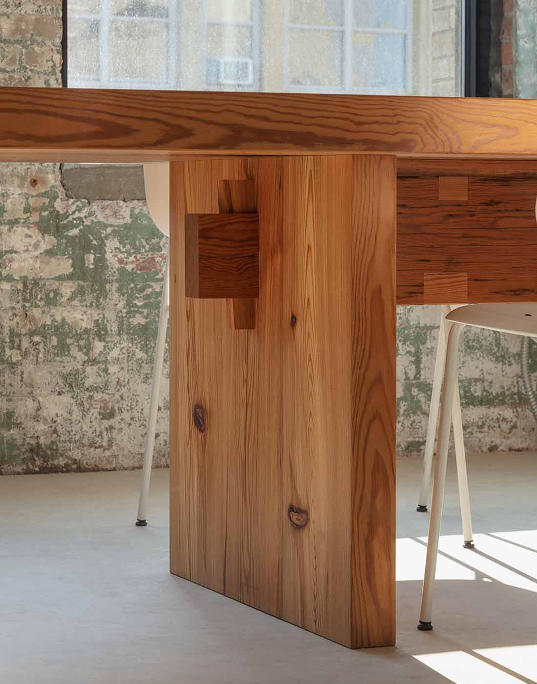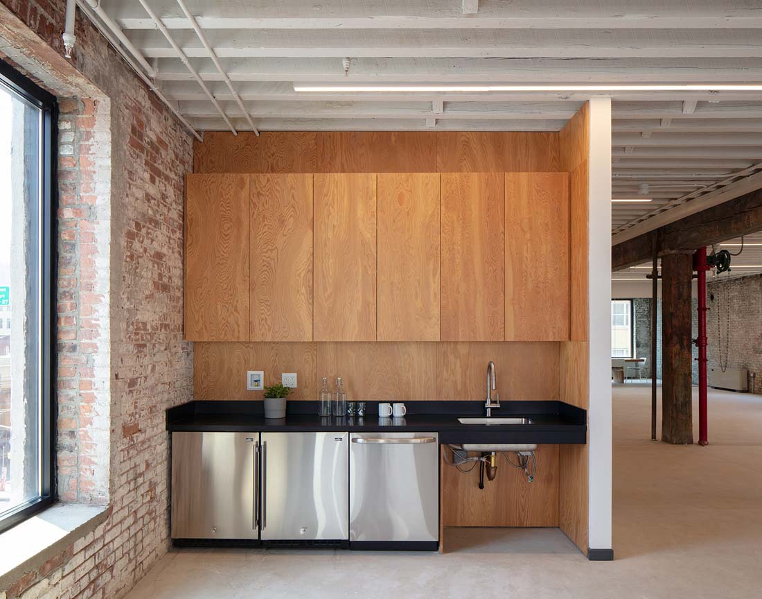 保留历史元素的设计理念同样延伸到六层厂房的内部。压纹金属地面,未剖光的钢制栏杆和门,以及混凝土地板,呼应了古老的布鲁克林工厂固有的,粗糙,采用的工业特性。除此之外,回收利用地板托梁的剩余木材,为项目定制了会议桌与大厅的长椅。富有纹理感的老旧漆面砖墙被清洁一新,在经过进一步的清洁与美缝处理后,与混凝土地板以及白色内墙一起形成和谐统一的色调。