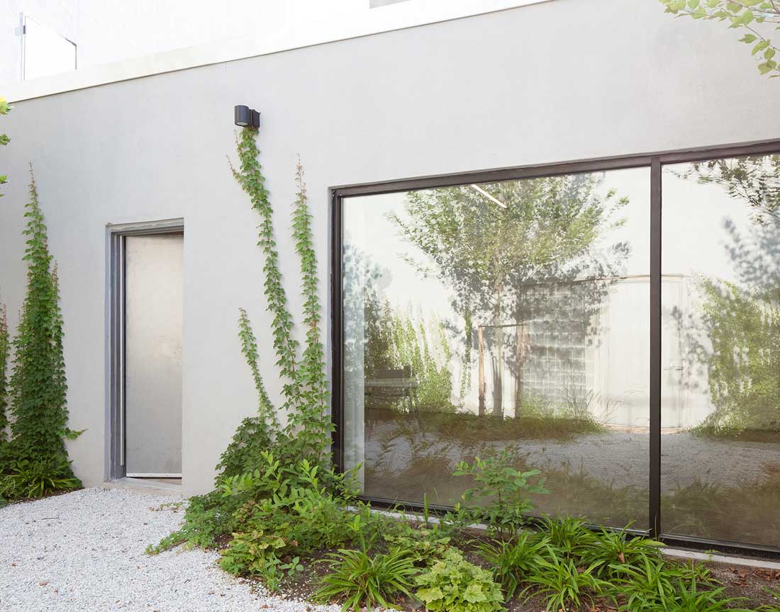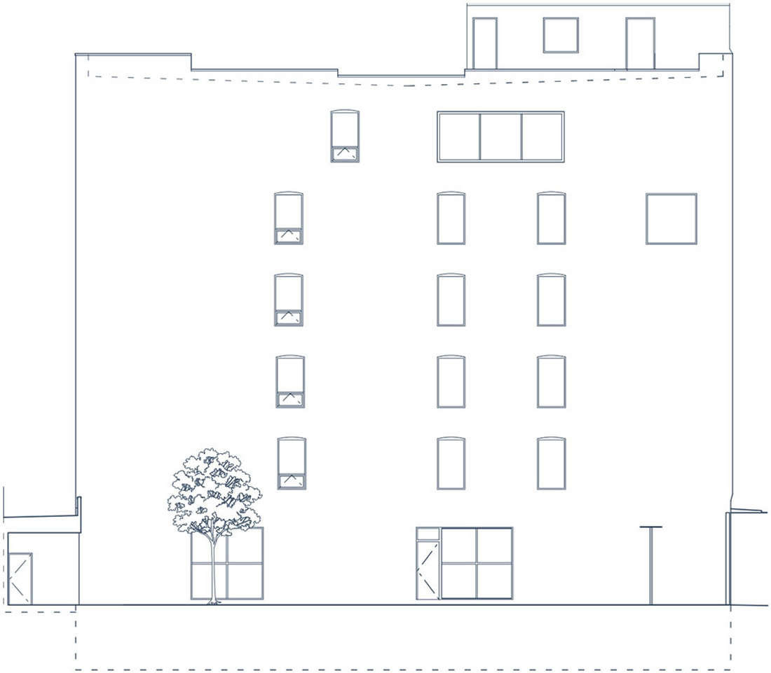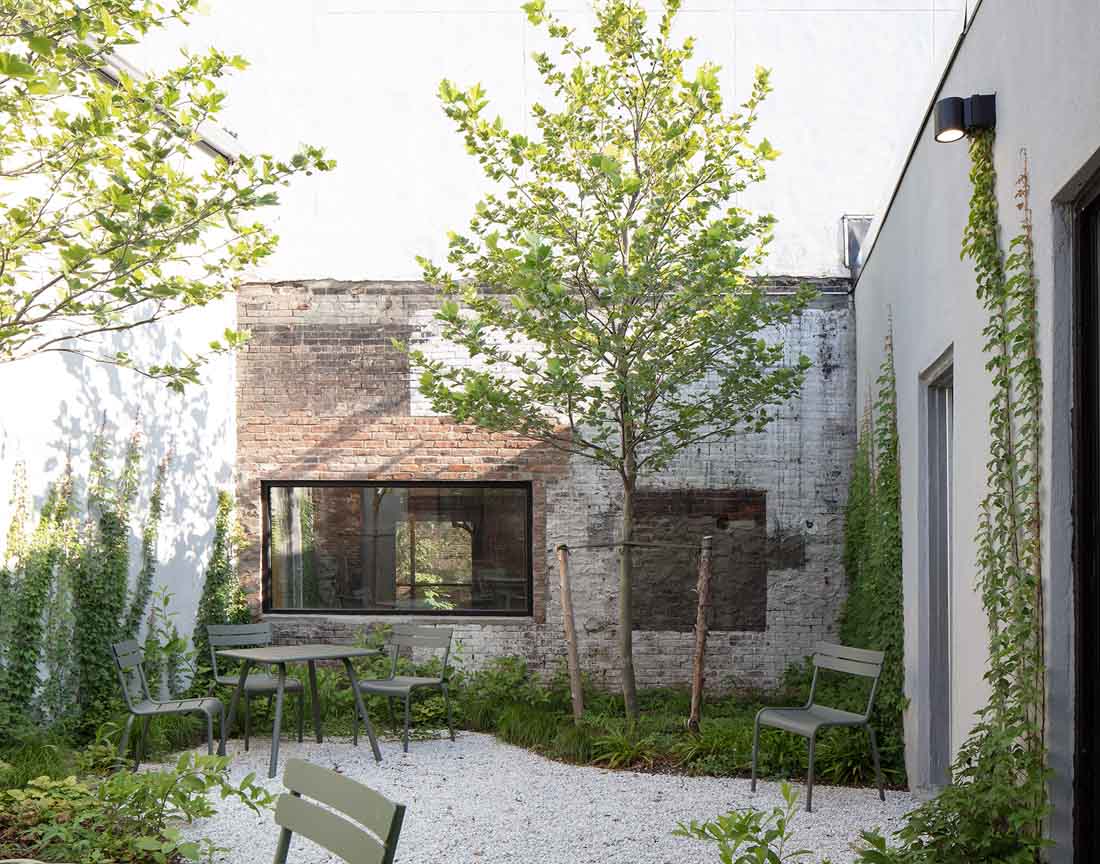尊重场地历史背景,并致力于将历史元素融入到设计中去,这种理念在本项目中体现得淋漓尽致。从街道上可以看到,花园中原有的黄色木门与建筑外立面的砖墙都被保留了下来,这些历史元素揭示了建筑的过去。花园里的长凳由三根坚实的橡木原木制成,让人们联想到附近的布鲁克林海军造船厂。这三根原木,是一个造船商在过去十年里从纽约、马萨诸塞和新罕布什尔地区收集来的,通常用来翻新船只,现在则被制作成了长凳。