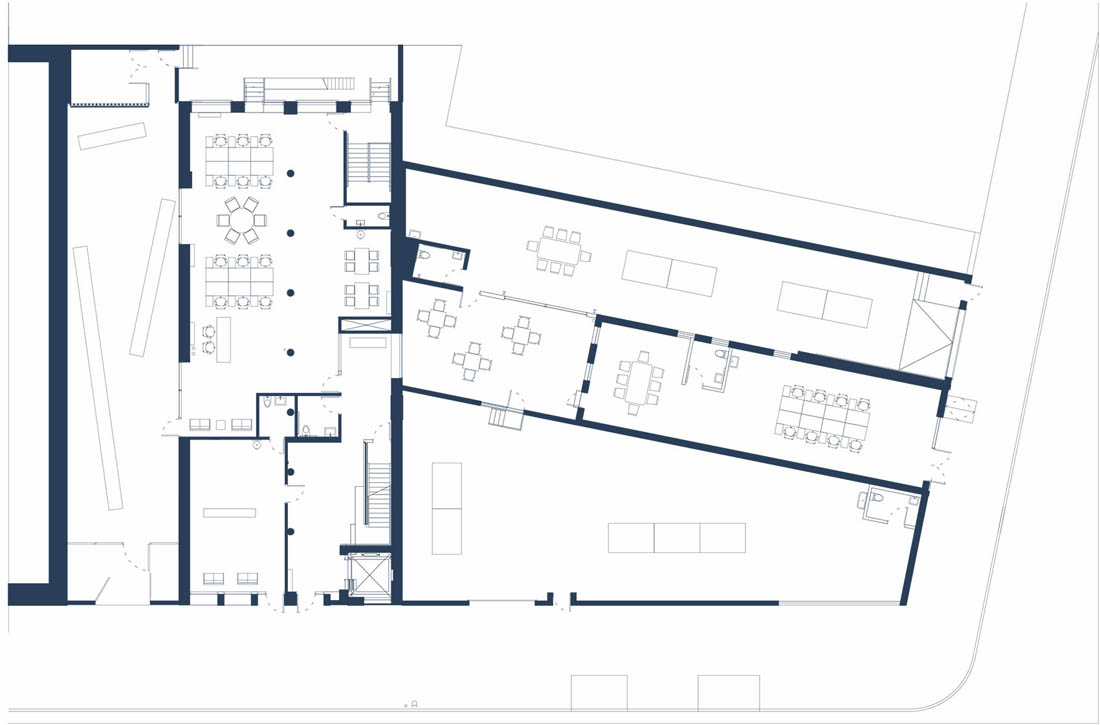 场地中央,六层的厂房成为整个建筑群的中心。厂房的右侧,即南端,是三个由中央庭院连接的单层建筑。建筑师拆除了原有建筑的一部分楼板,将其改造成中央庭院。除此之外,设计师将厂房左侧的车库,改造成郁郁葱葱的花园以及一个供租户使用的自行车停车场。项目内所有建筑的首层外立面都被漆成了深蓝色,形成了统一的审美效果与建筑风格。