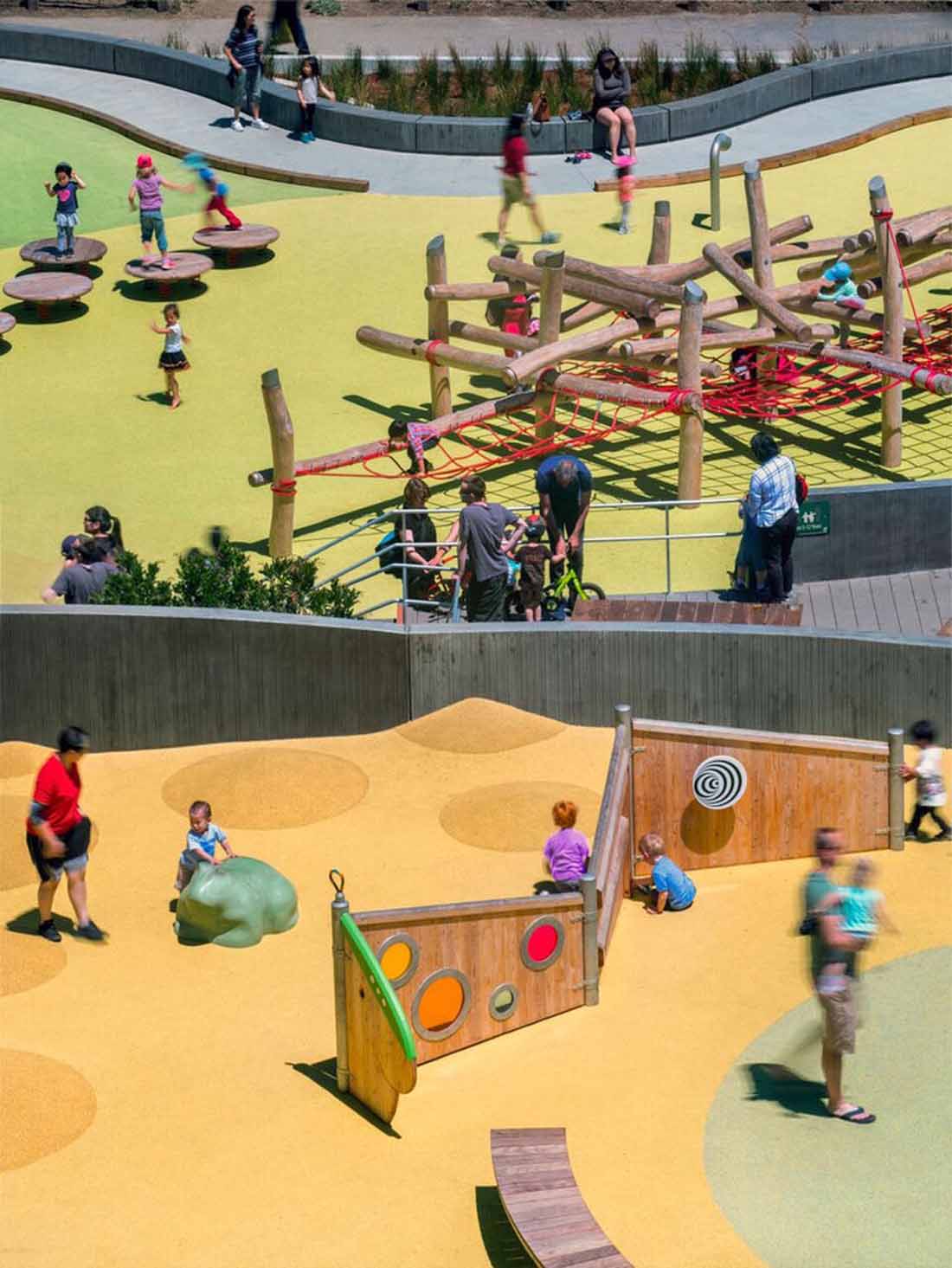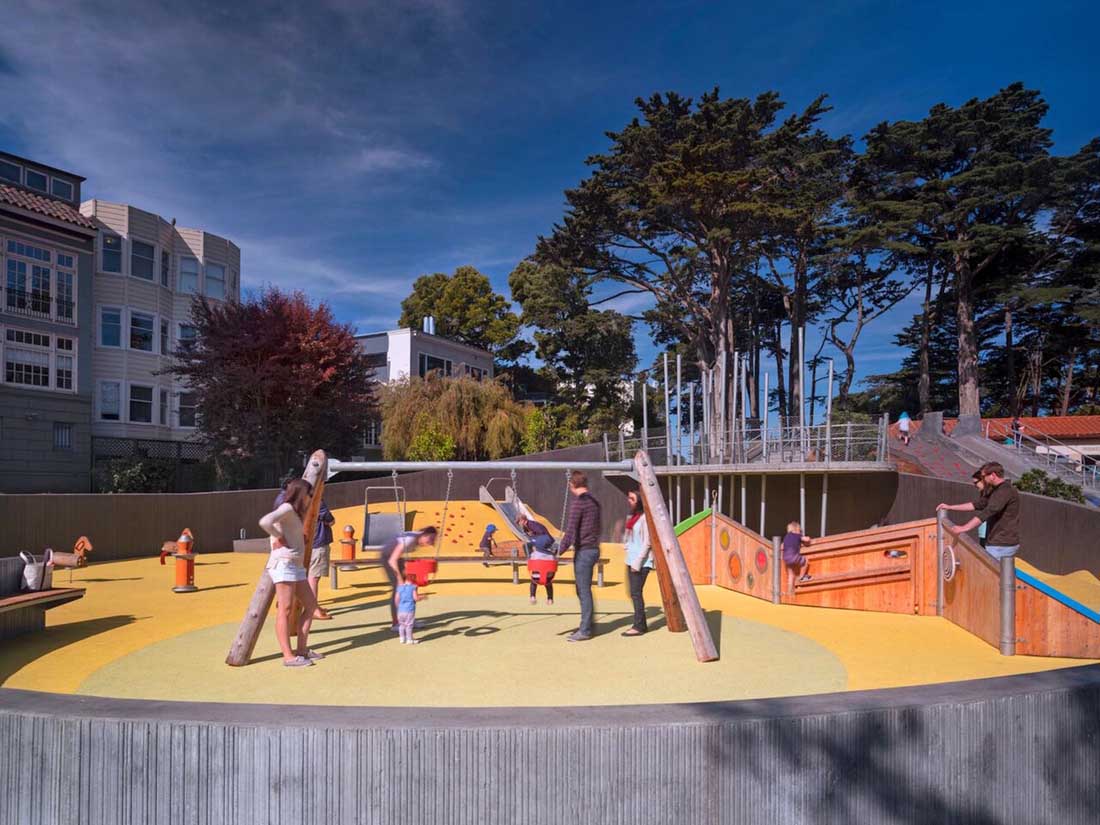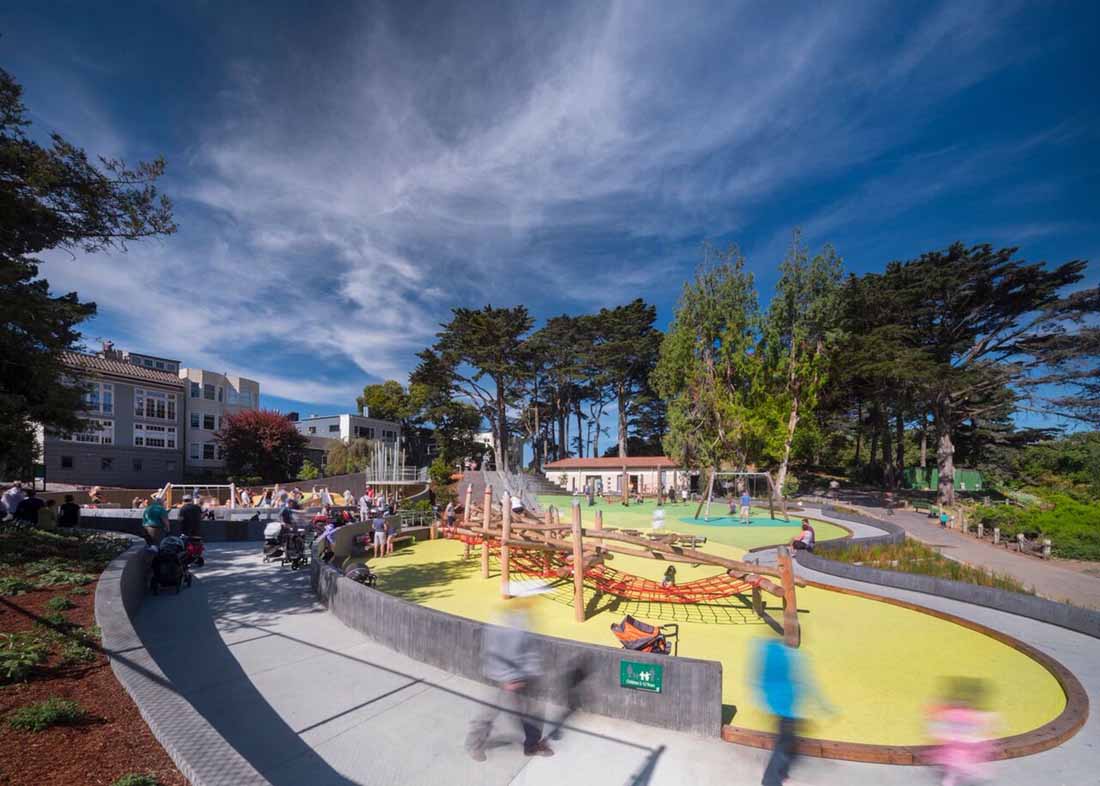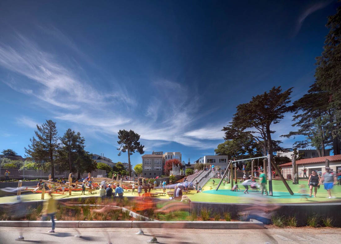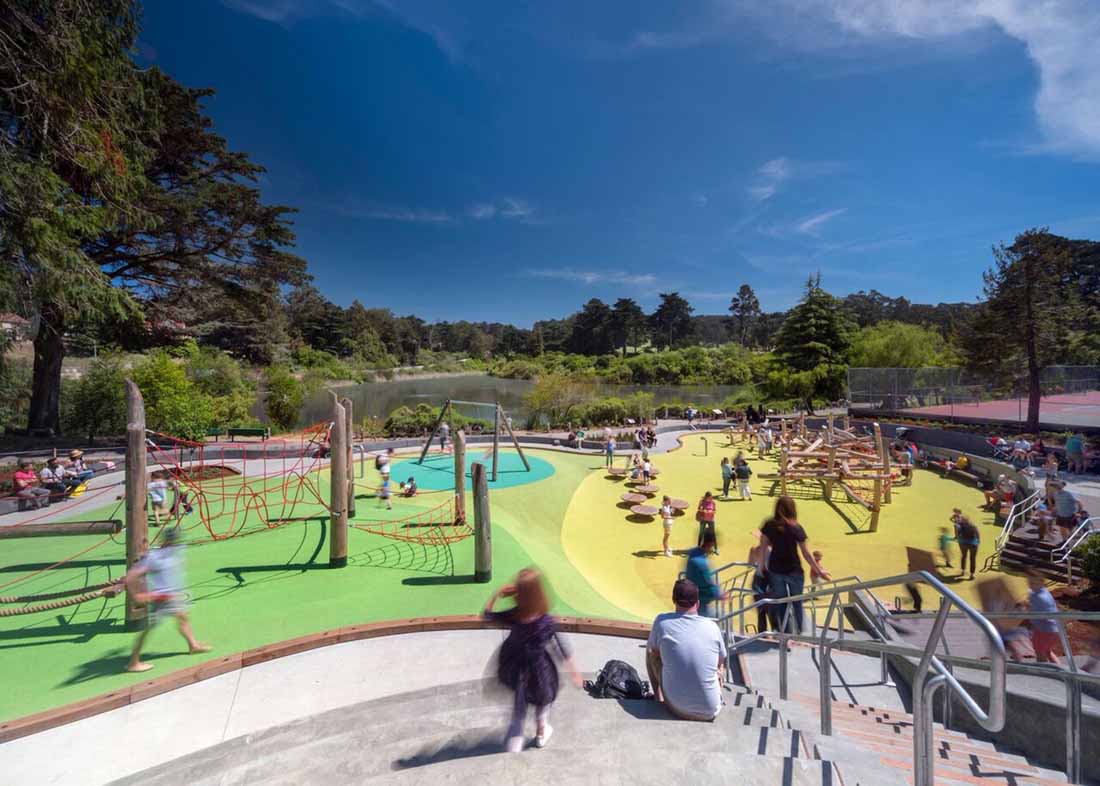 Mountain Lake Park Playground 藏在旧金山里士满区一排爱德华时期的房屋后面,坐落在成熟的常绿乔木之中,缓缓向下倾斜到Presidio国家公园南部边缘的Mountain Lake岸边。新设计可以在这种情况下无缝运行,给人一种操场一直都在那儿的感觉。