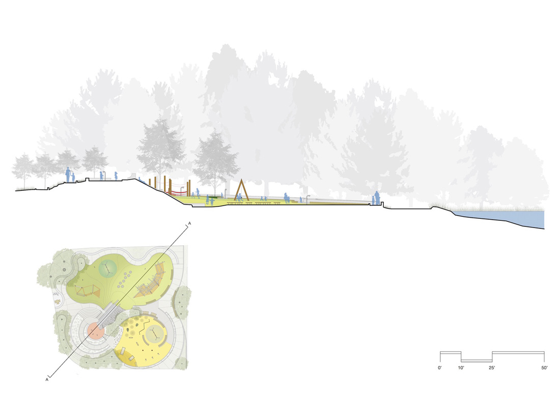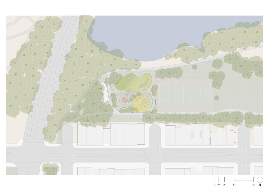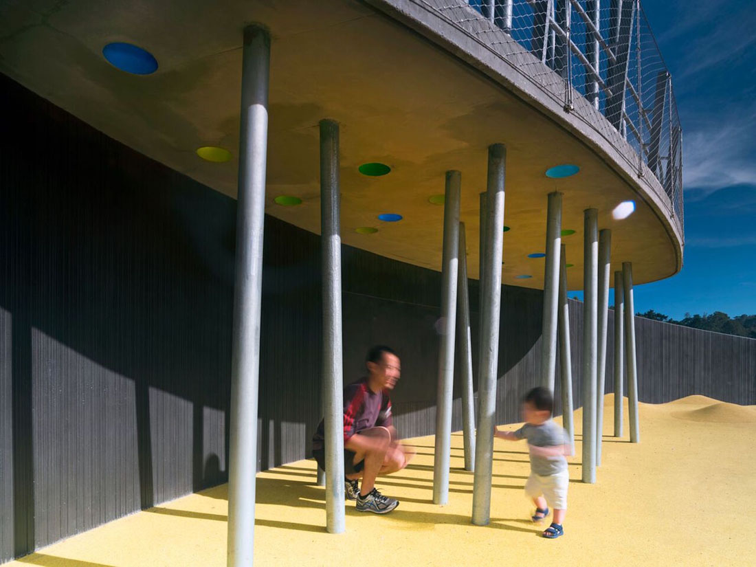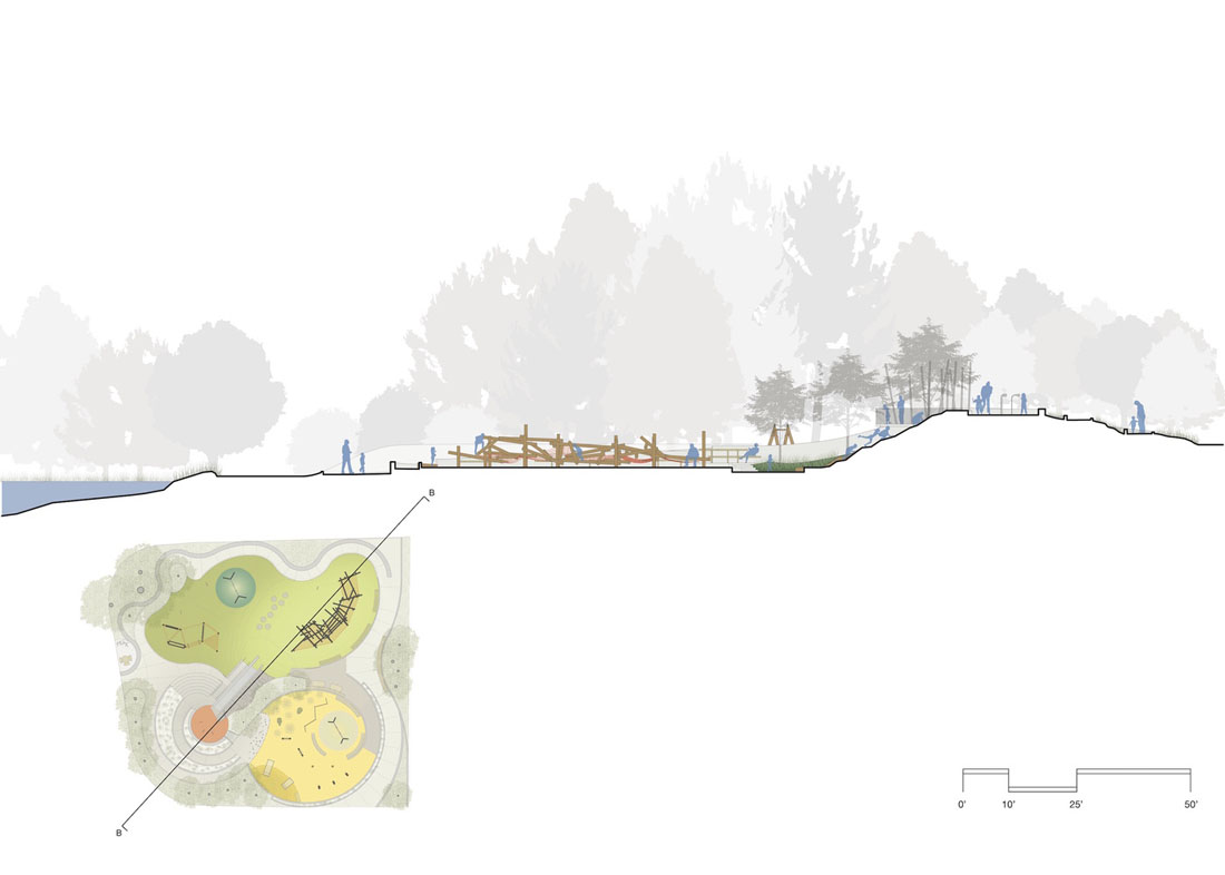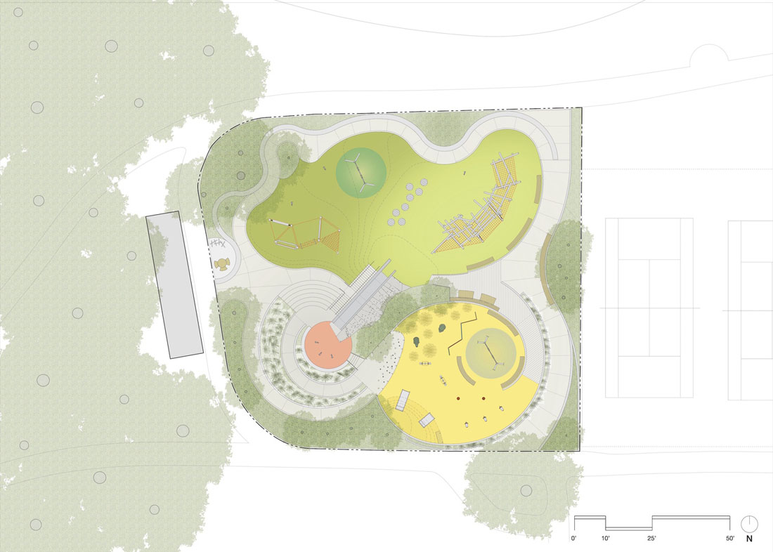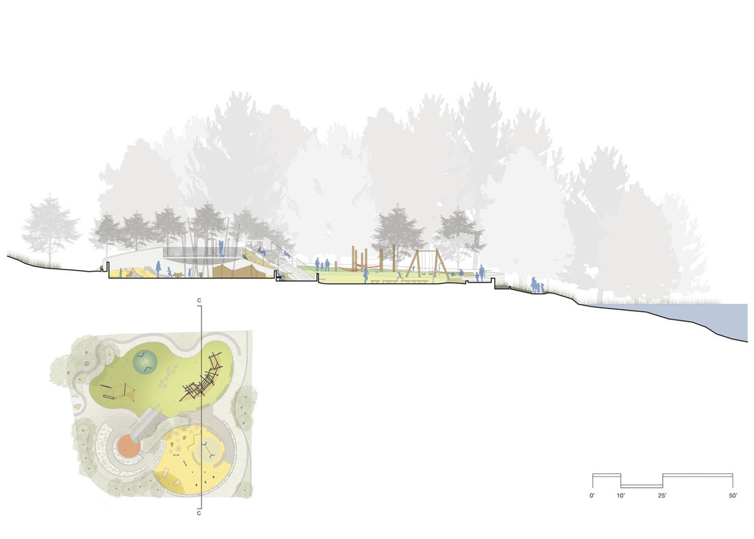 翻新后的游乐场充分利用了场地的地形,在露台上设有单独的游乐区,根据年龄和游乐能力进行组织,并通过一系列蜿蜒的小路连接在一起,为整个游乐场(包括滑道的顶部)提供了一条通行的路线。操场的核心部分是一块珍贵的混凝土滑梯,沿着大土墩的侧面层叠下来,被保存下来,将更新后的操场固定在社区过去的美好回忆中。在到达幻灯片顶部的途中,一个观察平台坐落在由钢柱林组成的森林中,让人联想起周围公园的树木。该平台可俯瞰下方的学前区,同时可欣赏Mountain Lake的广阔美景。