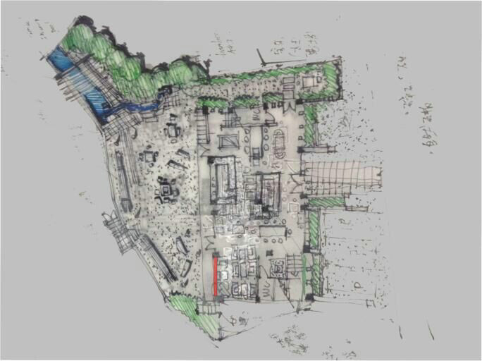 此墙所处的空间位置原来的功能是:为住客提供一个集电视、影片、聚会和演讲为一体的公共场所。所以在早期设计的时候考虑到遮蔽阳光,给予投影和电视更好的一个体验空间。但是在具体的设计中,我们也考虑在此有开窗,但是最终在施工过程中没有被采纳。