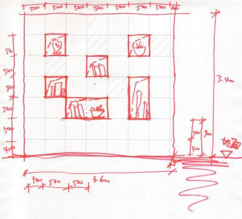 墙的尺寸是3.4 m*3.6m,横向和竖向都是7个模块格。我们尝试各种的摆放形式,然后再考虑这种摆放形式产生的影响和效果。